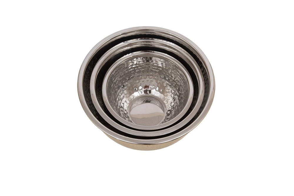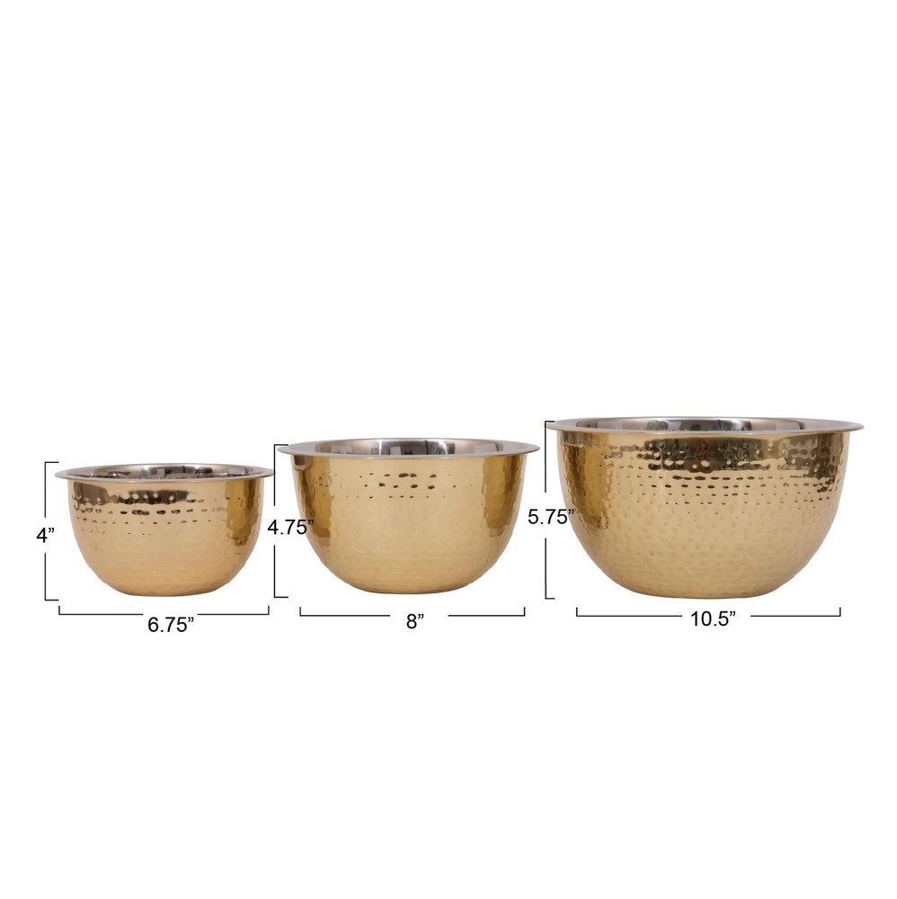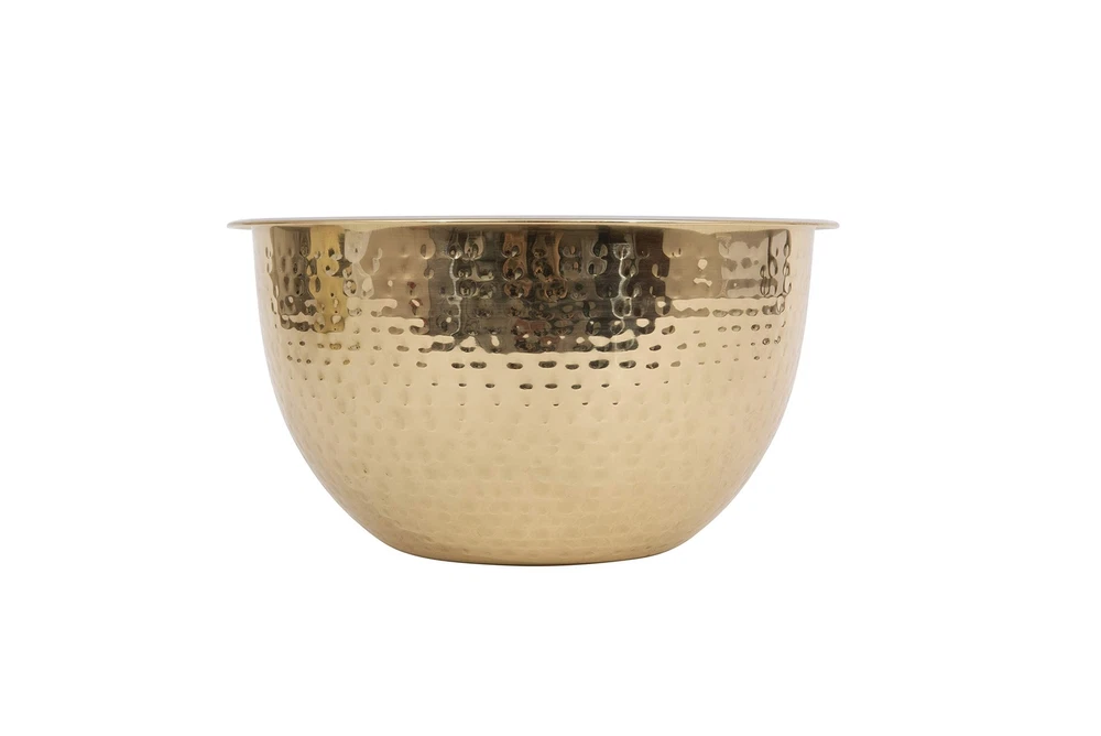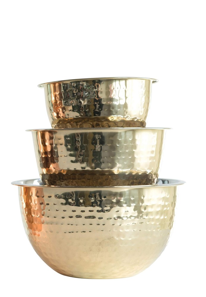 Creative Co-Op Hammered Stainless Steel Bowls in Gold Finish (Set of 3 Sizes) Product Details Bowl Material: Stainless Steel Number of Pieces: 3 Brand: Creative Co-Op Color: Gold Style: Bowls Bowl Material: Stainless Steel Number of Pieces: 3 Brand: Creative Co-Op Color: Gold Style: Bowls Special Feature: Hammered Shape: Round Capacity: 12 ounces Specific Uses For Product: Salad Included Components: Spoon Pattern: Solid Product Care Instructions: Hand Wash Only Is Dishwasher Safe: Yes Is Microwaveable: No Material: Stainless Steel Product Dimensions: 10"W x 5.75"H Global Trade Identification Number: 98 Manufacturer: Creative Co-Op UPC: 191009157298 Item Weight: 15 ounces Country of Origin: India Item model number: DA9824 Batteries required: No This classically designed set of serving or mixing bowls features a hand-hammered texture and glistening gold finish Fill with popcorn, toss a salad, or simply use each piece as a stylish mixing bowl Food safe; Hand wash only Made from 100% stainless steel Bowls measure 6.75 inches diameter x 4 inches H, 8 inches diameter x 4.75 inches H, 10.5 inches diameter x 5.75 inches H Large: 10.5"L x 10.5"W x 5.75"H Steam, simmer, and sizzle in style with our thoughtfully crafted collection of cookware and bakeware. Explore a wide array of pieces that are both fashionable and functional including measuring cups, measuring spoons, bake pans, crocks, mixing bowls, batter bowls, berry baskets, scoops, strainers, spreaders, and so much more. Choose from a vast selection of materials from wood and steel to stoneware and glass, and styles from classic farmhouse and mid-century modern to vintage glam and southwestern. Add a touch of beauty to meal prep or holiday baking with this carefully curated collection of kitchen wares that are sure to impress.