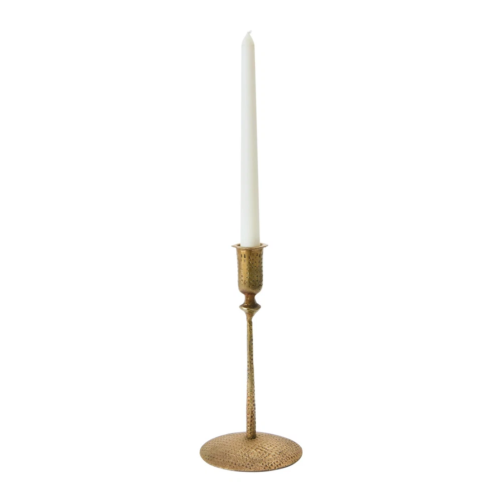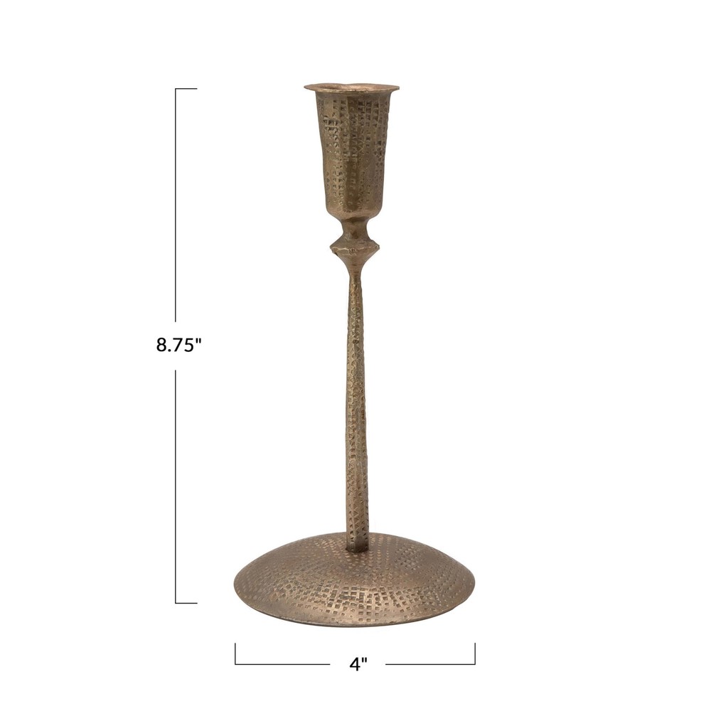 This decorative hand-forged hammered metal taper holder has an antique brass finish. It is sturdy and handsomely designed with intricately detailed impressions. Display with similar complementary pieces or expand creativity with a mix of varying candle holders. Decorative hand-forged hammered metal taper candle holder with an antique brass finish Stunning hammered metal with an antique brass finish A handsomely, eclectic taper candle holder. A gorgeous piece for your living room, dining room, or bedroom Holds standard wax or LED taper candle. Wipe taper holder with a clean, dry cloth 4" Round x 8.75"H