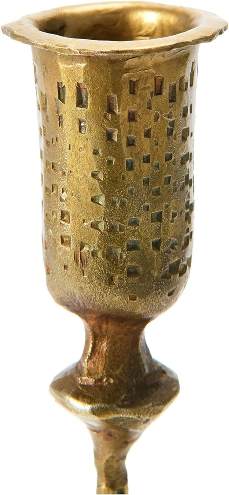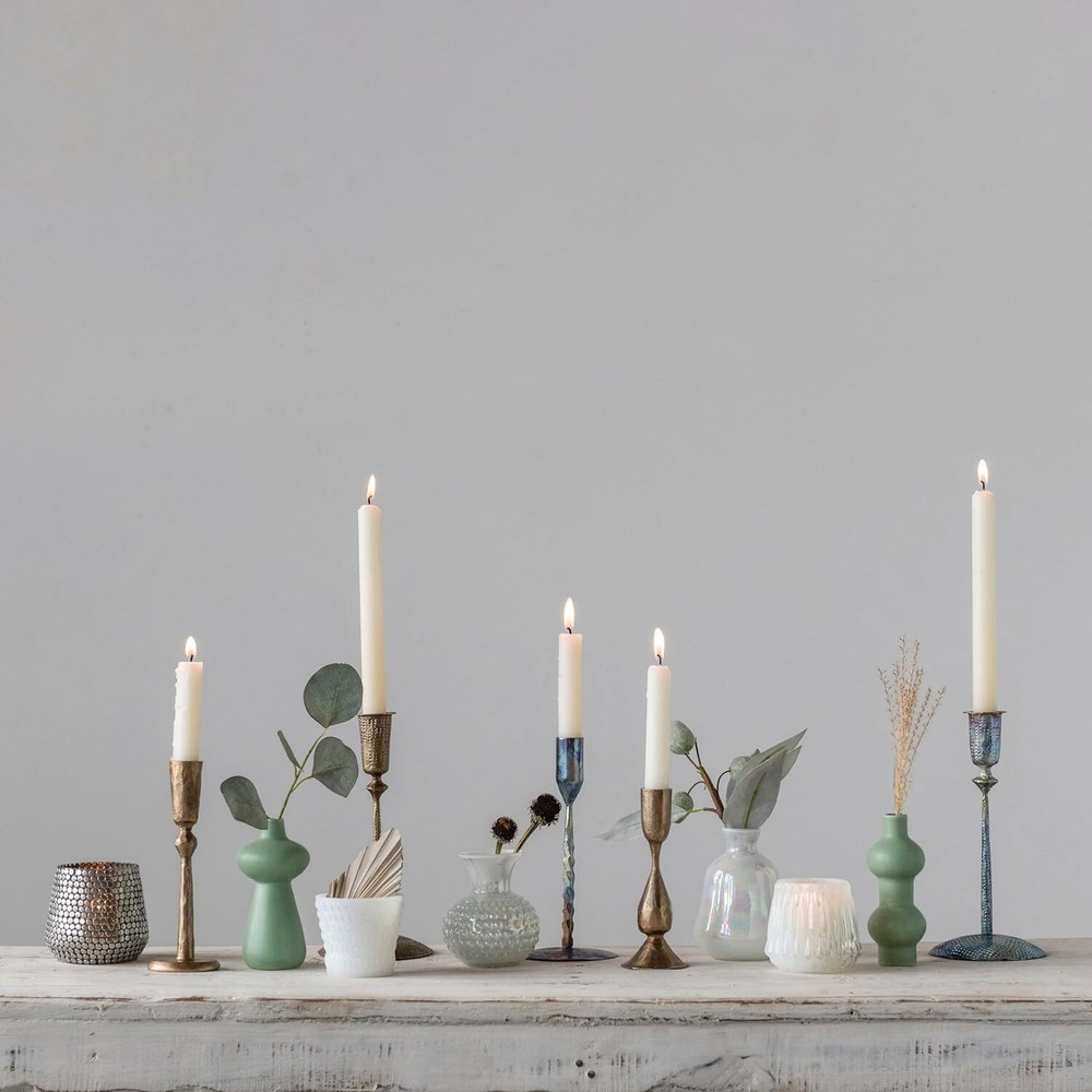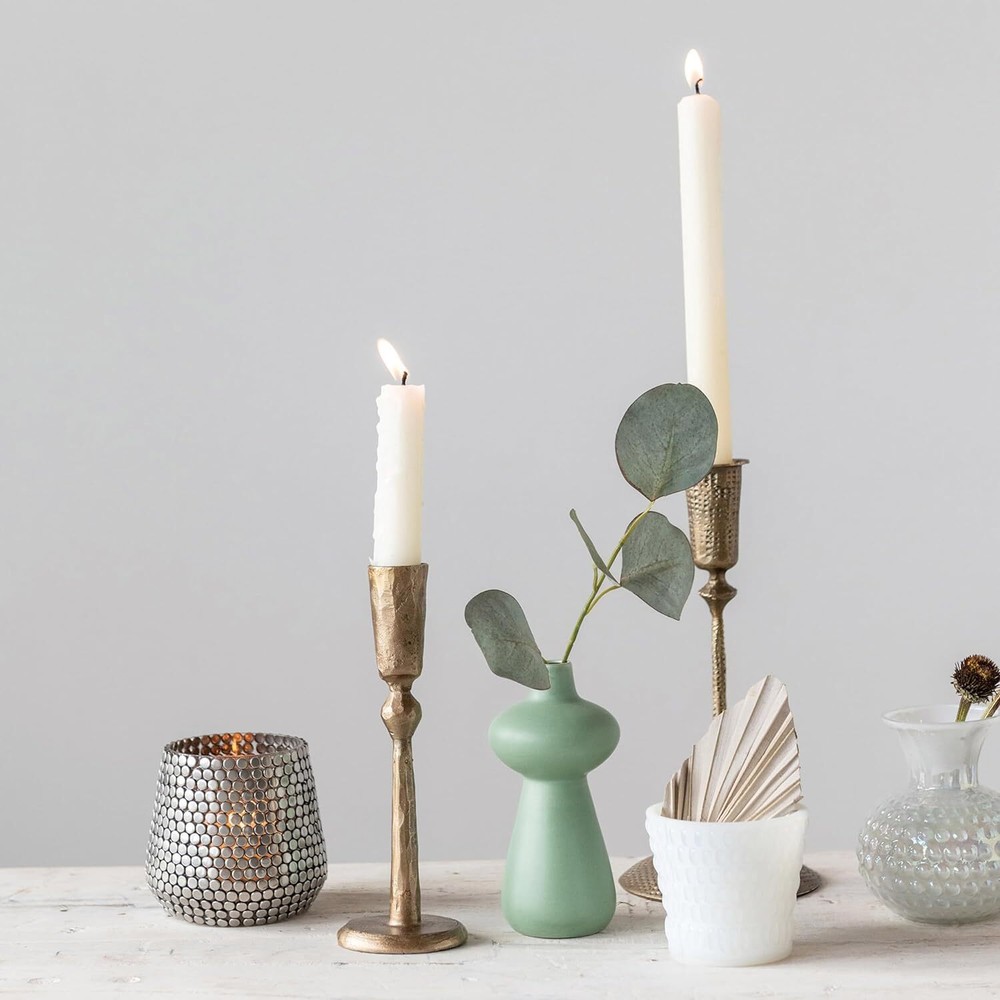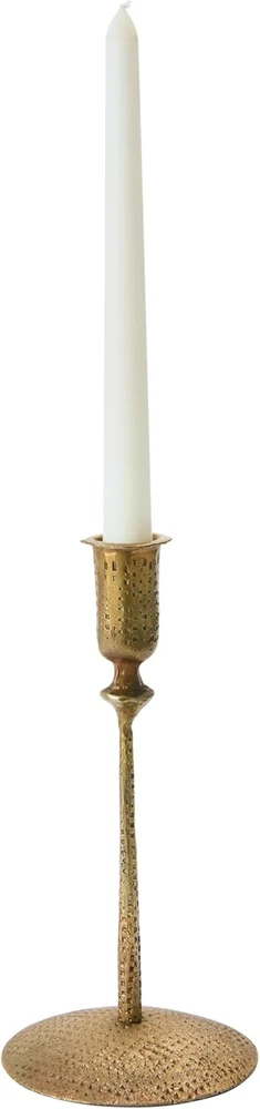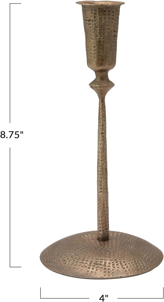 Creative Co-Op Hand-Forged Hammered Metal Taper, Antique Brass Finish Product Details Color: Brass Material: Brass, Metal Brand: Creative Co-Op Product Dimensions: 4"L x 4"W x 8.75"H Finish Type: Metal Item Weight: 0.3 Kilograms Number of Pieces: 1 Theme: Wedding Item Diameter: 4 Inches Mounting Type: Tabletop Manufacturer: Creative Co-Op UPC: 191009382140 Item Weight: 10.5 ounces Country of Origin: India Item model number: DF4415 Volume: 1 Milliliters Finish types: Metal Assembly required: No Batteries required: No Decorative hand-forged hammered metal taper candle holder with an antique brass finish Stunning hammered metal with an antique brass finish A handsomely, eclectic taper candle holder. A gorgeous piece for your living room, dining room, or bedroom Holds standard wax or LED taper candle. Wipe taper holder with a clean, dry cloth 4" Round x 8.75"H This decorative hand-forged hammered metal taper holder has an antique brass finish. It is sturdy and handsomely designed with intricately detailed impressions. Display with similar complementary pieces or expand creativity with a mix of varying candle holders.