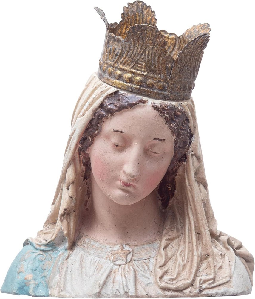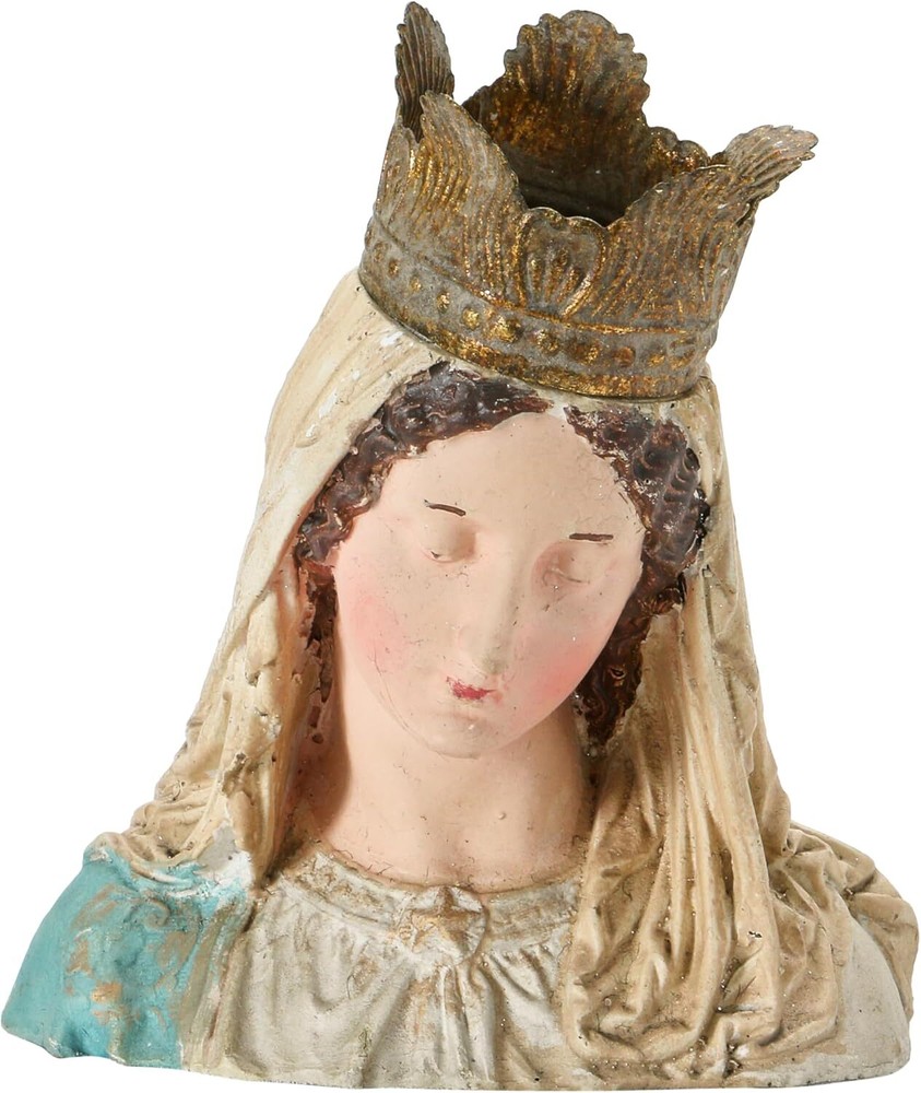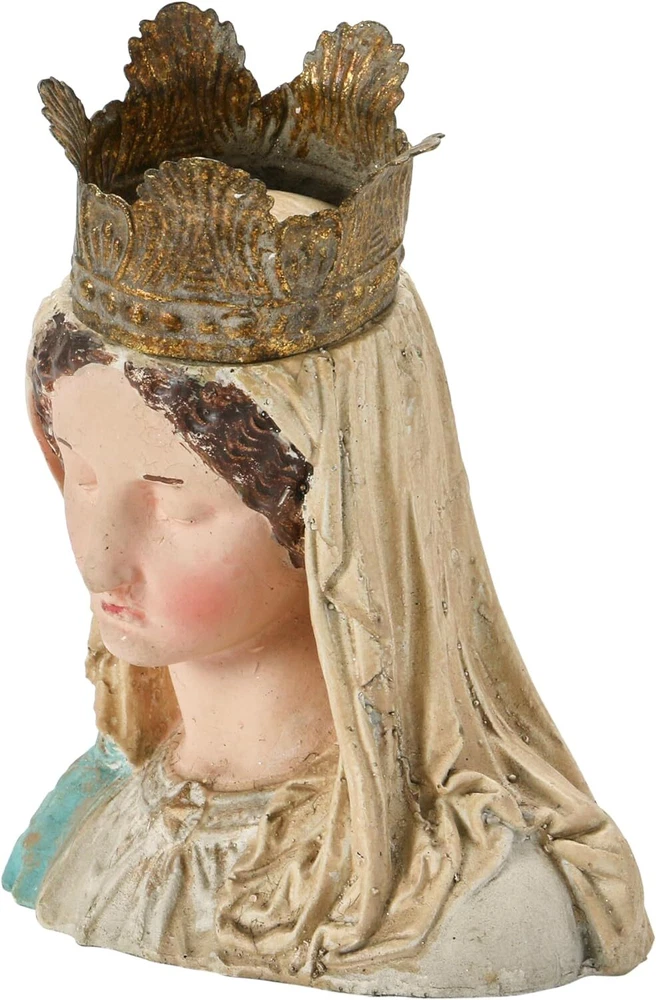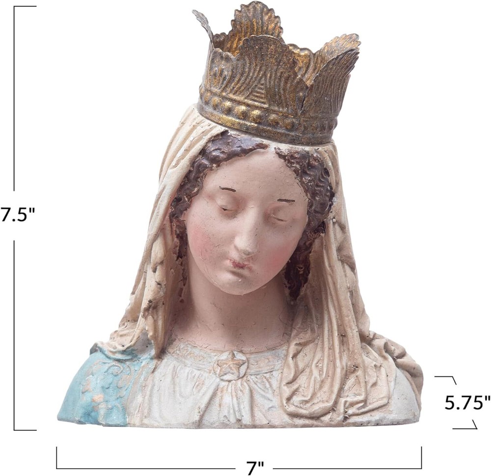 Creative Co-Op Hand-Painted Magnesia Vintage Reproduction Virgin Mary Bust with Removable Crown Decor, Multi Color Product Details Product Dimensions: 6.88 x 5.75 x 7.63 inches Item Weight: 1.87 pounds Department: Unisex Manufacturer: Creative Co-Op Country of Origin: China Item model number: DF4116 Finish types: Painted Care instructions: Wipe Clean Assembly required: No Number of pieces: 1 Batteries required: No Hand-painted, this magnesia ornament of the Virgin Mary perfectly accents any faith-filled home's Christmas tree Made out of magnesia Crown is removable Perfect for a religious home 7"L x 5-3/4"W x 7-1/2"H This ornament is perfect for any religious home to put on their Christmas tree. Hand painted, this magnesia vintage reproduction Virgin Mary perfect accents any Christmas tree. Also has a crown that is removable