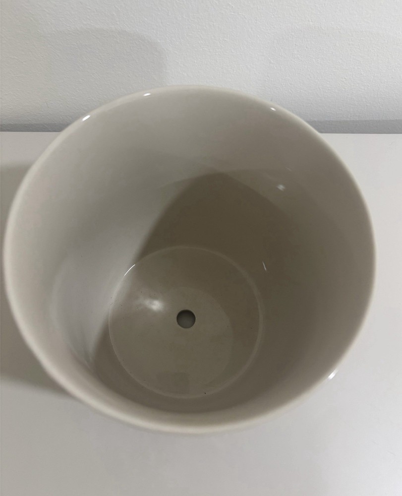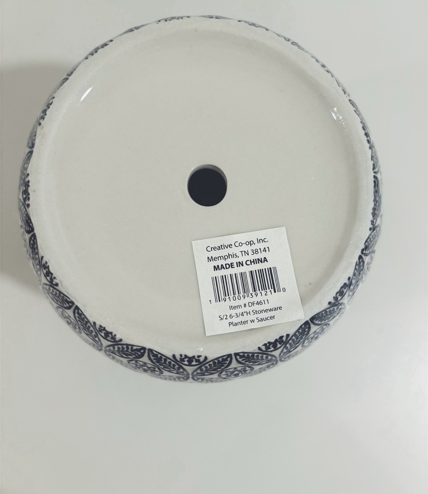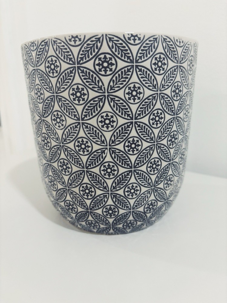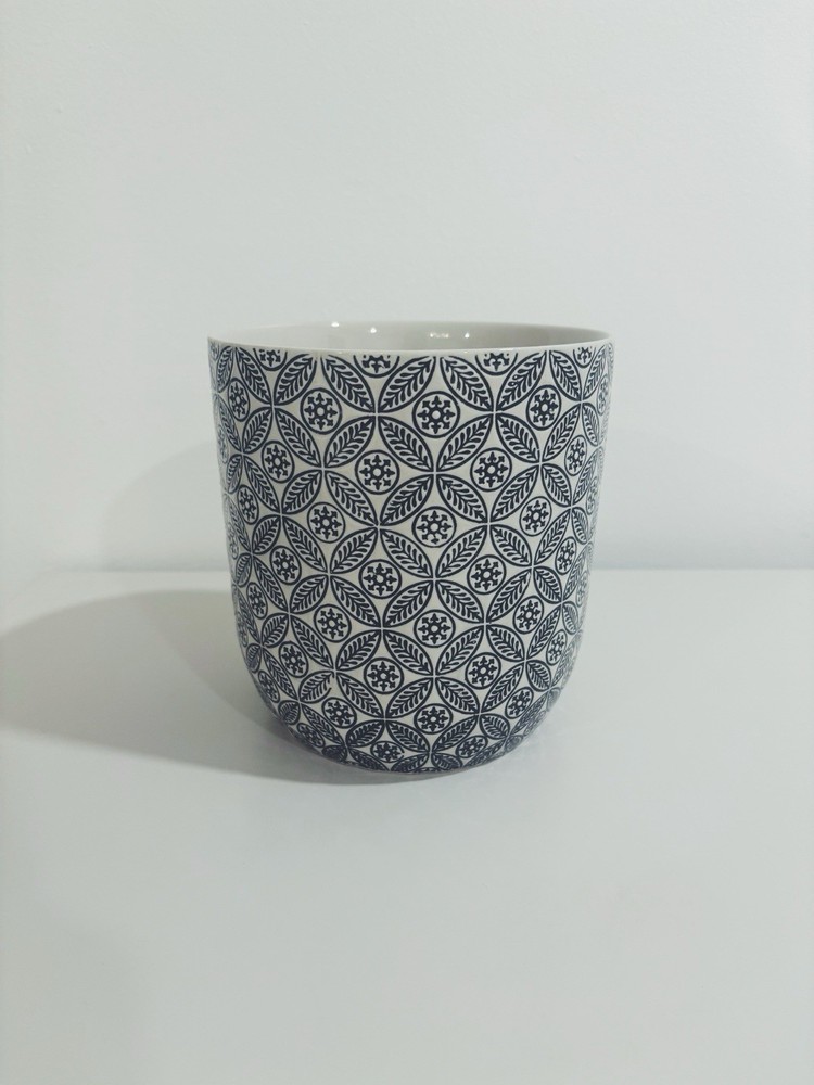 Hand stamped stoneware pot with intricate debossed pattern Stoneware has a cream finish with slightly distressed black debossed detail Planter holds a 5" pot 6" Round x 6.75"H