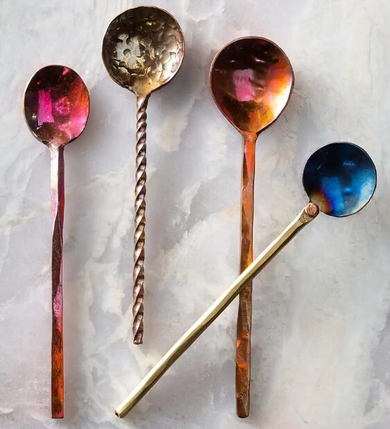 Hand-forged in India, these unique and varied copper spoons can be used for serving sauces to mixing cocktails Each beautifully made spoon has individual details that makes each one unique and a one-of-a-kind treasure These make perfect hostess gift for the distinguished foodie as they arrive in a gift-able muslin bag Not only are they food safe so you can use them for serving but they also make beautiful bath accessories- think bath salt dispenser A perfect gift for someone who appreciates a handcrafted touch Hand wash