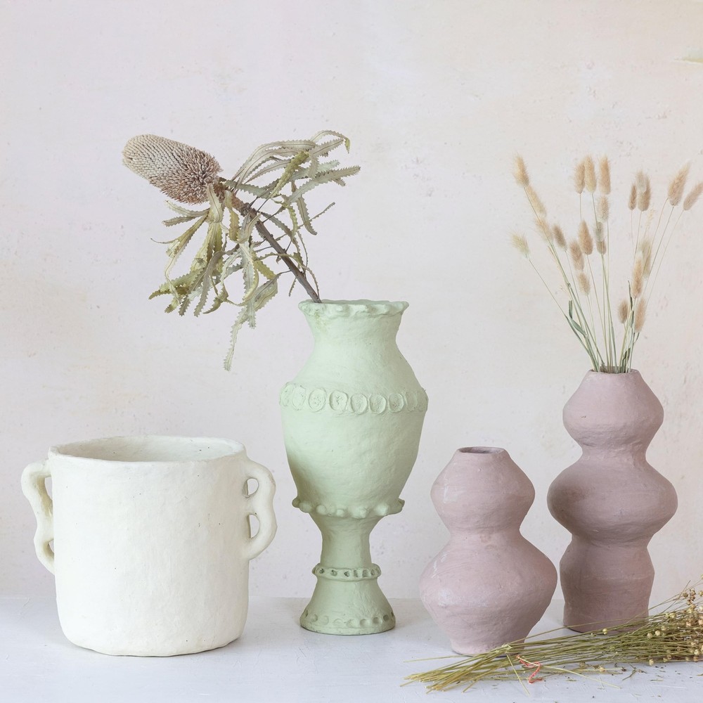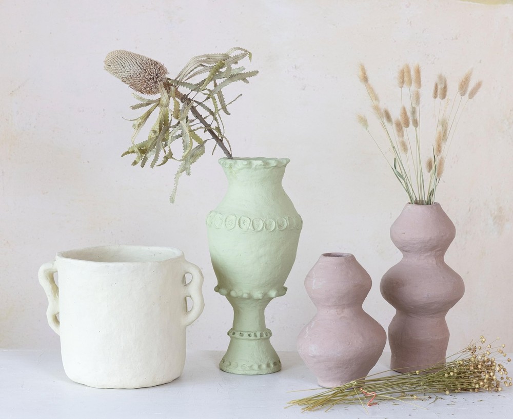 Creative Co-Op Handmade Paper Mâché Vase with Embossed and Debossed Design, Mint Product Details Material: Paper Color: Mint Brand: Creative Co-Op Product Dimensions: 9"L x 9"W x 17"H Shape: Round Material: Paper Color: Mint Brand: Creative Co-Op Product Dimensions: 9"L x 9"W x 17"H Shape: Round Style: Farmhouse Special Feature: Durable Pattern: Geometric Theme: Botanical Recommended Uses For Product: Decorative Room Type: Living Room, Bedroom Finish Type: Hand Painted Number of Pieces: 1 Occasion: Women, Mother's Day, Wedding, Graduation Item Weight: 4.84 Pounds Installation Type: Freestanding Mounting Type: Table UPC: 191009625629 Manufacturer: Creative Co-Op Item Weight: 4.84 pounds Country of Origin: India Item model number: DF8962 Finish types: Hand Painted Batteries required: No Shape: Round, this vase has a diameter of 9 inches and a height of 17 inches Material: Made of paper mache, providing durability and ease of cleaning Color: Mint, adding a fresh and soothing look to any space Design: Embossed and debossed, creating a textured and dimensional effect Use: Can be used as a decorative accent or to hold dried or artificial flowers, plants, or branches Style: Versatile, suitable for farmhouse, French country, boho, global, or modern styles Weight: 4.84 pounds, making it stable and easy to place This handmade paper mâché vase, featuring a mint color and embossed and debossed design, is a creative and beautiful home accessory. Made from paper pulp and glue, it has a round shape with a wide opening and a textured, dimensional effect. The mint color adds a fresh and soothing look. This vase can be used as a decorative accent or to hold flowers, plants, or branches. It can be placed in any room, from the living room to the bedroom, creating a cozy and stylish atmosphere. Ideal for farmhouse, French country, boho, global, or modern styles, it adds color and charm to any space. This vase is a wonderful gift for those who love art and nature. Each vase will vary slightly in color and pattern due to the handmade process.