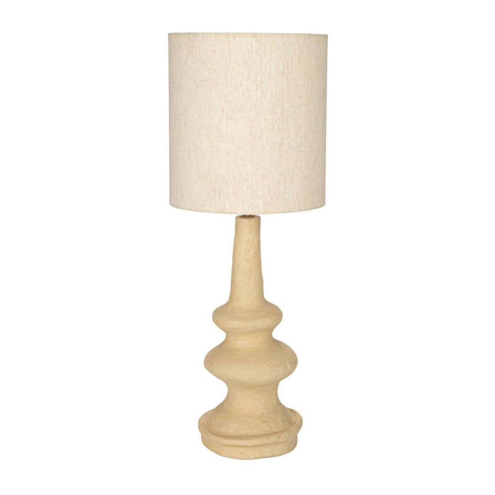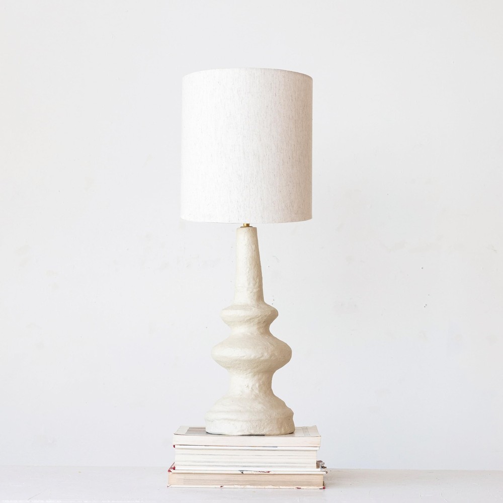 Creative Co-Op Handmade Paper Mache Table Lamp with Cotton Shade, Natural Product Details Base Material: Paper Mache Bulb Base: E26 Product Dimensions: 11"D x 11"W x 28"H Item Weight: 5.3 Pounds Lamp Type: Table Lamp Base Material: Paper Mache Bulb Base: E26 Product Dimensions: 11"D x 11"W x 28"H Item Weight: 5.3 Pounds Lamp Type: Table Lamp Shade Color: Off White Shade Material: Cotton Switch Type: In Line Style: Farmhouse Brand: Creative Co-Op Color: Cream Special Feature: Lightweight Light Source Type: LED Material: Paper Mache, Cotton Room Type: Office, Living Room, Bedroom Recommended Uses For Product: Decoration Power Source: Corded Electric Shape: Round Connectivity Technology: USB Included Components: Shade Is Waterproof: False Mounting Type: Tabletop Wattage: 40 watts Number of Items: 1 Indoor/Outdoor Usage: Indoor Installation Type: Tabletop Is Cordless?: No UPC: 191009625810 Manufacturer: Creative Co-Op Item Weight: 5.28 pounds Country of Origin: India Item model number: DF8981 Warranty Description: No warranty. Batteries required: No A unique and cozy table lamp that features a paper mache base with a swivel neck and a cotton shade A versatile addition to any style, from farmhouse to French country to boho to global to modern Requires 1 40-watt bulb (not included) and has a switch for easy operation Made of paper mache and cotton, eco-friendly and lightweight materials that create a warm and inviting ambiance Measures 11 inches in diameter and 28 inches in height This handmade paper mâché table lamp with cotton shade, natural is a beautiful piece for any room. It brings a touch of creativity and comfort to any space with its paper mâché base that has a swivel neck that allows anyone to adjust the direction of the light and its cotton shade that has a soft and woven feel. The paper mâché and cotton materials are eco-friendly and lightweight, and they create a warm and inviting ambiance when lit (each one will vary). The lamp is versatile and can fit any style, from farmhouse to French country to boho to global to modern. It can also be used in any room, such as the living room, bedroom, office, or study. The lamp requires one 40-watt bulb (not included) and has an inline switch for easy operation. It is easy to keep clean and tidy, and it will make any space more stylish and cozy. The lamp measures 11 inches in diameter and 28 inches in height, making it suitable for any table or desk.