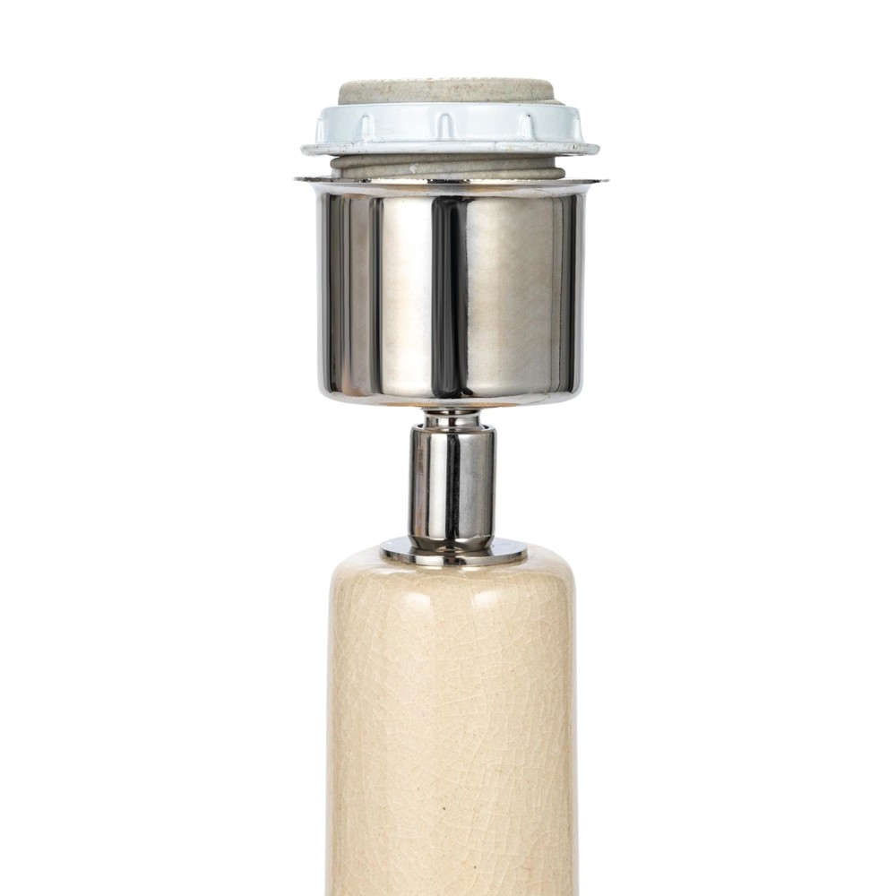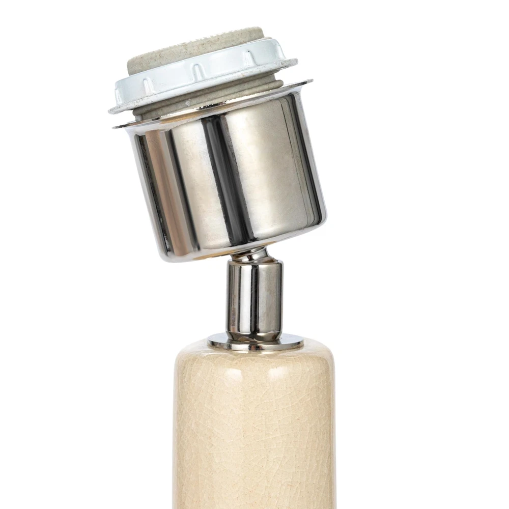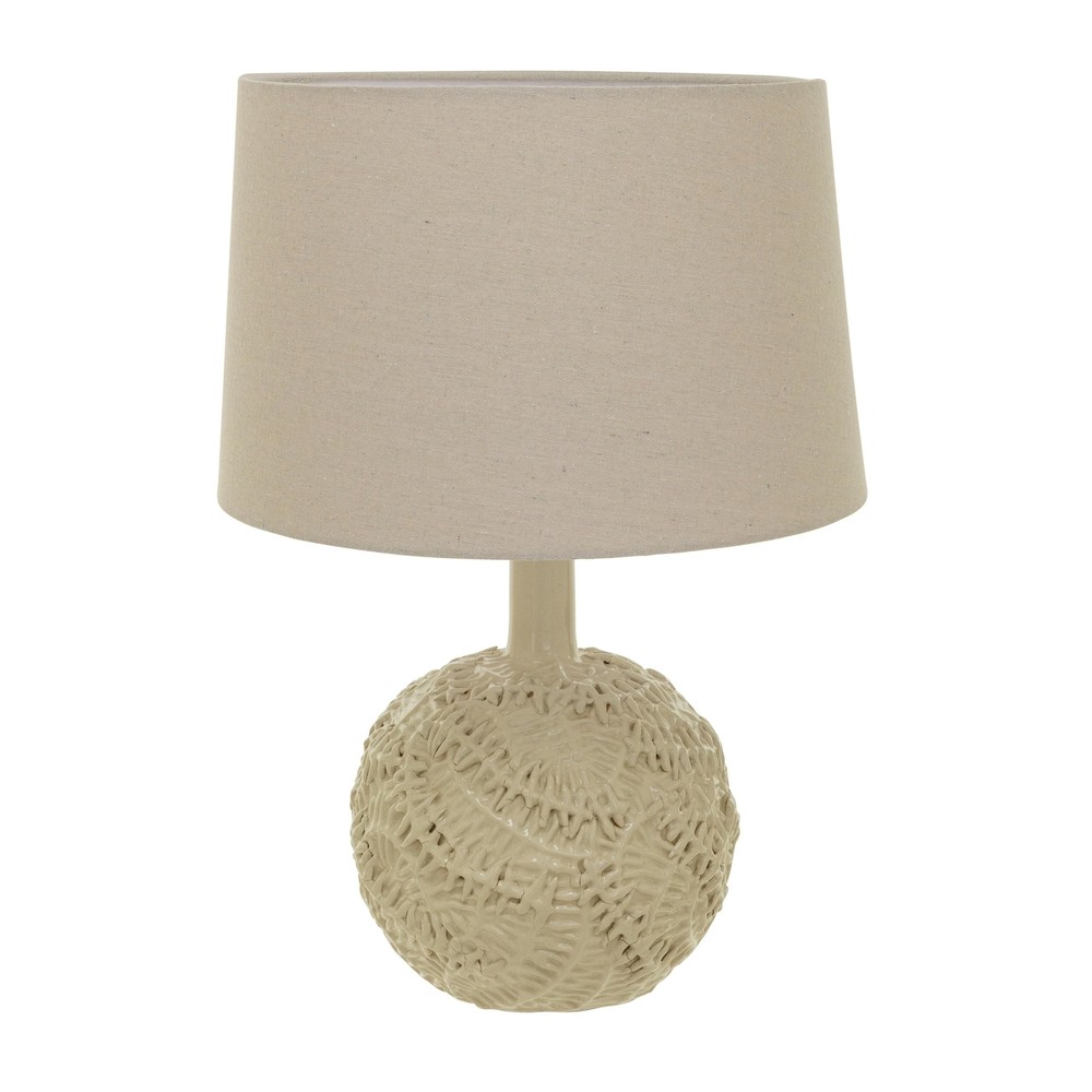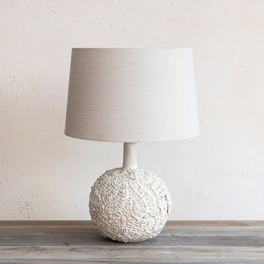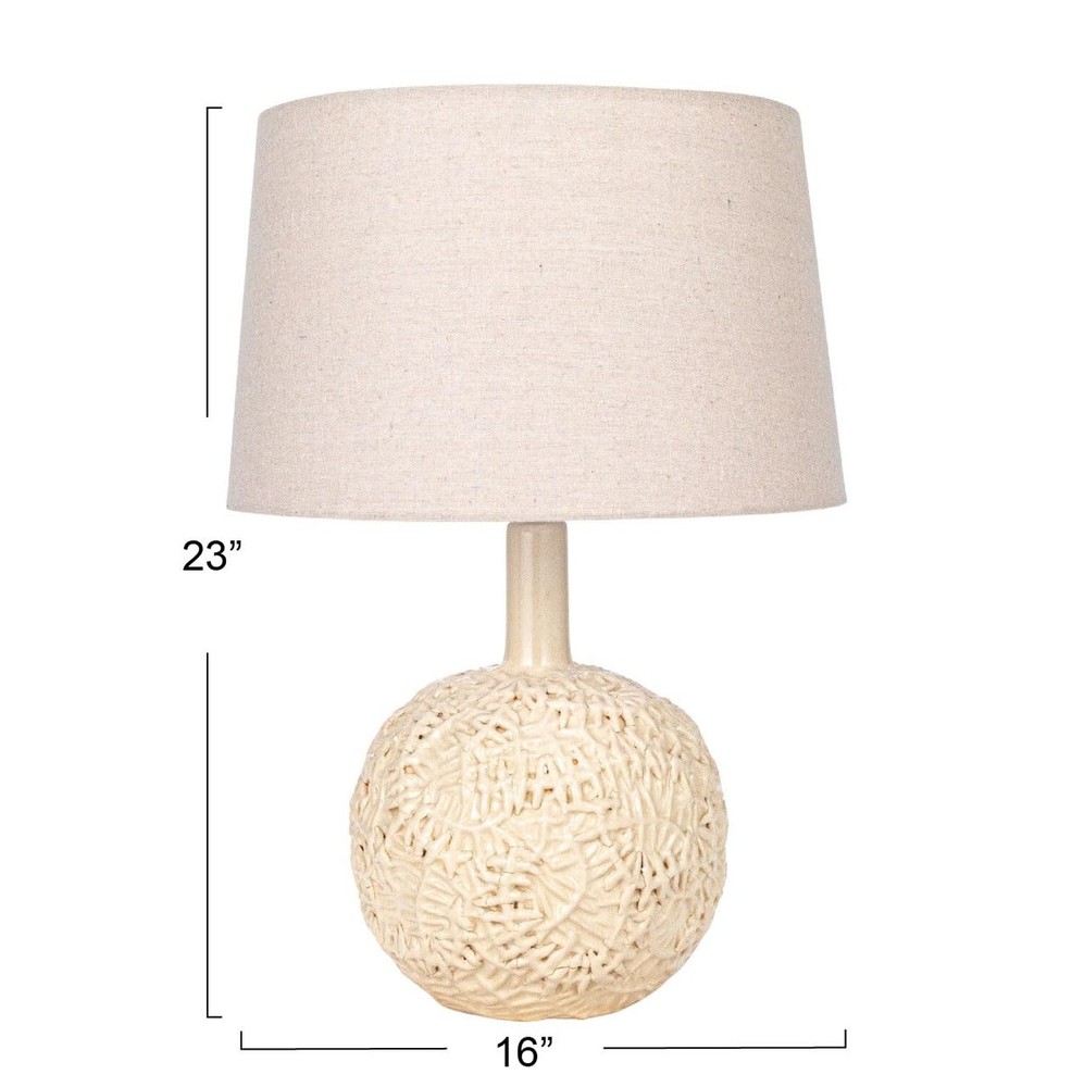 Creative Co-Op Handmade Textured Stoneware Table Lamp with Fabric Shade, Cream Product Details Base Material: Stoneware Bulb Base: E26 Product Dimensions: 16"D x 16"W x 23"H Item Weight: 9 Pounds Lamp Type: Table Lamp Base Material: Stoneware Bulb Base: E26 Product Dimensions: 16"D x 16"W x 23"H Item Weight: 9 Pounds Lamp Type: Table Lamp Shade Color: Beige Shade Material: Cotton Switch Type: Rocker Style: Farmhouse Brand: Creative Co-Op Color: Cream Special Feature: Portable Light Source Type: LED Material: Stoneware, Cotton Room Type: Any Room Recommended Uses For Product: Decoration Power Source: Corded Electric Shape: Round Number of Light Sources: 1 Included Components: Shade Is Waterproof: False Mounting Type: Tabletop Wattage: 100 watts Number of Items: 1 Lighting Method: LED Indoor/Outdoor Usage: Indoor Installation Type: Tabletop Number of Pieces: 1 Voltage: 120 Volts Base Diameter: 16 Inches Is Cordless?: No UPC: 191009630371 Manufacturer: Creative Co-Op Item Weight: 9 pounds Country of Origin: China Item model number: DF9112 Warranty Description: No warranty. Batteries required: No A beautiful and cozy table lamp made of handmade textured stoneware with a fabric shade in a cream color. A versatile and organic accessory for any room style, from farmhouse to coastal, from Scandinavian to mid-century modern, from organic to round Requires 1 100-watt bulb or lower (not included) Made of handmade textured stoneware and cotton that are eco-friendly, durable, and easy to clean Measures 16 inches in diameter and 23 inches in height This handmade textured stoneware table lamp with a cream fabric shade is a cozy and beautiful addition to any room. The cream-colored body adds warmth and charm, while the soft cotton shade adds coziness. The lamp is suitable for various room styles, from farmhouse to mid-century modern, and is eco- friendly, durable, and easy to clean. It requires a 100W bulb and comes with a cord and plug for easy installation. The lamp measures 16 inches in diameter and 23 inches in height, and each lamp will vary slightly due to its handmade nature. Overall, this versatile and organic accessory enhances the room's ambiance.