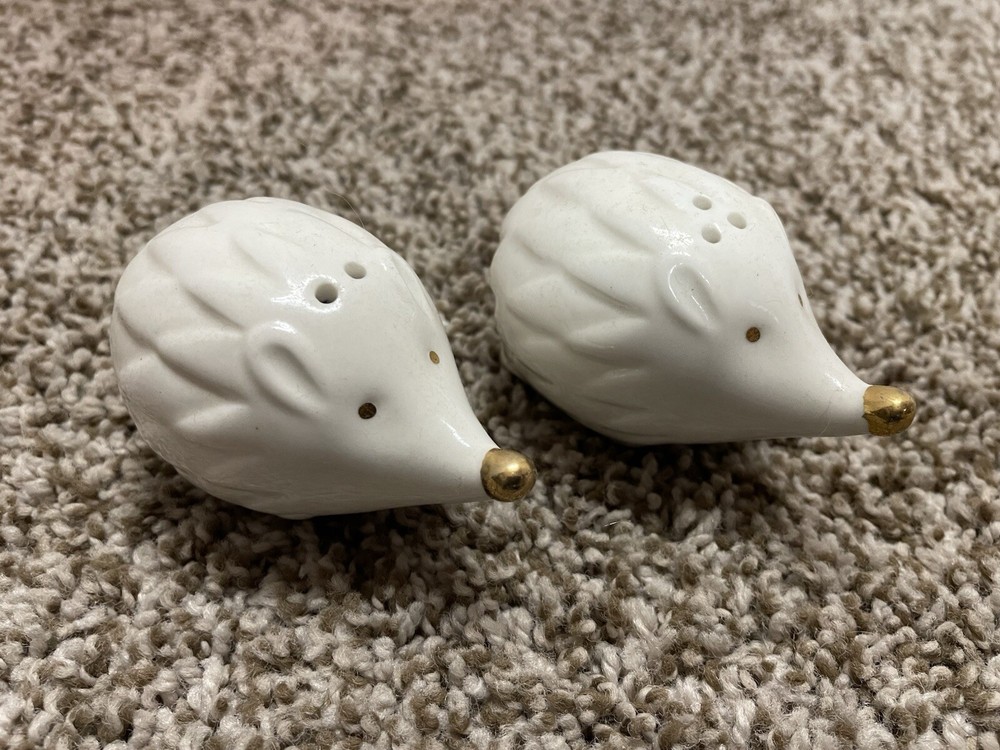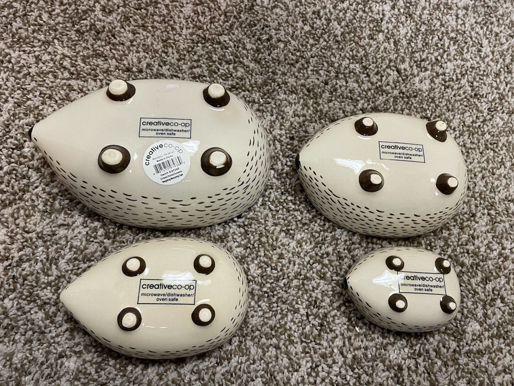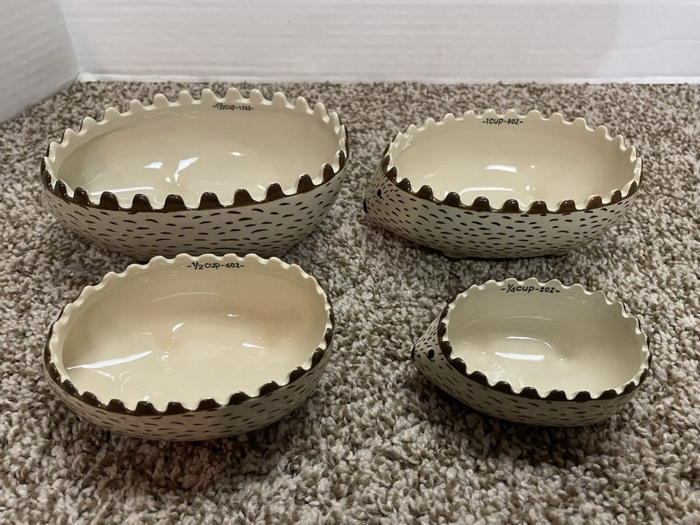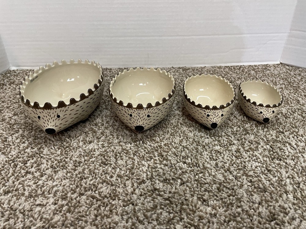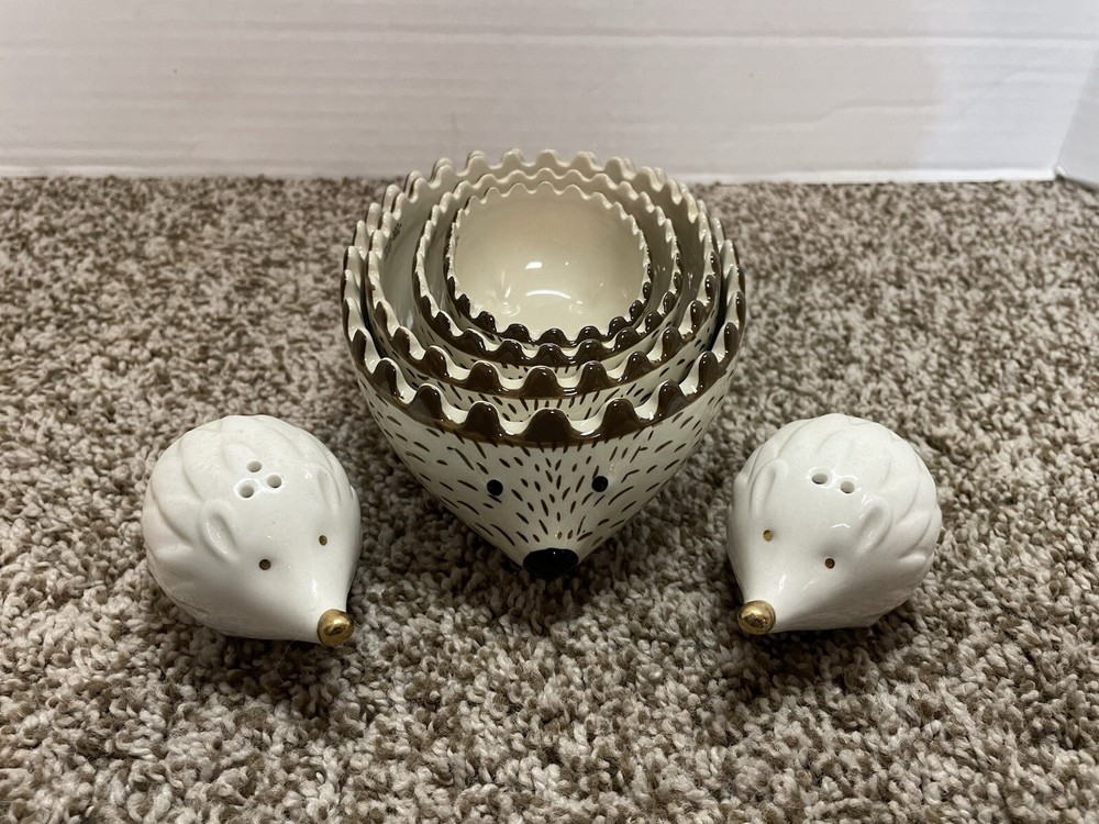 Here is a pre-owned Creative Co-op Stoneware Hedgehog Measuring Cups. Sizes are 1.5 cups, 1 cup, 1/2 cup & 1/4 cup. Microwave / Dishwasher / Oven Safe. Plus BONUS Hedgehog Salt & Pepper Shakers - Noses are Colored Gold. FREE SHIPPING in the Continental United States ONLY !