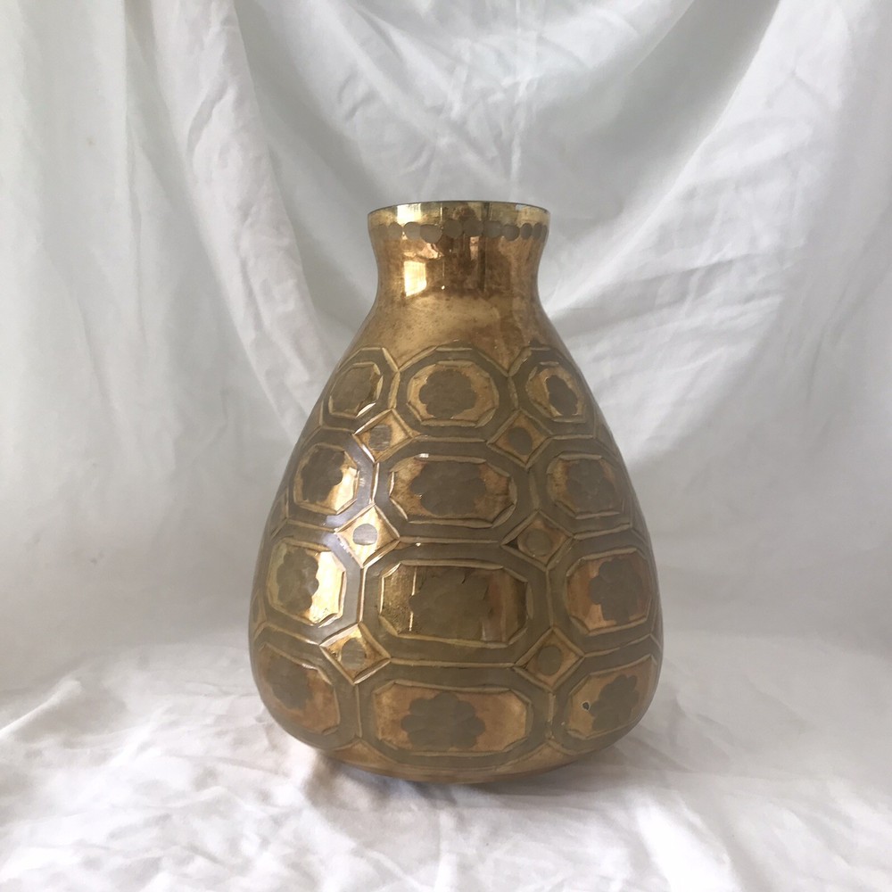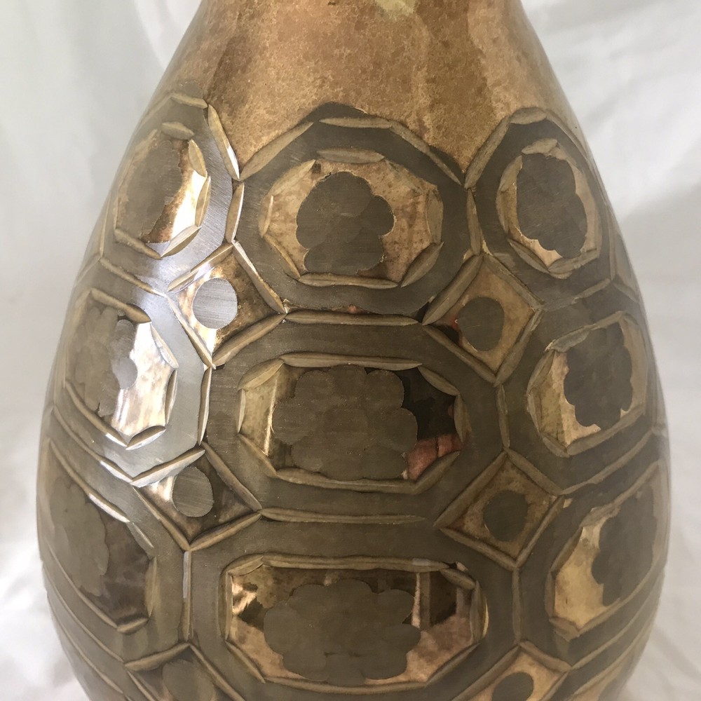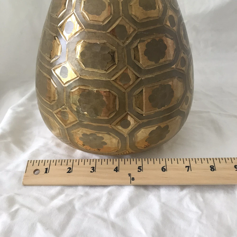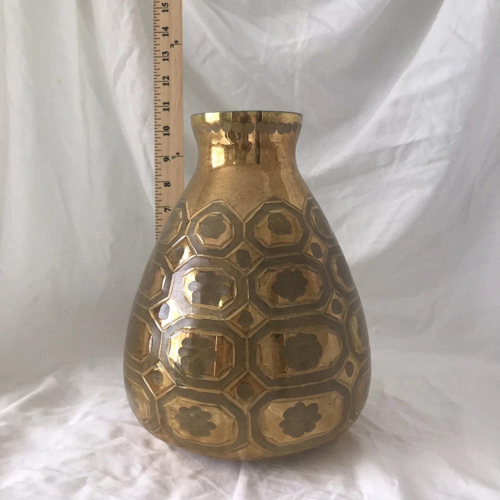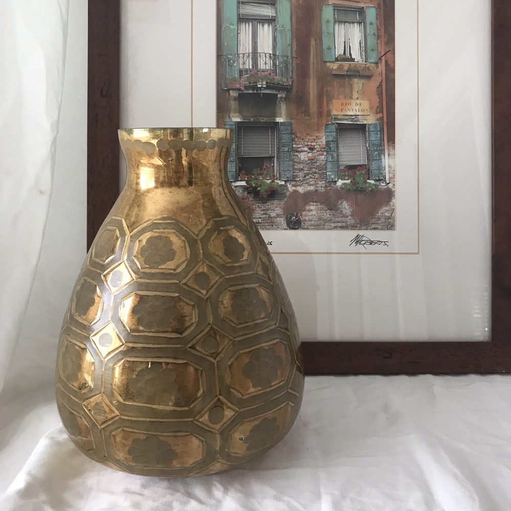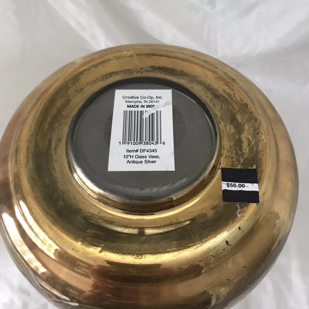 NWT Creative Co-Op Inc Glass Vase Antique Gold 10 Inch, Retail $56. Creative Co-op is a home decor and furniture company that offers a variety of products, including this glass vase in an antique gold color exterior finish with a Moroccan style, which gives it a vintage or aged appearance . This vase is 10 inches tall and may be used to display flowers or other decorative items. Height-10” Width at widest point-7” Antique gold on the outside. Antique silver on the inside
