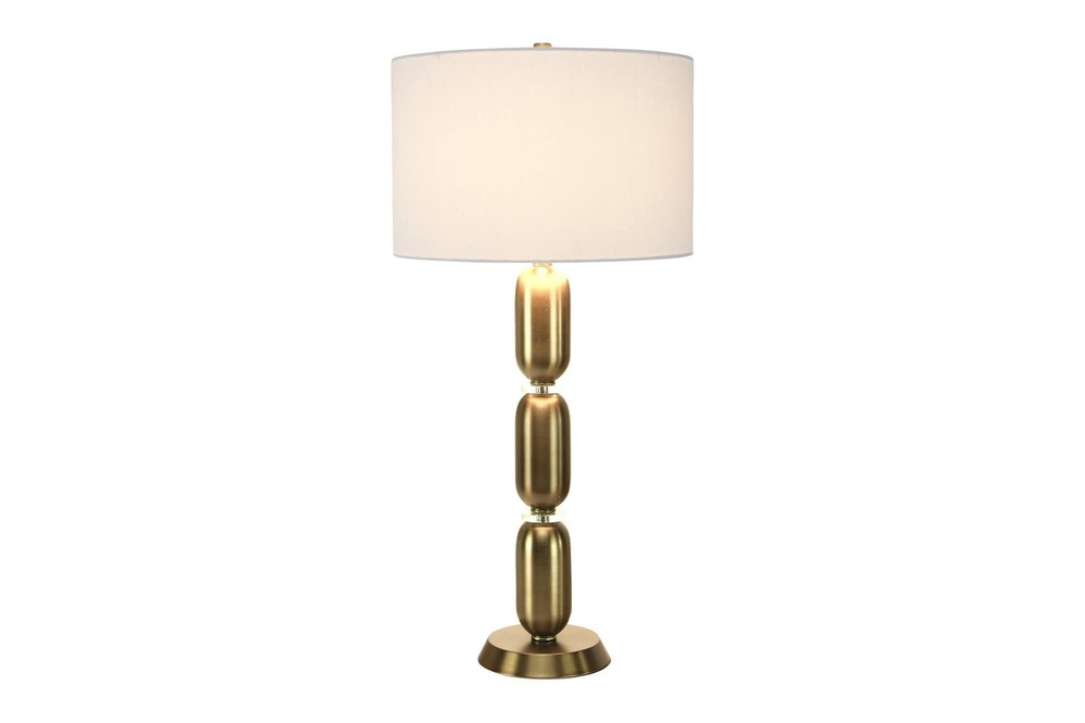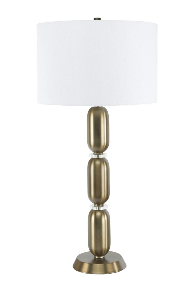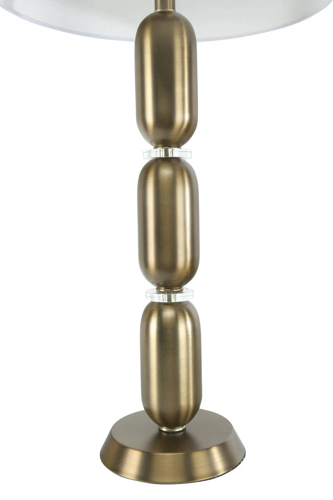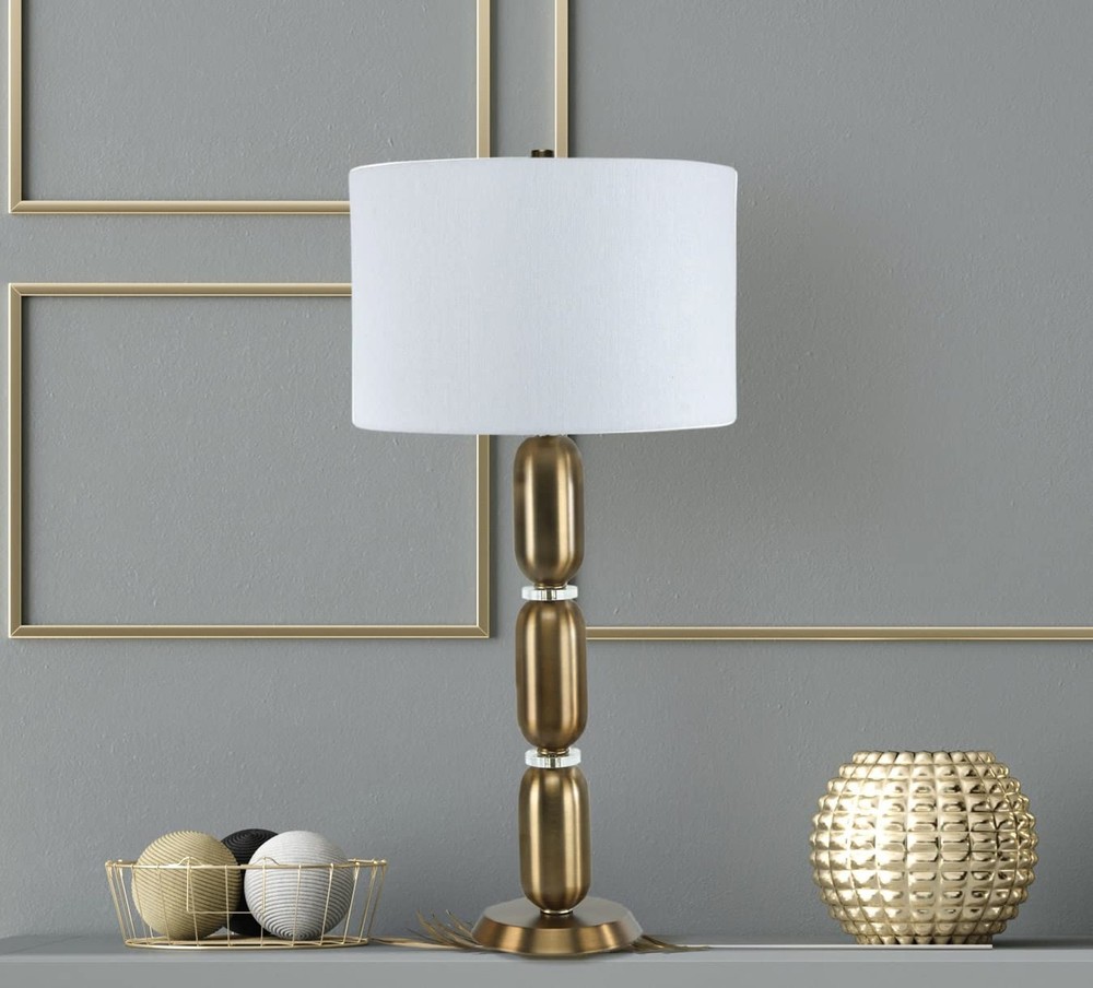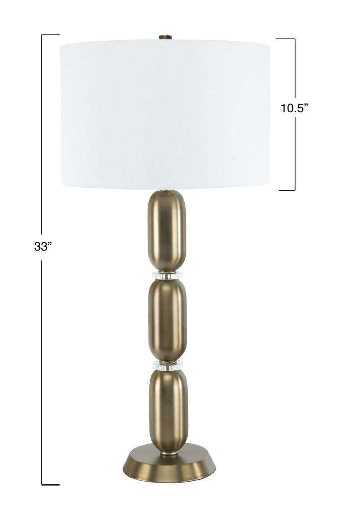 Creative Co-Op Metal Glass Middle Table Lamp, Pewter Product Details Finish Type: Brushed Gold,Brushed Matte Base Material: Metal Product Dimensions: 16"D x 16"W x 32.75"H Item Weight: 5 Pounds Lamp Type: Table Lamp Finish Type: Brushed Gold,Brushed Matte Base Material: Metal Product Dimensions: 16"D x 16"W x 32.75"H Item Weight: 5 Pounds Lamp Type: Table Lamp Shade Color: white Shade Material: glass,linen,metal Switch Type: Pull Chain Style: Modern Brand: Creative Co-Op Color: Pewter Light Source Type: LED Material: Glass, Metal Room Type: Bedroom Recommended Uses For Product: Table Lamps Power Source: Corded Electric Shape: Drum Number of Light Sources: 1 Connectivity Technology: USB Included Components: Bulb Is Waterproof: False Bulb Shape Size: A19 Mounting Type: Tabletop Number of Items: 1 Indoor/Outdoor Usage: Indoor Installation Type: Tabletop Number of Pieces: 1 Efficiency: Efficient Is Cordless?: No UPC: 191009336679 Manufacturer: Creative Co-Op Shade Height: 33 Inches Item Weight: 5 pounds Country of Origin: China Item model number: EC0340 Finish types: Brushed Gold,Brushed Matte Assembly required: No Warranty Description: None. Batteries required: No Smooth metal stacked column base with glass disc dividers Brushed matte golden hue White linen drum shade 33 inches in height Bulb not included The Margaux collection is designed to admire the modern European style, observing its simple elegance. The smooth stacked columns are perceived throughout the base, fashioning a modern sensation to a classic design. The brushed gold, vintage pewter, and slick silver, truly capture the inspired European elements of the modern day.
