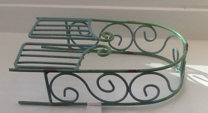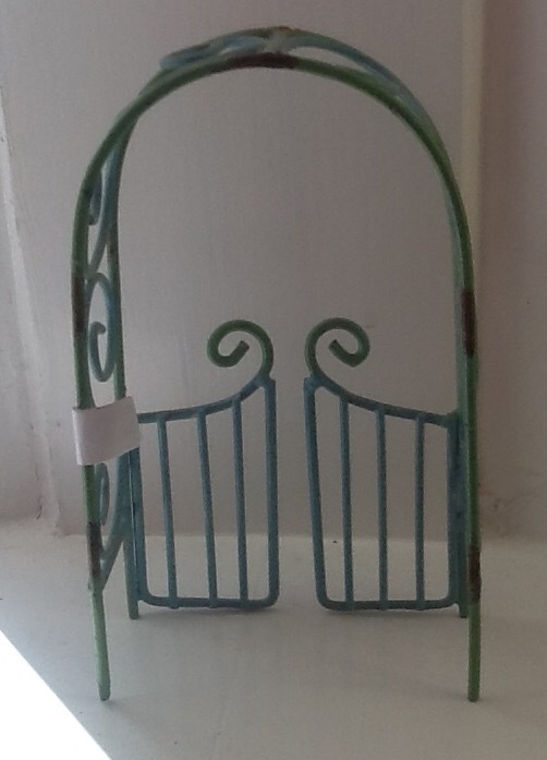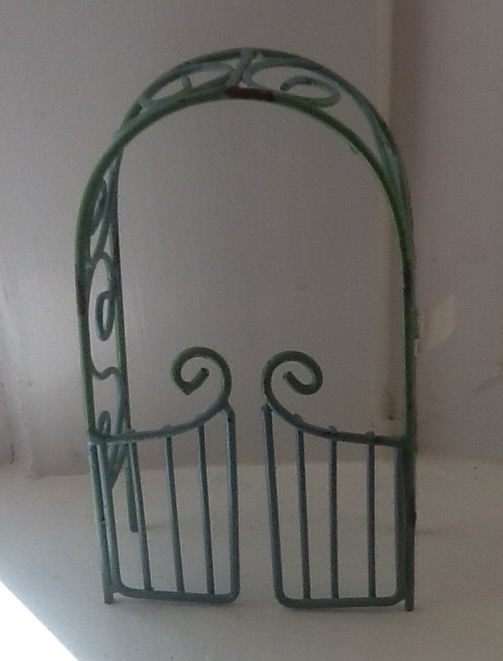 Creative Co-Op miniture wire distressed archway, blue and green. Great addition to a Miniture garden or as a home decor accessory. Measurments: 6" tall x 3 1/4", the front gates do not open. The sides are adorned with a swirl pattern.