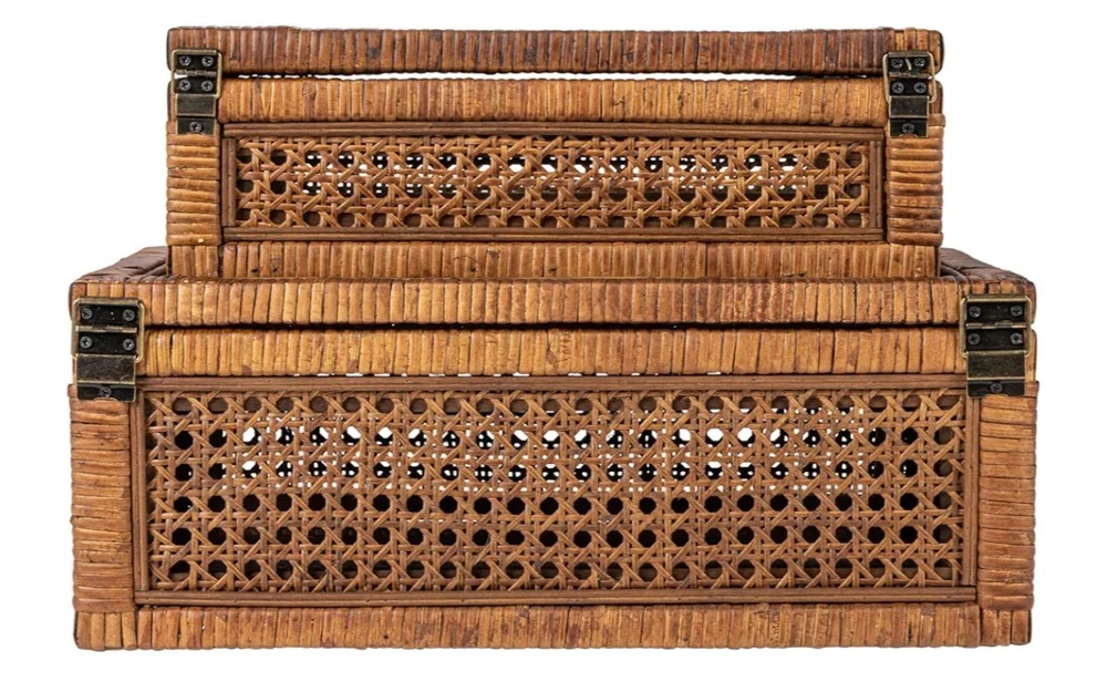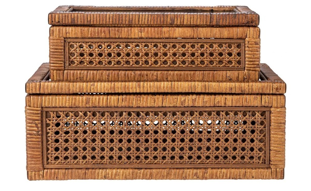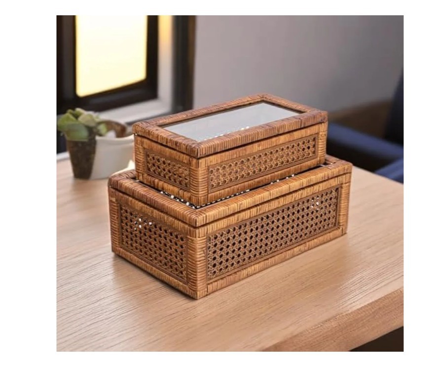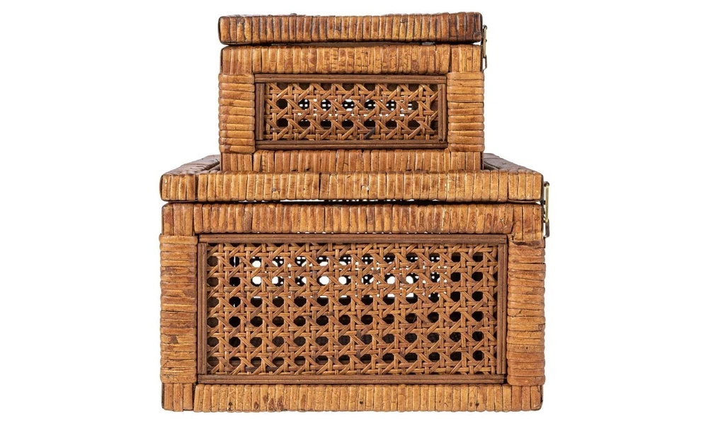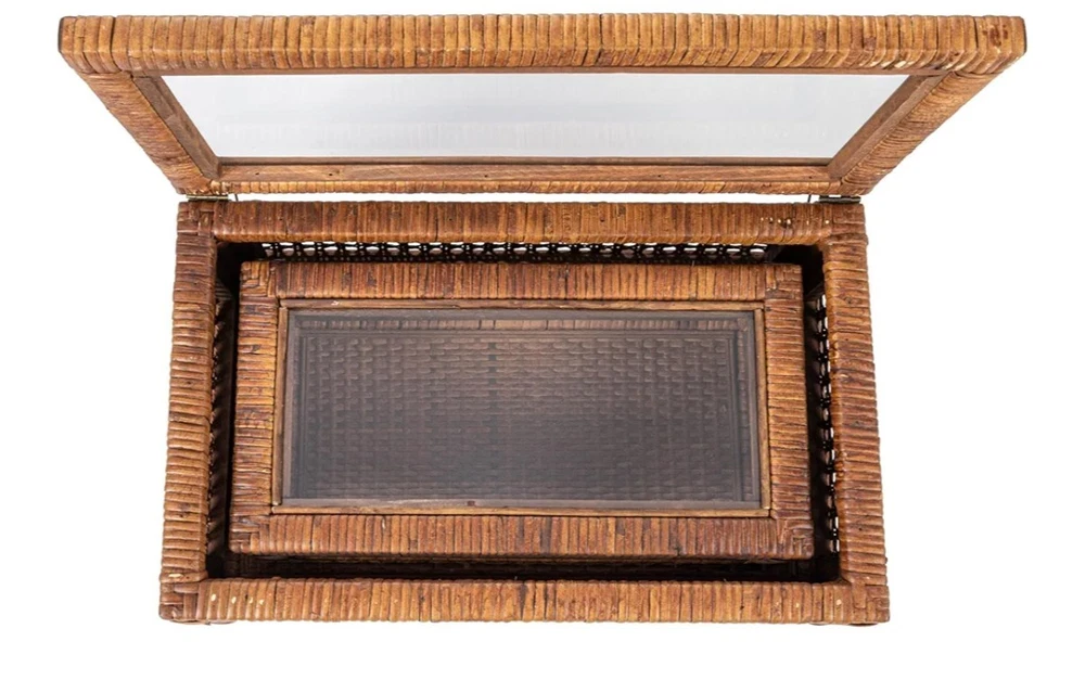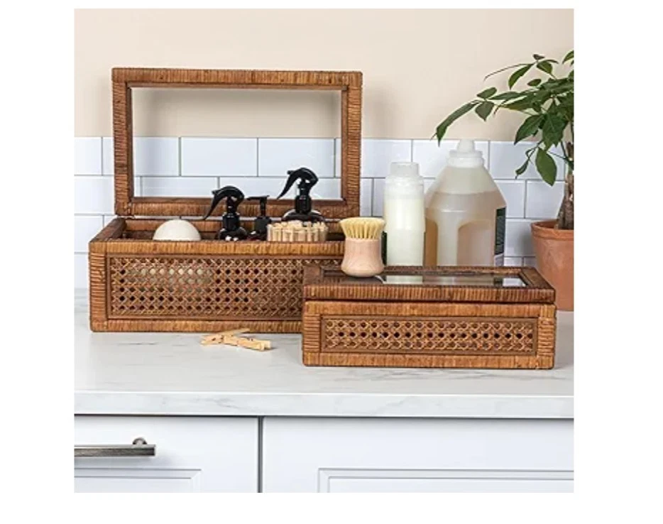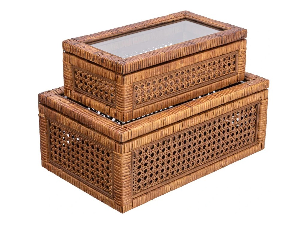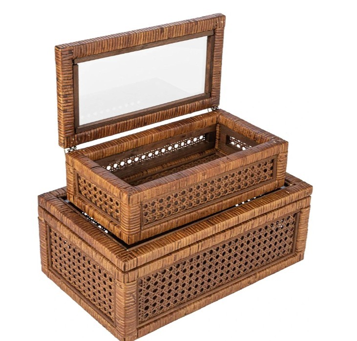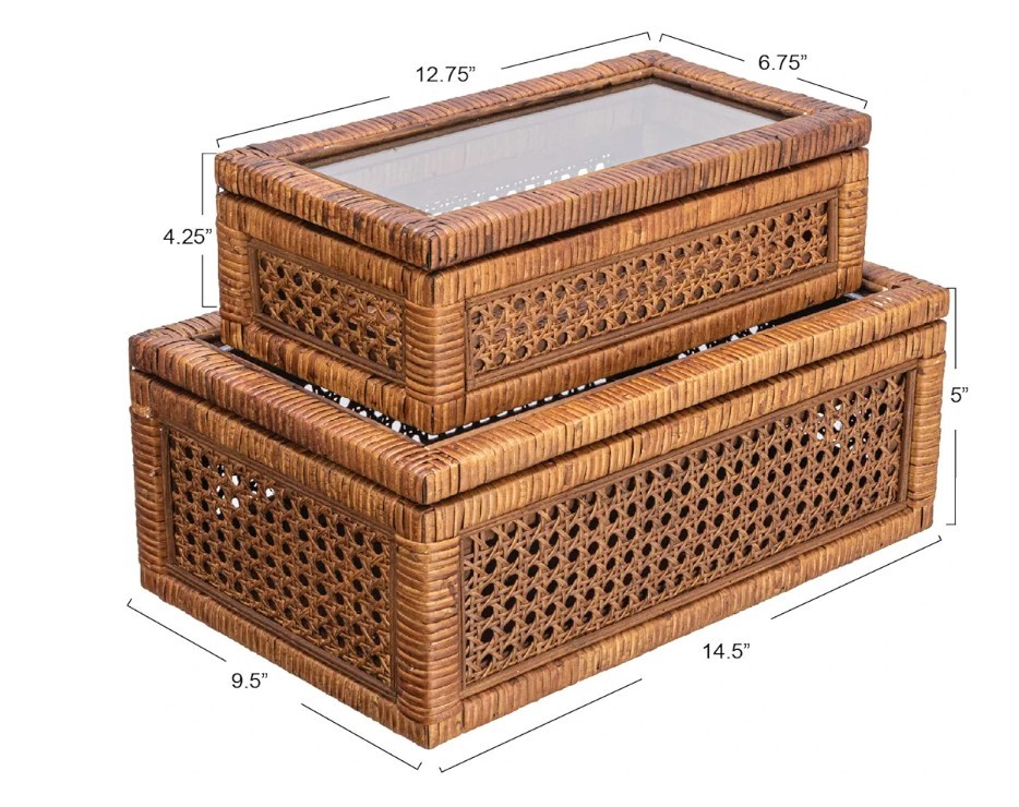 Creative Co-Op Modern Decorative Rectangle Woven Rattan and Wood Display Boxes with Glass Top, Set of 2 Sizes, Dark Brown Finish, Rectangular Top highlights BrandCreative Co-Op ColorDark Brown MaterialWood, Rattan Special FeatureLidded StyleRectangular Recommended Uses For ProductDecorative This stylishly versatile set of woven rattan and wood display boxes showcases a rectangular shape in 2 sizes, finished with glass window vision tops Utilize this boho-inspired set of decorative storage boxes to display and protect small keepsakes, or stylishly stow odds and ends like remotes Equipped with glass tops to easily locate and identify contents without opening Made from wood and woven rattan Large box measures 14.25 inches L x 9.5 inches W x 5.25 inches H; Small box measures 12.5 inches L x 7 inches D x 4.5 inches H Product specifications Style Color Dark Brown Style Name Rectangular Shape Rectangular Materials & Care Material Type Wood, Rattan Features & Specs Additional Features Lidded Closure Type Flip Top Water Resistance Level Not Water Resistant Measurements Item Dimensions L x W x H 14.25"L x 9.5"W x 5.25"H Item Weight 7.1 Pounds Number of Items 1 Additional details Elevate any interior design scheme with these stunning decorative storage pieces that embody the essence of sophistication and natural beauty. This versatile set features two rectangular-shaped boxes, expertly crafted from woven rattan and wood with a sleek dark brown finish. Equipped with glass window vision tops, these stylish display boxes are the perfect way to showcase and protect cherished keepsakes. Whether utilized to stow away odds and ends like remotes or to display decorative objects, these boxes will add a touch of boho-inspired charm to any living space. Crafted with meticulous attention to detail, these boxes are designed to be both functional and aesthetically pleasing. Made from high-quality wood and woven rattan, this set of display boxes is built to last, ensuring timeless beauty and functionality for years to come.
