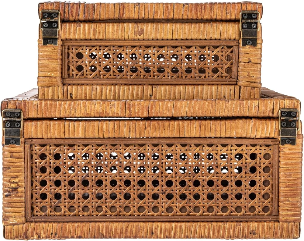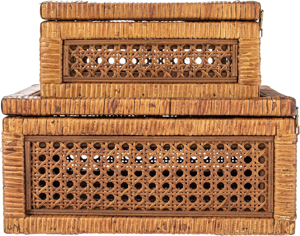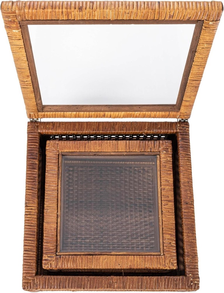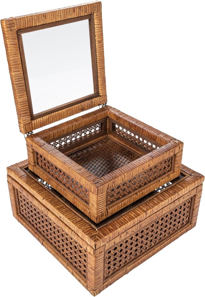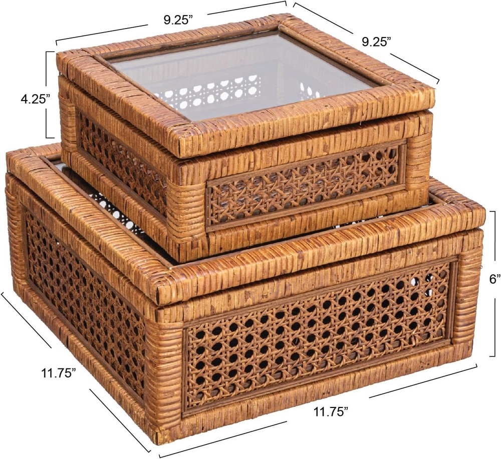 Creative Co-Op Modern Decorative Square Woven Rattan and Wood Dark Brown Product Details Brand: Creative Co-Op Color: Dark Brown Material: Glass Style: Square Recommended Uses For Product: Decorative Product Dimensions: 11.75"L x 11.75"W x 6"H Closure Type: Flip Top Shape: Square Pattern: Solid Number of Items: 1 Item Package Quantity: 1 UPC: 191009603177 Item Weight: 6.65 pounds Manufacturer: Creative Co-Op Country of Origin: China Item model number: EC1487 Number of pieces: 2 Batteries required: No This stylishly versatile set of woven rattan and wood display boxes showcases a square shape in 2 sizes, finished with glass window vision tops Utilize this boho-inspired set of decorative storage boxes to display and protect small keepsakes, or stylishly stow odds and ends like remotes Equipped with glass tops to easily locate and identify contents without opening Made from wood and woven rattan Large box measures 11.75 inches L x 11.75 inches W x 6 inches H; Small box measures 9 inches W x 9 inches D x 4 inches H Elevate any interior design scheme with these stunning decorative storage pieces that embody the essence of sophistication and natural beauty. This versatile set features two square-shaped boxes, expertly crafted from woven rattan and wood with a sleek dark brown finish. Equipped with glass window vision tops, these stylish display boxes are the perfect way to showcase and protect cherished keepsakes. Whether utilized to stow away odds and ends like remotes or to display decorative objects, these boxes will add a touch of boho-inspired charm to any living space. Crafted with meticulous attention to detail, these boxes are designed to be both functional and aesthetically pleasing. Made from high-quality wood and woven rattan, this set of display boxes is built to last, ensuring timeless beauty and functionality for years to come.