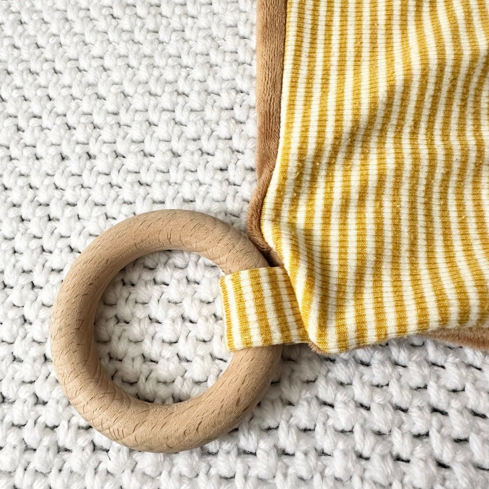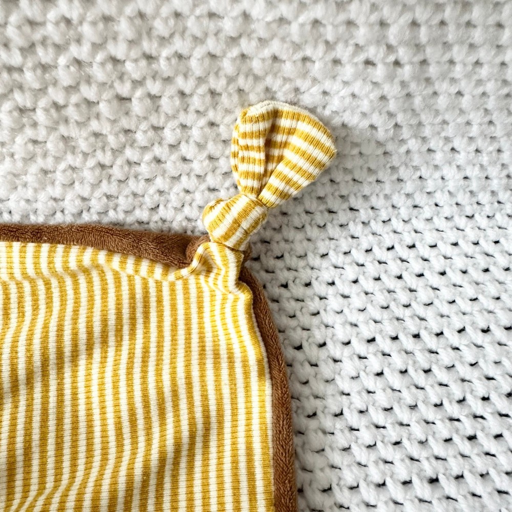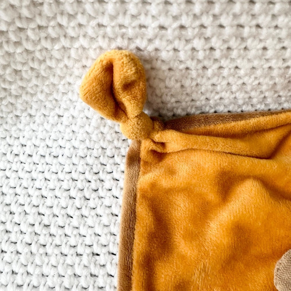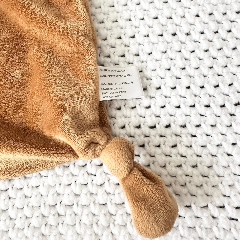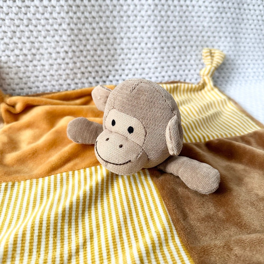 <![CDATA[<div>From Creative Co-op. Brown tan colorblock knotted ends baby security lovey blanket. Monkey plush lovey in middle. Wooden ring on one end. Fleece material. Preowned in good condition with no stains or tears. Measurements: approximate 11” x 11” All items come from a smoke free/pet free home. No trades or modeling. As always, offers are welcome. Thanks for stopping by!