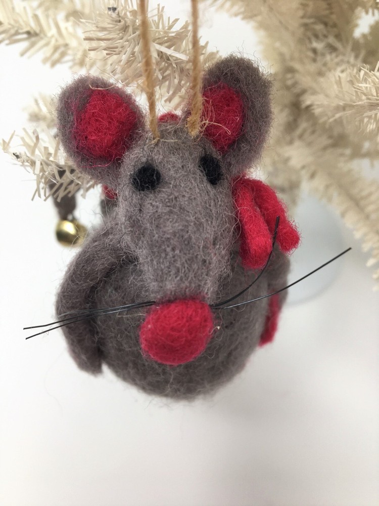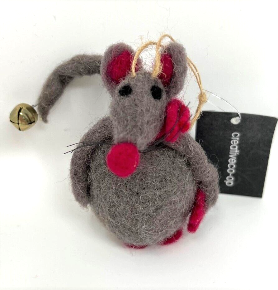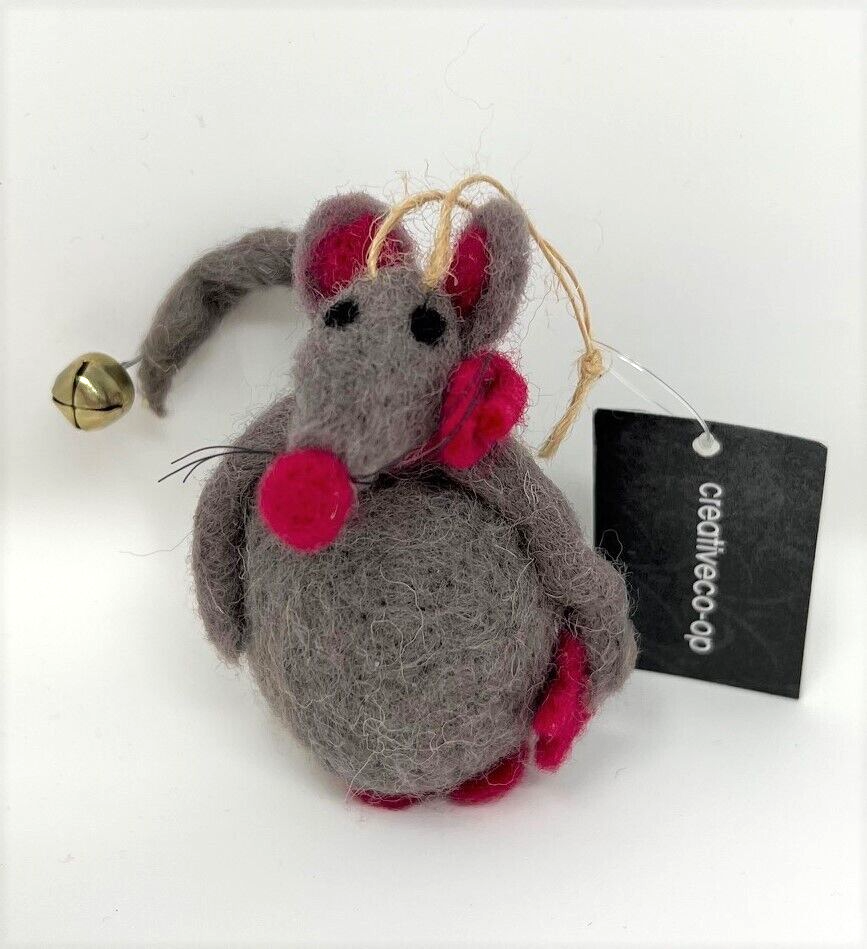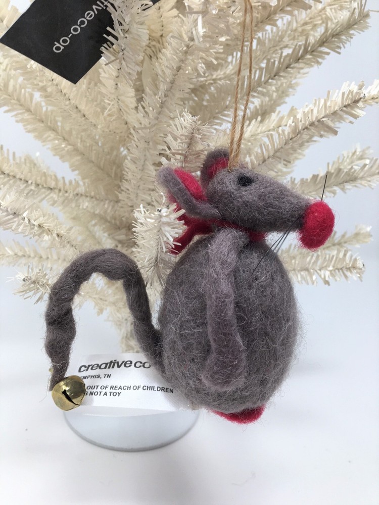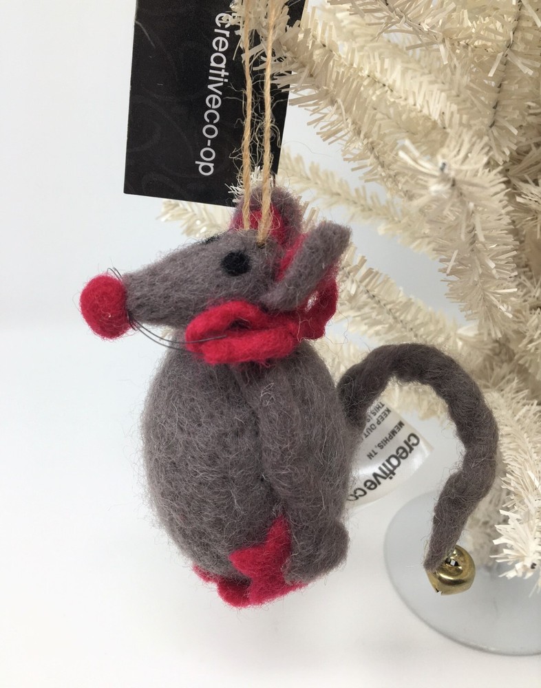 Creative Co-op 3 1/2" Tall woolen Mouse Christmas Ornament, Vintage. New with tag. Gray mouse with red accents (nose, feet, scarf and red star in hand) and bell at the end of bendable tail. Black whiskers. Display tree not included. Non-smoking home. Thanks for looking!