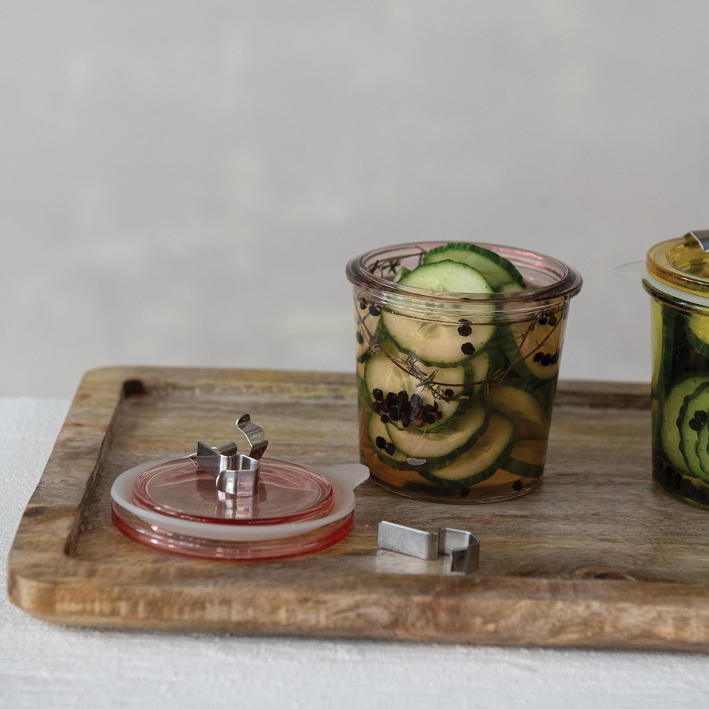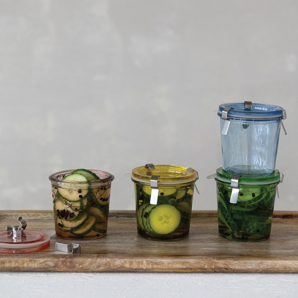 A charming set of glass jars with airtight lids, rubber seals, and three removable metal clamps in 4 different colors A perfect addition to farmhouse, French country, and cottagecore decor styles This versatile set is ideal for storing dry goods, spices, or as decorative pieces Made of durable glass with metal clamps and rubber seals for an airtight closure 3.75” Diameter x 3.5” H