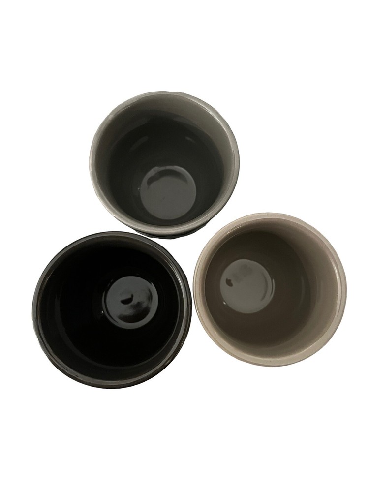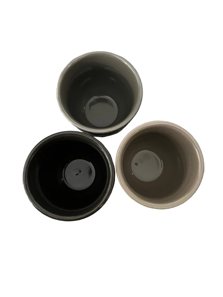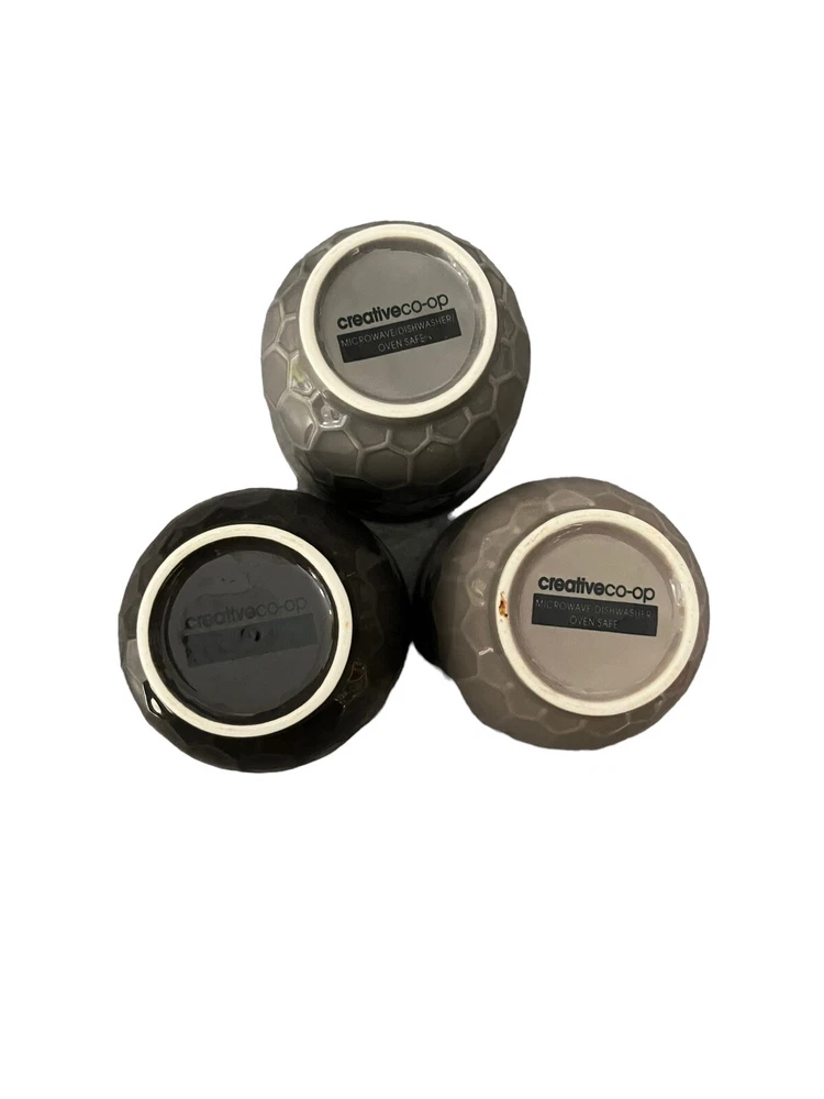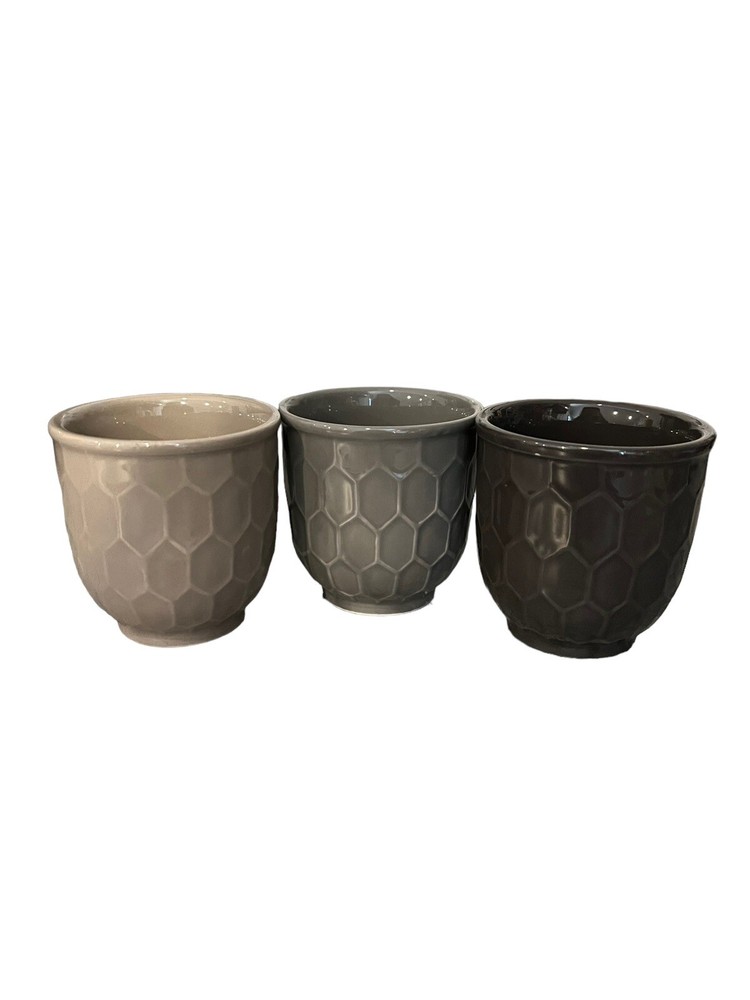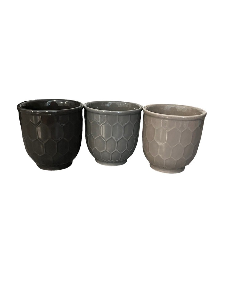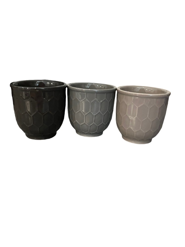 Creative Co-Op Multipurpose Ceramic Modern Geometric Vases Succulent Pots Set Pre-Owned in Good Condition No visible flaws or chips Grey Tones Set of 3 3”Hx2.75”W No drainage holes Microwave, Dishwasher & Oven Safe Condition consistent with age Photos are part of the description From a pet & smoke free environment Location - T
