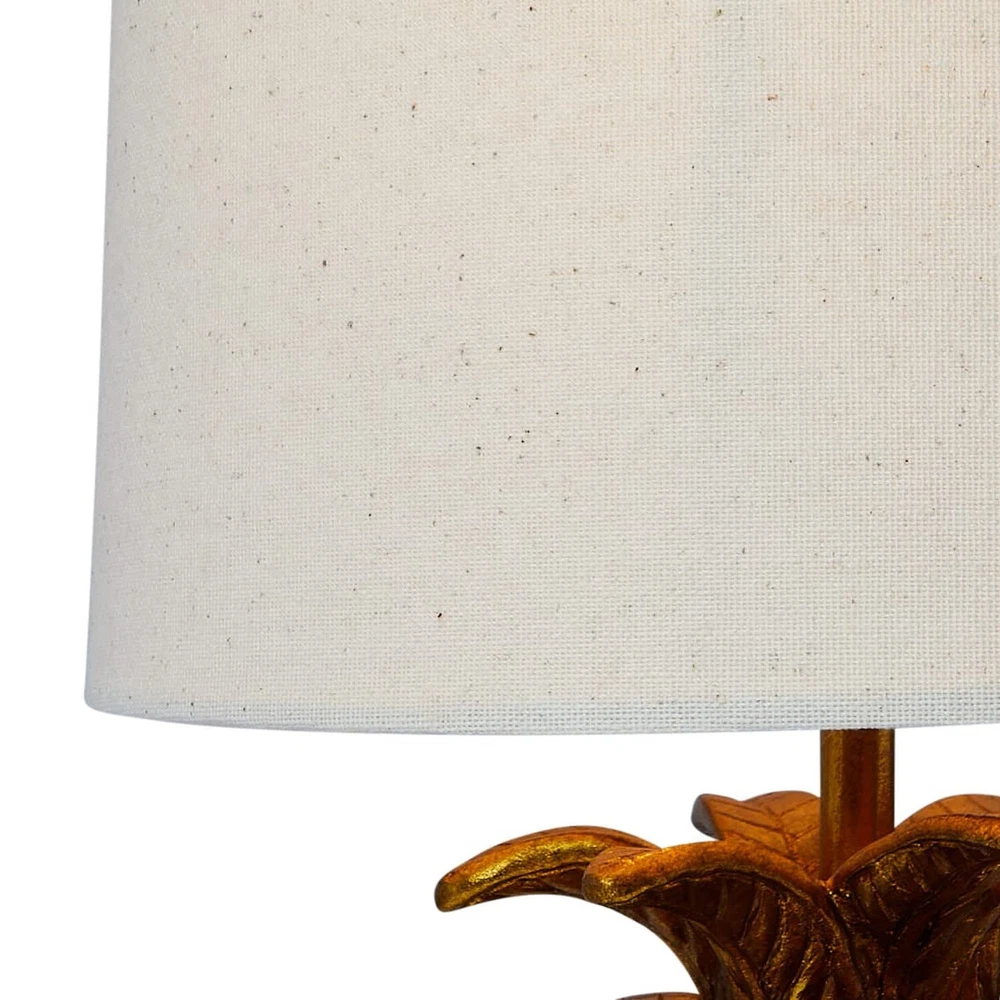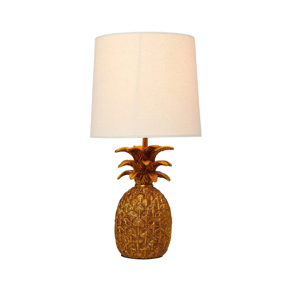 Creative Co-Op Pineapple Shaped Table Lamp with Distressed Gold Finish & Linen Shade Product Details Color: Gold/White Size: 9" Round x 18"H Brand: Creative Co-Op MPN: DA7087 UPC: 807472952529 EAN: 0807472952529 Finish Type: Distressed,Distressed Finish,Resin Base Material: Resin Product Dimensions: 4.75"D x 9"W x 18"H Item Weight: 3 Pounds Lamp Type: Table Lamp Finish Type: Distressed,Distressed Finish,Resin Base Material: Resin Product Dimensions: 4.75"D x 9"W x 18"H Item Weight: 3 Pounds Lamp Type: Table Lamp Shade Color: black Shade Material: Linen, Resin Switch Type: Touch Style: Tropical Brand: Creative Co-Op Color: Gold/White Special Feature: Corded Light Source Type: Incandescent Material: Linen Room Type: Office, Kitchen, Bedroom, Living Room, Hallway Recommended Uses For Product: Decoration Power Source: Corded Electric Number of Light Sources: 1 Connectivity Technology: USB Included Components: Resin Pineapple Shaped Table Lamp with Distressed Gold Finish and Linen Shade Is Waterproof: False Mounting Type: Floor Mount Wattage: 60 watts Number of Items: 1 Lighting Method: Incandescent Control Method: Touch Indoor/Outdoor Usage: Indoor Specific Uses For Product: Lamp Water Resistance Level: Not Water Resistant Installation Type: Countertop Number of Pieces: 1 Voltage: 120 Volts Brightness: 800 Lumen Is Cordless?: No UPC: 807472952529 Global Trade Identification Number: 29 Size: 9" Round x 18"H Manufacturer: Creative Co-Op Shade Height: 18 Inches Item Weight: 3 pounds Country of Origin: China Item model number: DA7087 Finish types: Distressed,Distressed Finish,Resin Assembly required: No Warranty Description: N/a. Batteries required: No This tropical table lamp showcases a playful resin pineapple silhouette in a distressed finish, topped with a linen shade Gold resin pineapple table lamp with linen shade Equipped with a rotary switch Maximum 60W bulb not included 9" L x 9" W x 18" H This tropical table lamp showcases a playful resin pineapple silhouette in a distressed finish, topped with a linen shade; Maximum 60W bulb not included; 9" L x 9" W x 18" H