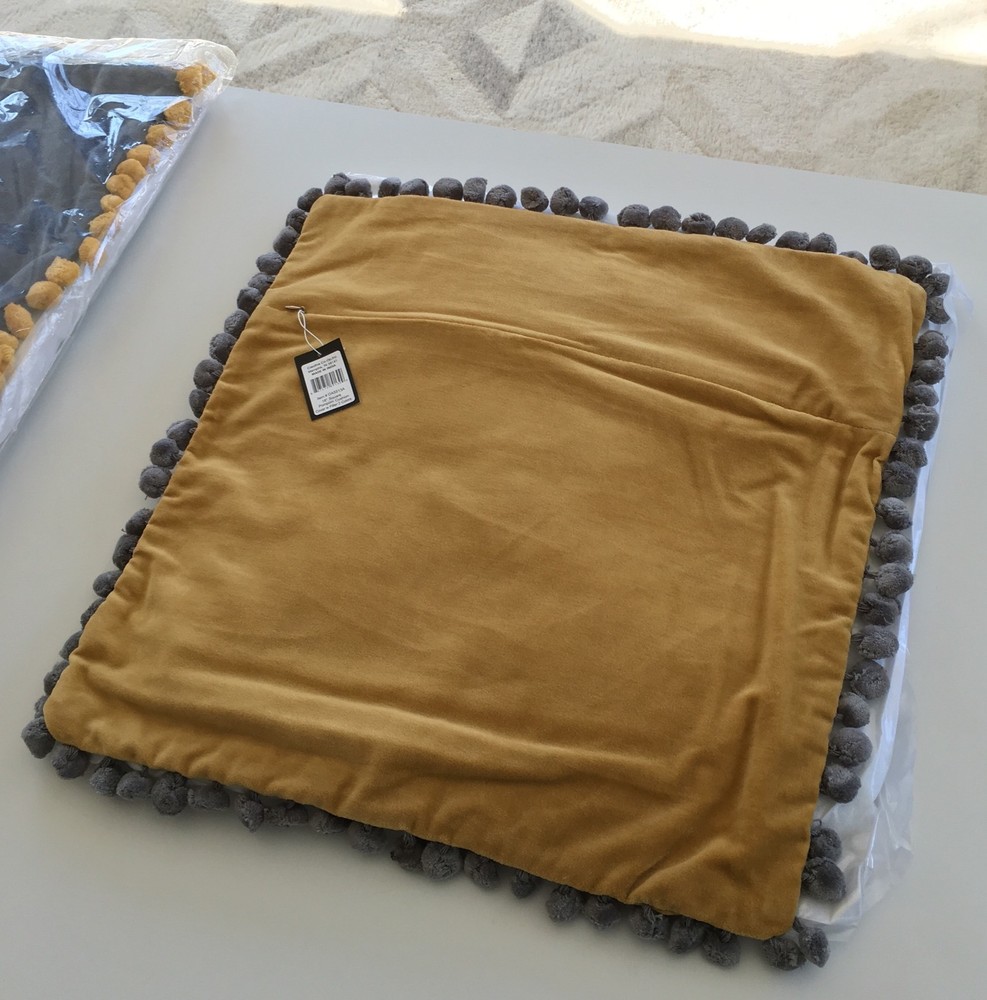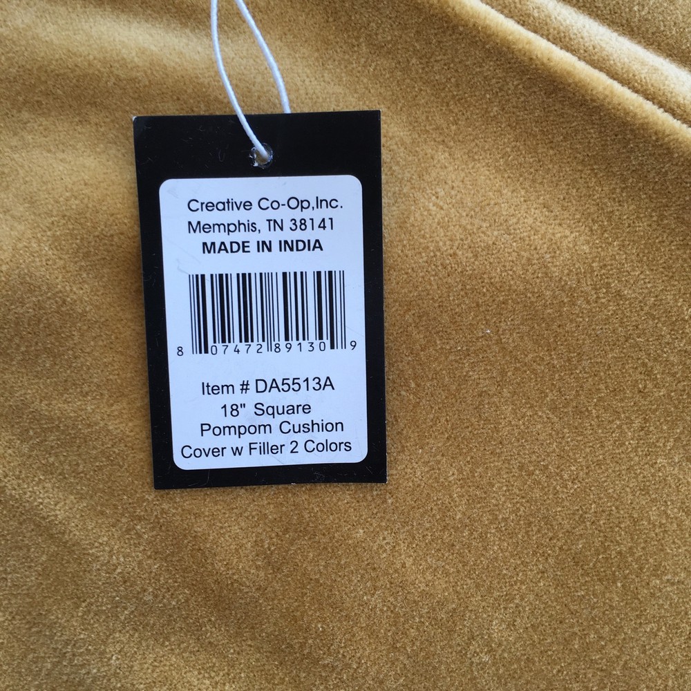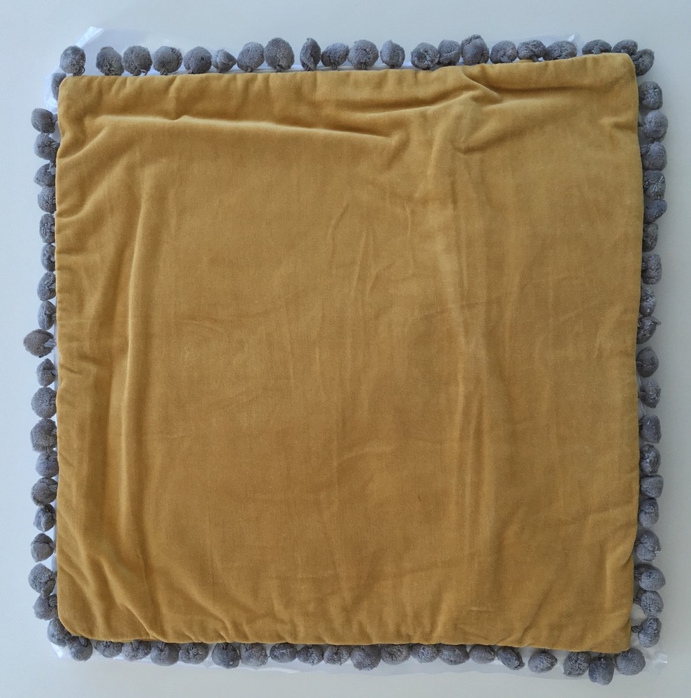 Gold velvet with gray pompoms Comes with insert 18" X 18"...