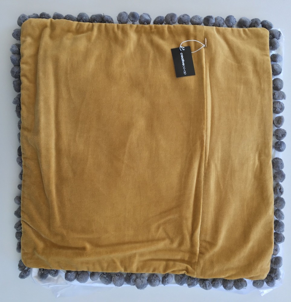 Gold velvet with gray pompoms Comes with insert 18" X 18"