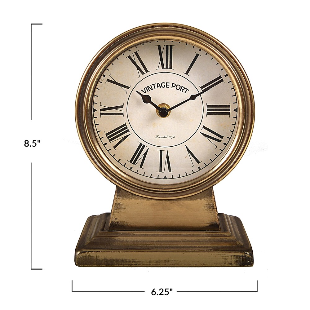 Product details This unique clock is the perfect item for telling time in style. Made out of iron, this antique-inspired clock is perfect for adding a pop of vintage to any space. This statement piece catches the eye effortlessly, and looks great on display in any room. Creative Co-Op is a global leader in wholesale home accessories, designing and distributing an expansive range of lifestyle products to a broad spectrum of retailers worldwide. The ‘Creative’ part of our name revolves around imagination, design, and collaboration with artists. Gold mantle clock gives an antique feel to any space Made out of iron with a gold finish Requires (1) AA battery (not included)