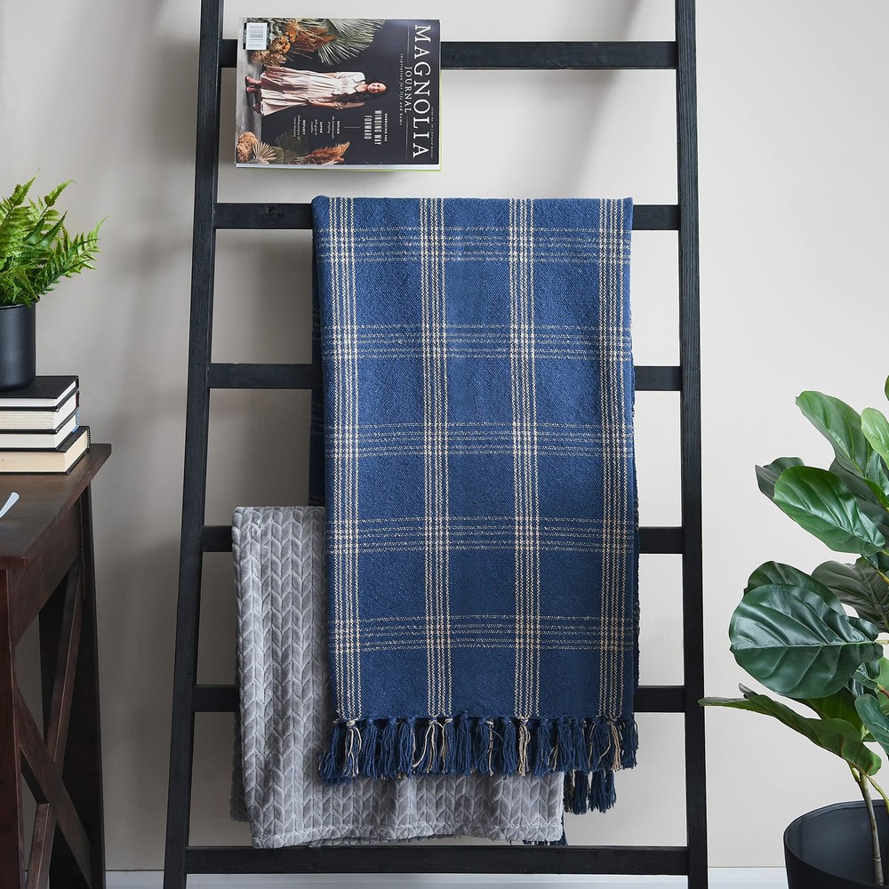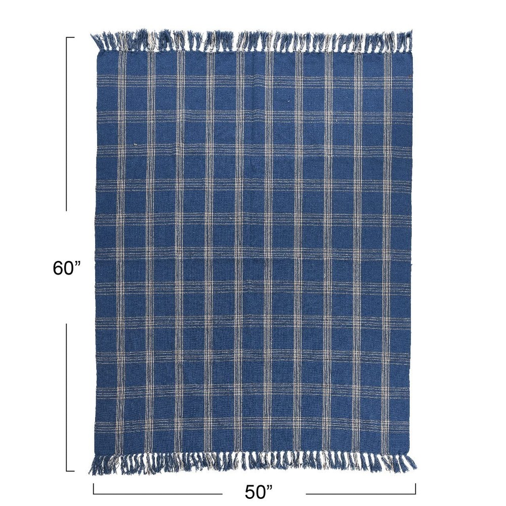This classically designed throw blanket showcases supple, recycled cotton blend construction and a sophisticated plaid print Blue plaid recycled cotton blend throw blanket with fringe Curate a space that reflects your unique sense of style with intentionally designed home décor Made from 100% recycled cotton blend Blanket measures 60 inches L x 50 inches W