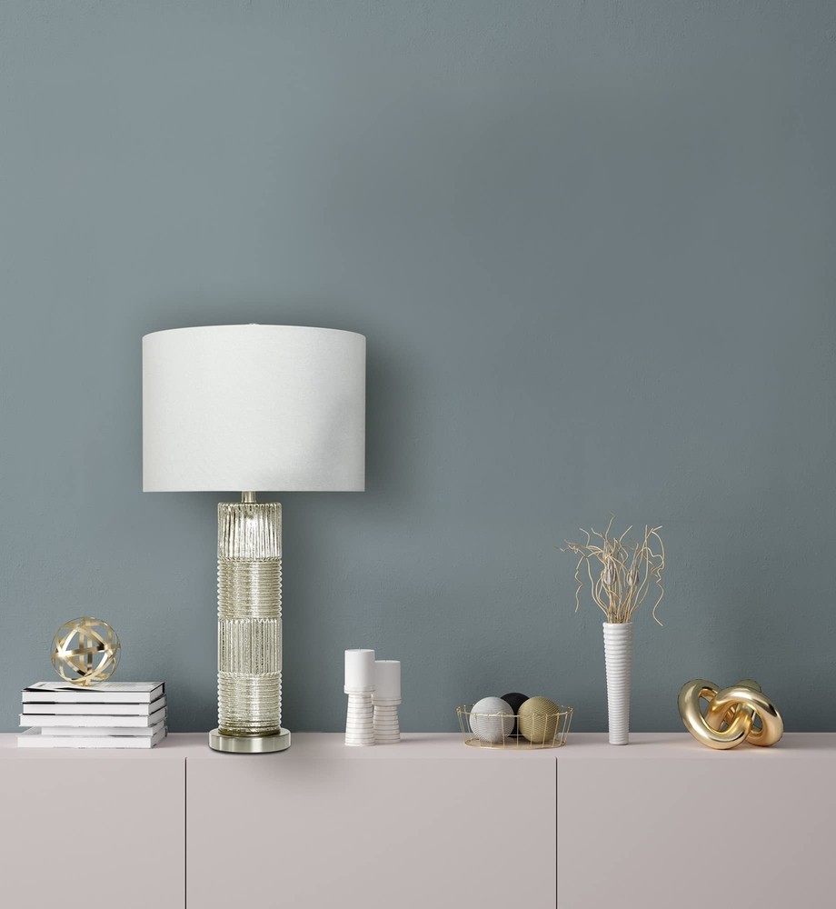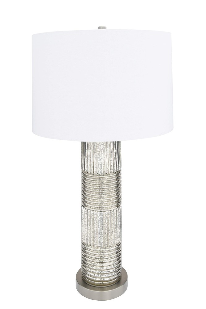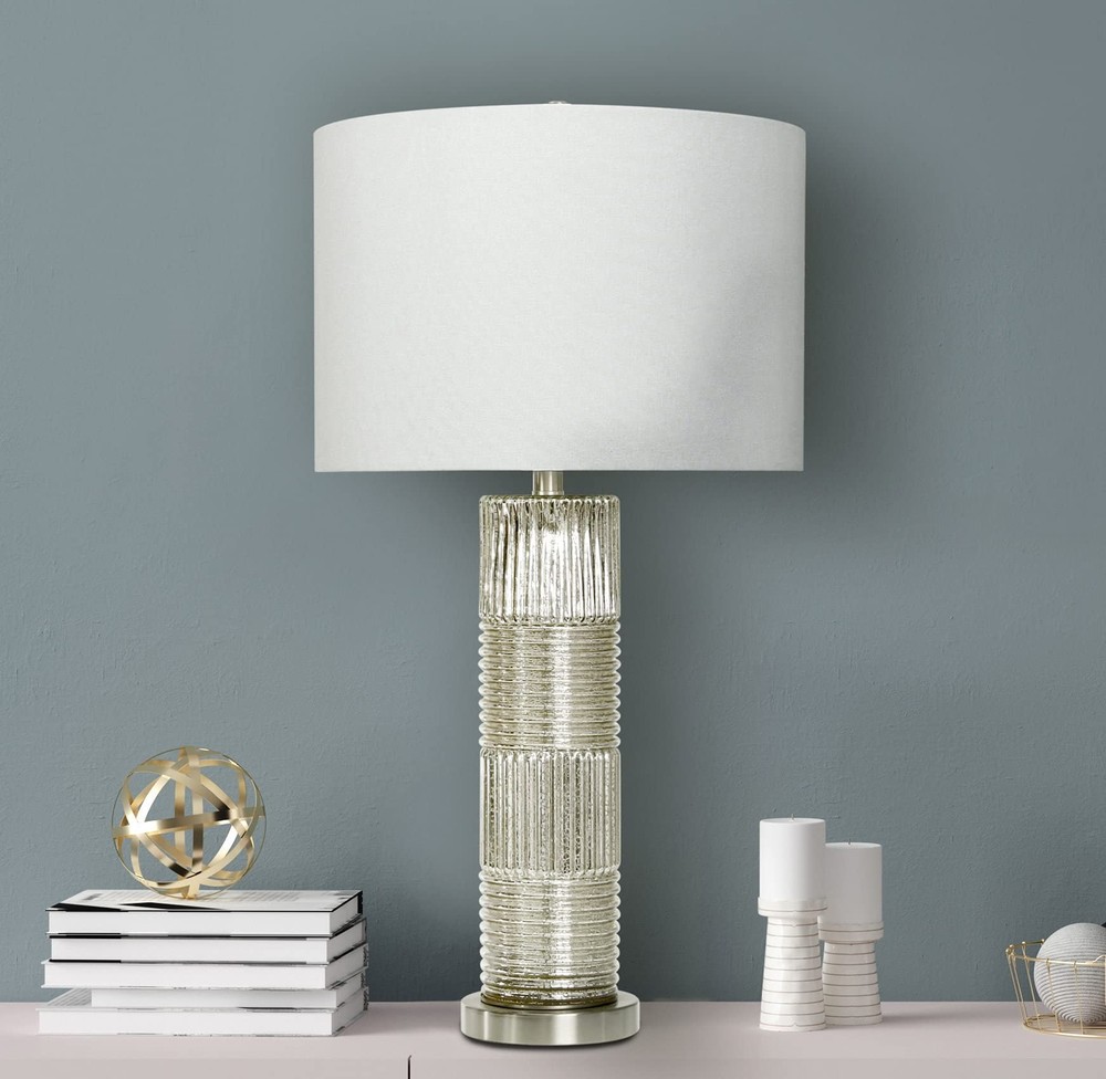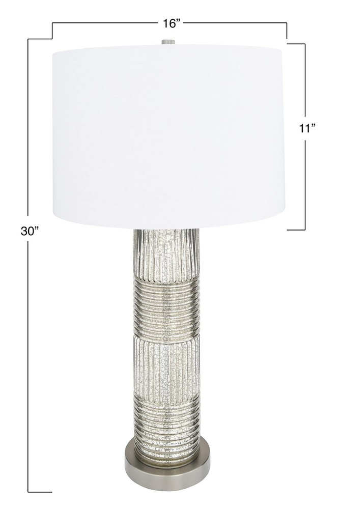 Creative Co-Op Reeded Metal Base Table Lamp, Mercury Glass Product Details Color: Mercury Glass Brand: Creative Co-Op MPN: EC0322 UPC: 191009336495 EAN: 0191009336495 Finish Type: antique Base Material: Metal Bulb Base: E26 Product Dimensions: 16"D x 16"W x 30"H Lamp Type: Table Lamp Finish Type: antique Base Material: Metal Bulb Base: E26 Product Dimensions: 16"D x 16"W x 30"H Lamp Type: Table Lamp Shade Color: White Shade Material: Linen Switch Type: Touch Style: Scandinavian Brand: Creative Co-Op Color: Mercury Glass Special Feature: Corded Light Source Type: LED Material: Glass Recommended Uses For Product: Table Lamps Power Source: Corded Electric Shape: Drum Number of Light Sources: 1 Connectivity Technology: USB Included Components: Linen Shade Is Waterproof: False Mounting Type: Tabletop Wattage: 100 watts Number of Items: 1 Lighting Method: electric Control Method: Touch Indoor/Outdoor Usage: Indoor Specific Uses For Product: Indoor General Purpose Water Resistance Level: Not Water Resistant Installation Type: Tabletop Number of Pieces: 1 Voltage: 5 Volts Is Cordless?: No UPC: 191009336495 Manufacturer: Creative Co-Op Shade Height: 16 Inches Part Number: EC0322 Item Weight: 9.33 pounds Country of Origin: China Item model number: EC0322 Finish: antique Pattern: Solid Item Package Quantity: 1 Special Features: Corded Batteries Required?: No Warranty Description: None. Date First Available: December 26, 2019 Reeded glass with metal base Antiqued French silver hue, mercury glass White linen drum shade 30 inches in height Bulb not included The Lucia collection captures the simple elegance of the Persian style flawlessly blended with the Milanese style of vibrant patterns and natural hues. The clean lines of the reeded glass absorb the light creating a warm shimmering sensation reflecting throughout the base. The luminous hues of the antiqued French silver or the Dove gray adds a captivating sensation to the surroundings.