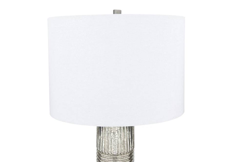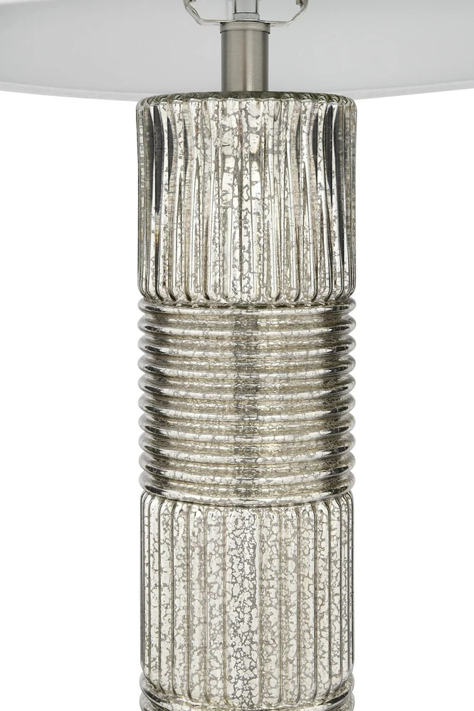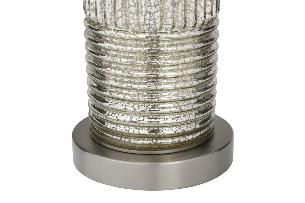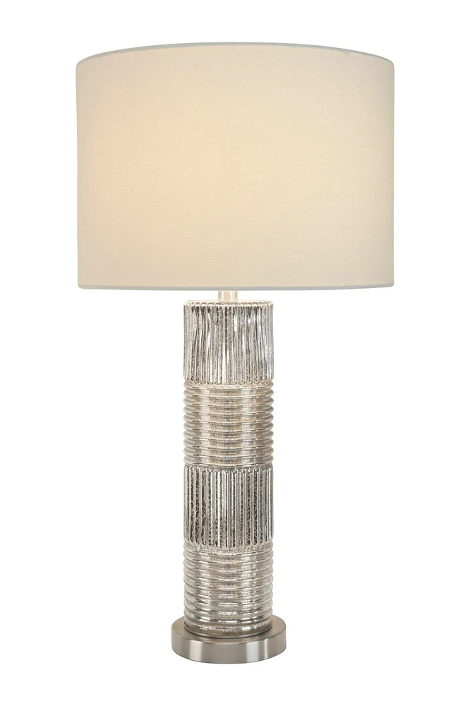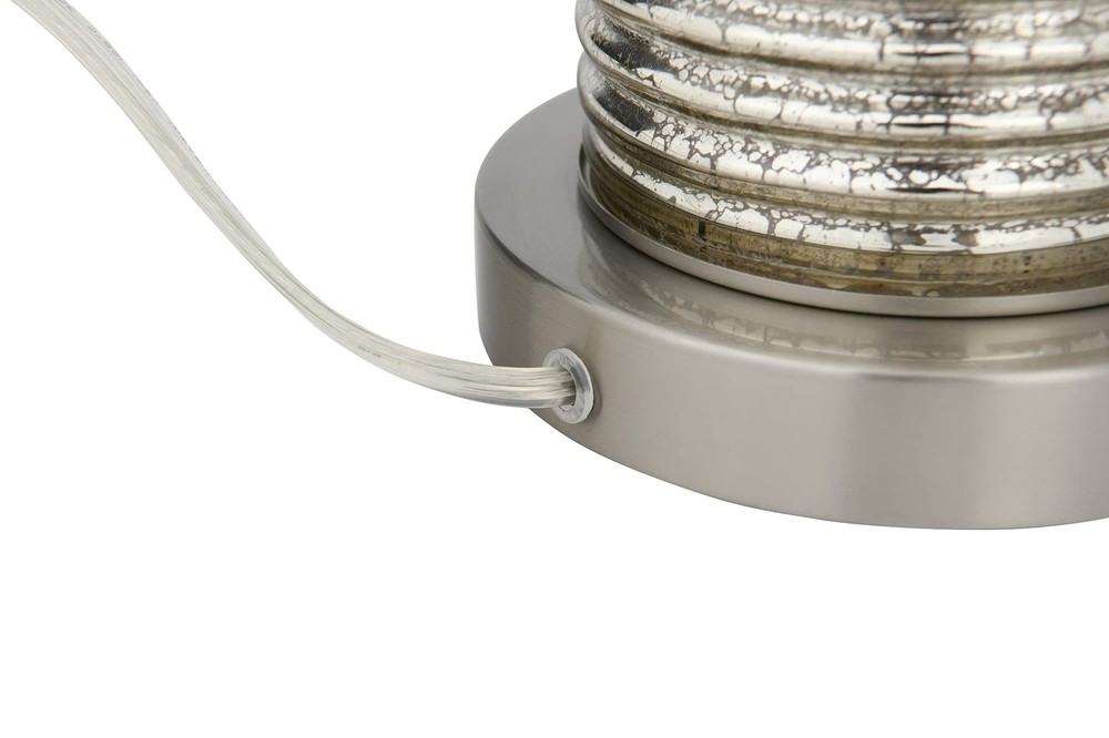 Creative Co-Op Reeded Metal Base Table Lamp, Mercury Glass Product Details Color: Mercury Glass Brand: Creative Co-Op MPN: EC0322 UPC: 191009336495 EAN: 0191009336495 Finish Type: antique Base Material: Metal Bulb Base: E26 Product Dimensions: 16"D x 16"W x 30"H Lamp Type: Table Lamp Finish Type: antique Base Material: Metal Bulb Base: E26 Product Dimensions: 16"D x 16"W x 30"H Lamp Type: Table Lamp Shade Color: White Shade Material: Linen Switch Type: Touch Style: Scandinavian Brand: Creative Co-Op Color: Mercury Glass Special Feature: Corded Light Source Type: LED Material: Glass Recommended Uses For Product: Table Lamps Power Source: Corded Electric Shape: Drum Number of Light Sources: 1 Connectivity Technology: USB Included Components: Linen Shade Is Waterproof: False Mounting Type: Tabletop Wattage: 100 watts Number of Items: 1 Lighting Method: electric Control Method: Touch Indoor/Outdoor Usage: Indoor Specific Uses For Product: Indoor General Purpose Water Resistance Level: Not Water Resistant Installation Type: Tabletop Number of Pieces: 1 Voltage: 5 Volts Is Cordless?: No UPC: 191009336495 Manufacturer: Creative Co-Op Shade Height: 16 Inches Part Number: EC0322 Item Weight: 9.33 pounds Country of Origin: China Item model number: EC0322 Finish: antique Pattern: Solid Item Package Quantity: 1 Special Features: Corded Batteries Required?: No Warranty Description: None. Date First Available: December 26, 2019 Reeded glass with metal base Antiqued French silver hue, mercury glass White linen drum shade 30 inches in height Bulb not included The Lucia collection captures the simple elegance of the Persian style flawlessly blended with the Milanese style of vibrant patterns and natural hues. The clean lines of the reeded glass absorb the light creating a warm shimmering sensation reflecting throughout the base. The luminous hues of the antiqued French silver or the Dove gray adds a captivating sensation to the surroundings.