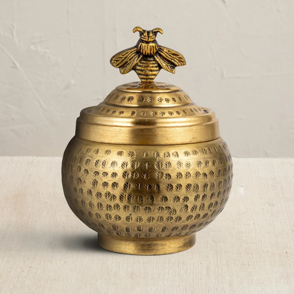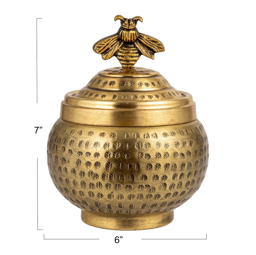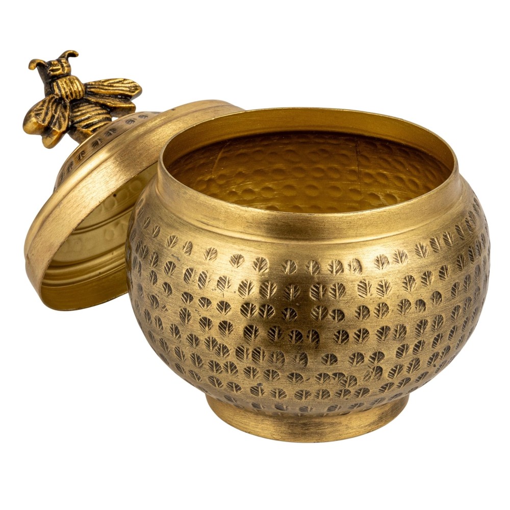 Creative Co-Op Round Hammered Metal Container with Bee Finial, Brass Finish Product Details Style: Bee Brand: Creative Co-Op MPN: EC1885 UPC: 191009730613 EAN: 0191009730613 Brand: Creative Co-Op Color: Gold Material: Aluminum Special Feature: Lidded Style: Bee Brand: Creative Co-Op Color: Gold Material: Aluminum Special Feature: Lidded Style: Bee Recommended Uses For Product: Accessories, For storage Product Dimensions: 6"L x 6"W x 7"H Water Resistance Level: Not Water Resistant Item Weight: 14.08 ounces Opening Mechanism: Lift-Off Lid Shape: Round Pattern: Leaf Number of Items: 1 Number of Compartments: 1 Unit Count: 1.0 Count Item Package Quantity: 1 Material Feature: Durable and Lightweight UPC: 191009730613 Occasion: Housewarming Closure Type: Lift-Off Lid Item Weight: 14.1 ounces Manufacturer: Creative Co-Op Country of Origin: India Item model number: EC1885 Batteries required: No Included Components: Lid A round metal container with a hammered texture, a lid, and a lovely bee finial on top Ideal for farmhouse, cottage, or whimsical style homes A charming and functional container that can store candy, cookies, nuts, or small items; can be displayed on a shelf, table, or mantel Made of metal with a brass finish that gives it a warm and shiny look Measures 6 inches in diameter and 7 inches in height This brass-hammered metal bee container adds charm and personality to the home. This container is made of metal with a brass finish that gives it a warm and shiny look. The container has a round shape and a hammered texture that adds some dimension and interest. The container has a lid that can be easily opened and closed. The lid has a lovely bird finial on top, making it look like a bee is perched on the container. The container can store candy, cookies, nuts, or small items charmingly and functionally. Display this container on a shelf, table, or mantel to create a cozy and inviting atmosphere. The container measures 6 inches in diameter and 7 inches in height. This brass-hammered metal bee container is a charming and functional container that will enhance the beauty and style of the home. Order this today and enjoy a stylish and practical addition to any home.
