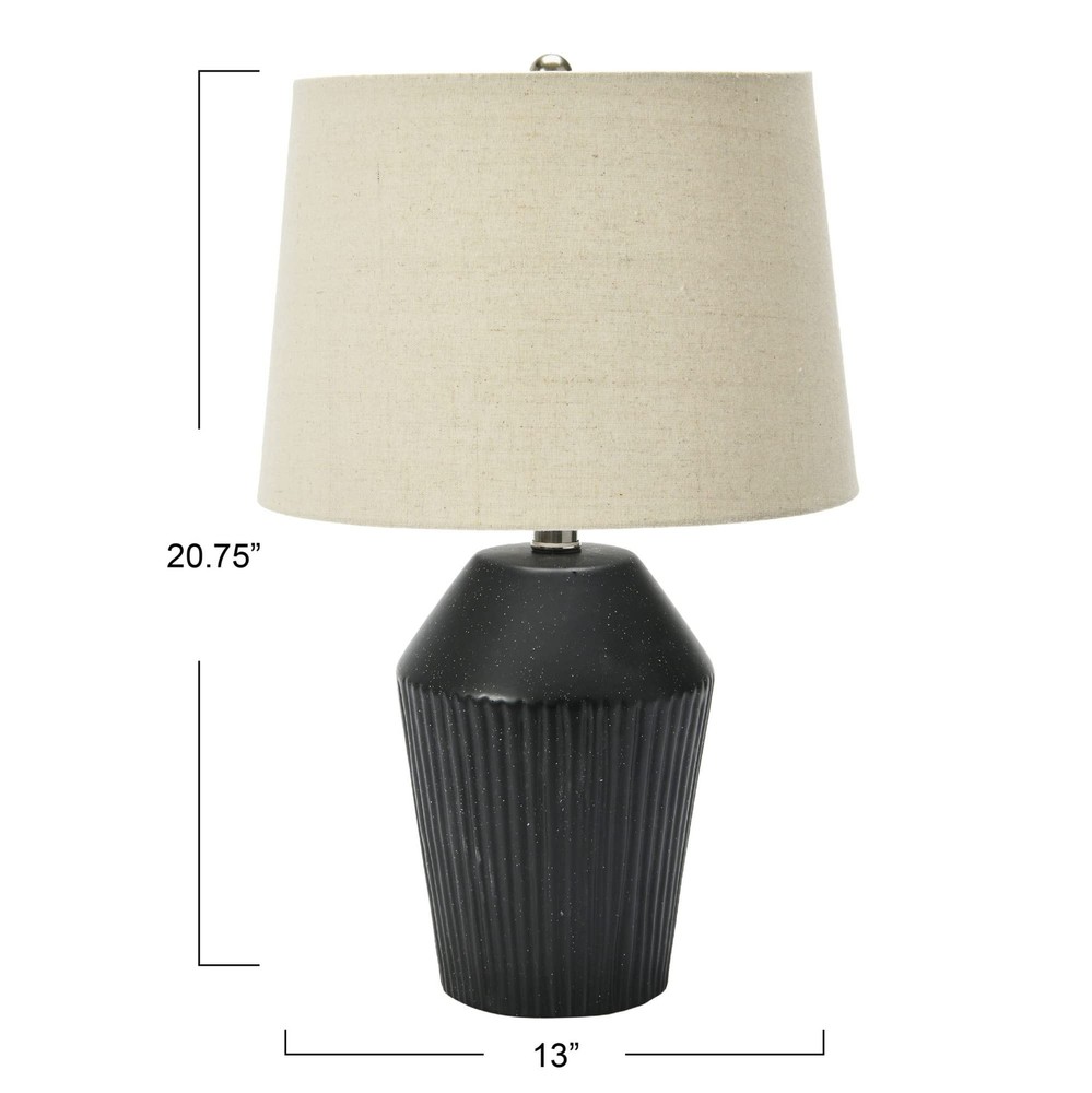 Creative Co-Op Round Stoneware Desk Lamp Product Details Color: Black Brand: Creative Co-Op MPN: EC1034 UPC: 191009474739 EAN: 0191009474739 Finish Type: Black Finish,Rustic,Speckled Finish Base Material: Stone Bulb Base: E26 Product Dimensions: 13"D x 13"W x 20.75"H Lamp Type: desk lamp,table lamp Finish Type: Black Finish,Rustic,Speckled Finish Base Material: Stone Bulb Base: E26 Product Dimensions: 13"D x 13"W x 20.75"H Lamp Type: desk lamp,table lamp Shade Color: black Shade Material: Linen Switch Type: Touch Style: Modern Brand: Creative Co-Op Color: Black Special Feature: USB Light Source Type: LED Material: Stoneware Room Type: Office Recommended Uses For Product: Reading Power Source: Corded Electric Shape: Drum Number of Light Sources: 1 Connectivity Technology: USB Included Components: Bulb Is Waterproof: False Mounting Type: Tabletop Wattage: 60 watts Number of Items: 1 Lighting Method: LED Control Method: Touch Indoor/Outdoor Usage: Indoor Specific Uses For Product: Reading Water Resistance Level: Not Water Resistant Installation Type: Tabletop Number of Pieces: 1 Connectivity Protocol: Other UPC: 191009474739 Manufacturer: Creative Co-Op Item Weight: 5.74 pounds Country of Origin: China Item model number: EC1034 Finish types: Black Finish,Rustic,Speckled Finish Batteries required: No This elegant, vertically embossed stoneware desk lamp features a modern geometric base topped with a linen drum shade Stoneware table lamp with black finish and natural linen drum shade Add a subtle touch of style and sophistication to a home office or living space with this artfully crafted table lamp Maximum 60 watt lightbulb (not included) Lamp measures 20.75" H x 13" L x 13" W; 5' Cord Lighting meets modern art in this striking, sculptural table lamp; The embossed geometric base in a speckled finish imparts a hand-crafted feel, perfectly complemented by a classic linen drum shade, resulting in a versatile piece with both rustic and modern appeal