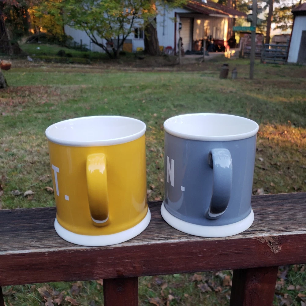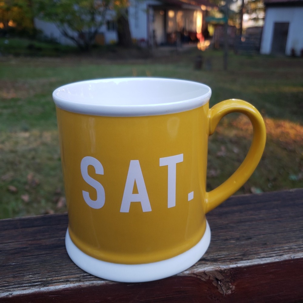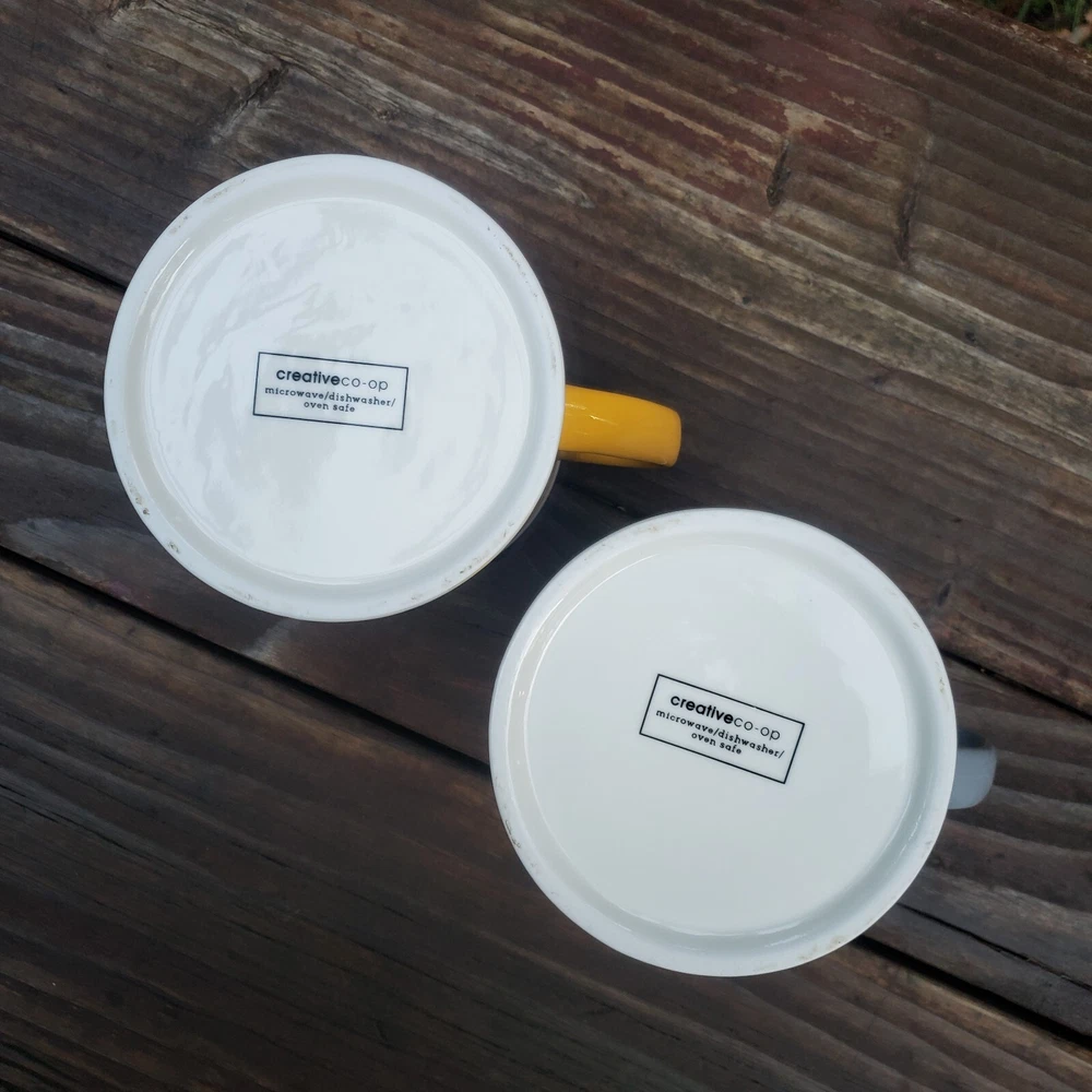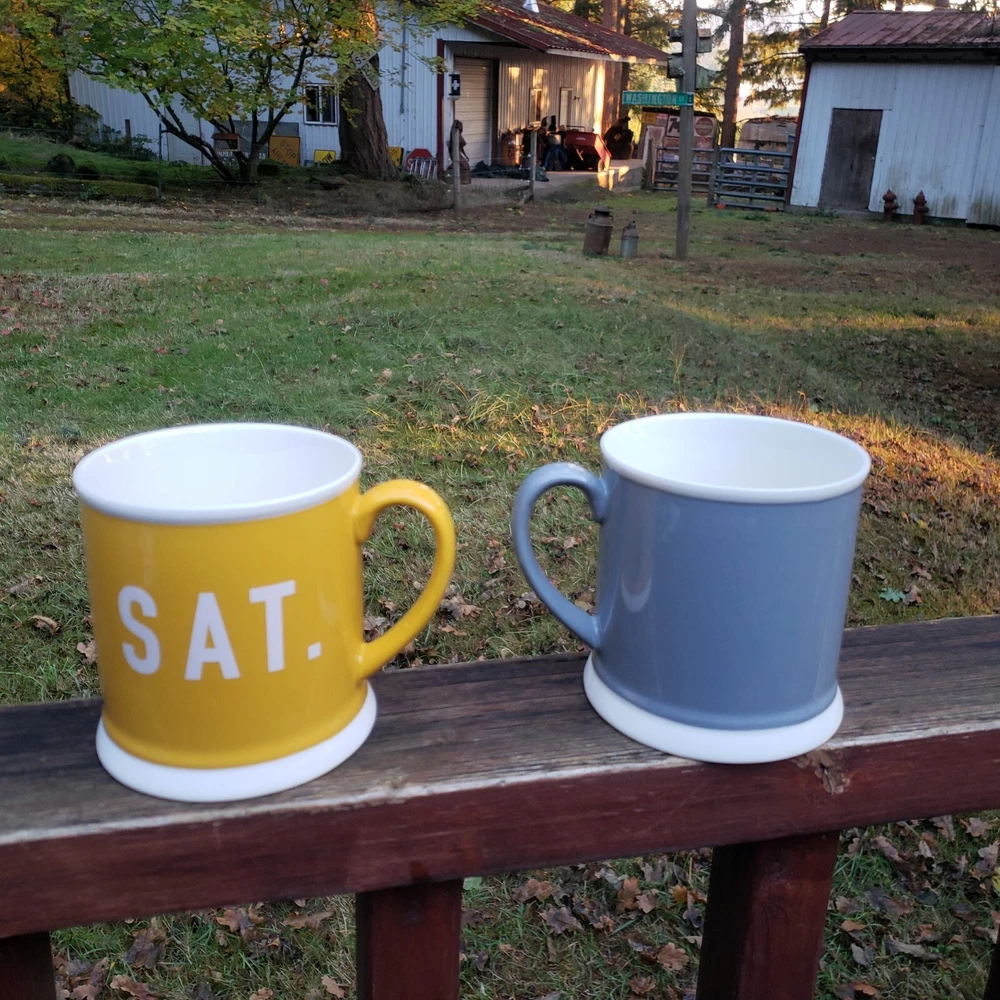 Creative Co-Op Saturday and Sunday Coffee Mugs. Brand: Creative Co-Op. You get (2) Mugs. One is YELLOW and says SAT. and the other one is GRAY and says, SUN. They also have a white line around the rim and at the very bottom on the outside as well. They both have a great handle! They the same mug style but just a different color and different day of the week. Inside of both mugs it's white. Bottom says, Microwave/Dishwasher/Oven Safe. Bottoms of each mug where ceramic is bare and has no glaze there's some dirt from moving around and sliding in cabinet, nothing too horrible. [ Top To Bottom : ABOUT 4" TALL] [ Diameter : ALMOST 4"]
