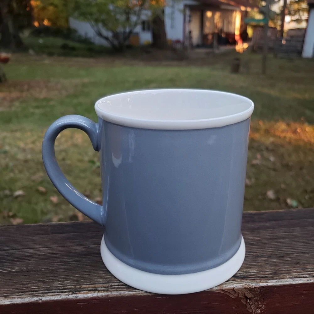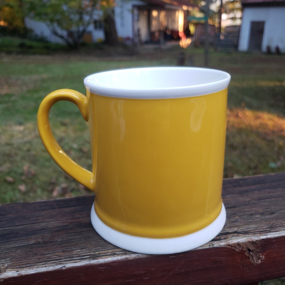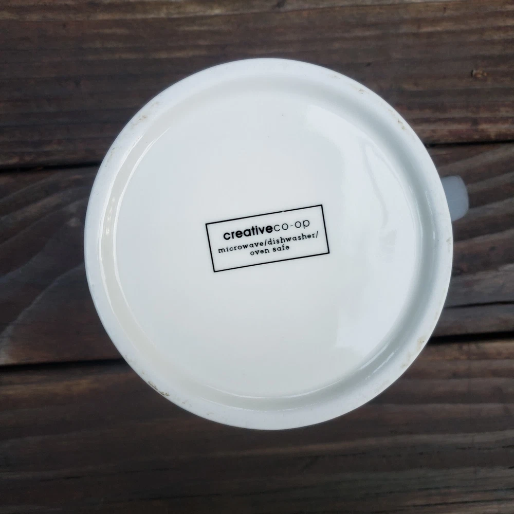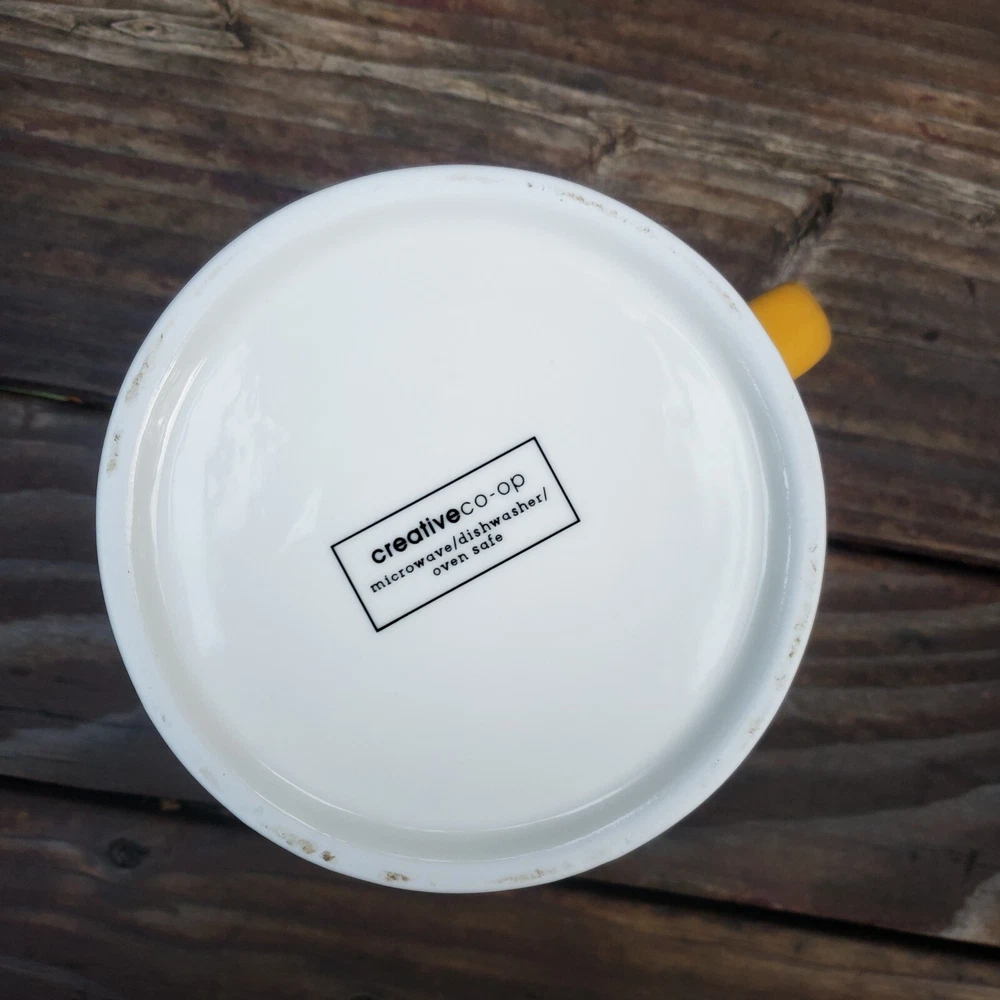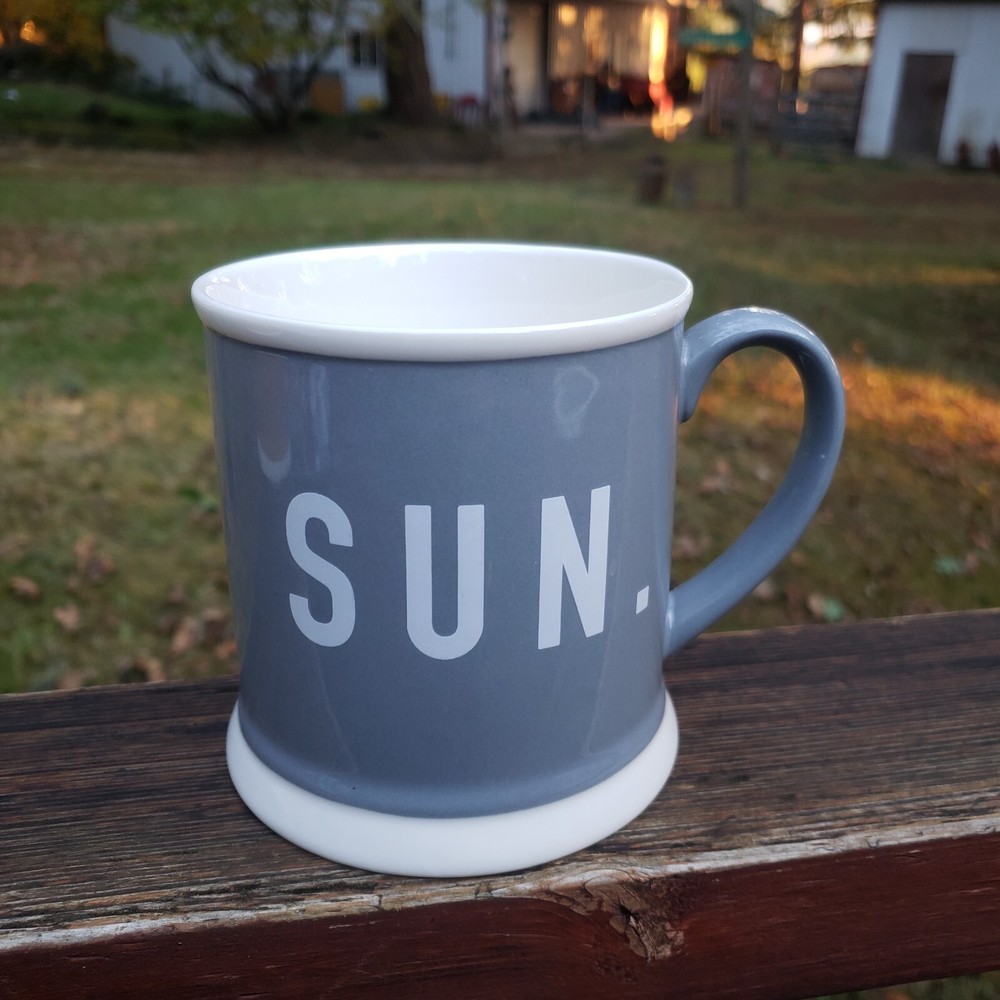 Creative Co-Op Saturday and Sunday Coffee Mugs. Brand: Creative Co-Op. You get (2) Mugs. One is YELLOW and says SAT. and the other one is GRAY and says, SUN. They also have a white line around the rim and at the very bottom on the outside as well. They both have a great handle! They the same mug style but just a different color and different day of the week. Inside of both mugs it's white. Bottom says, Microwave/Dishwasher/Oven Safe. Bottoms of each mug where ceramic is bare and has no glaze there's some dirt from moving around and sliding in cabinet, nothing too horrible. [ Top To Bottom : ABOUT 4" TALL] [ Diameter : ALMOST 4"]