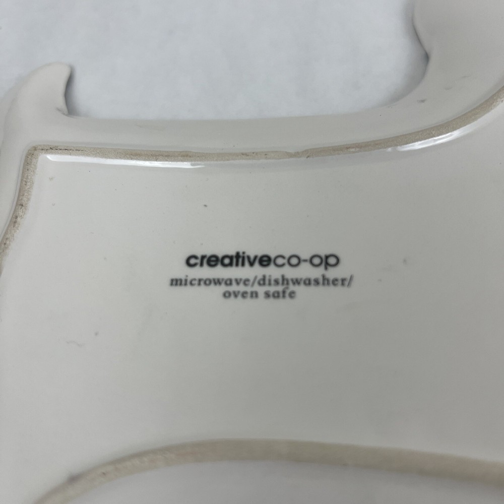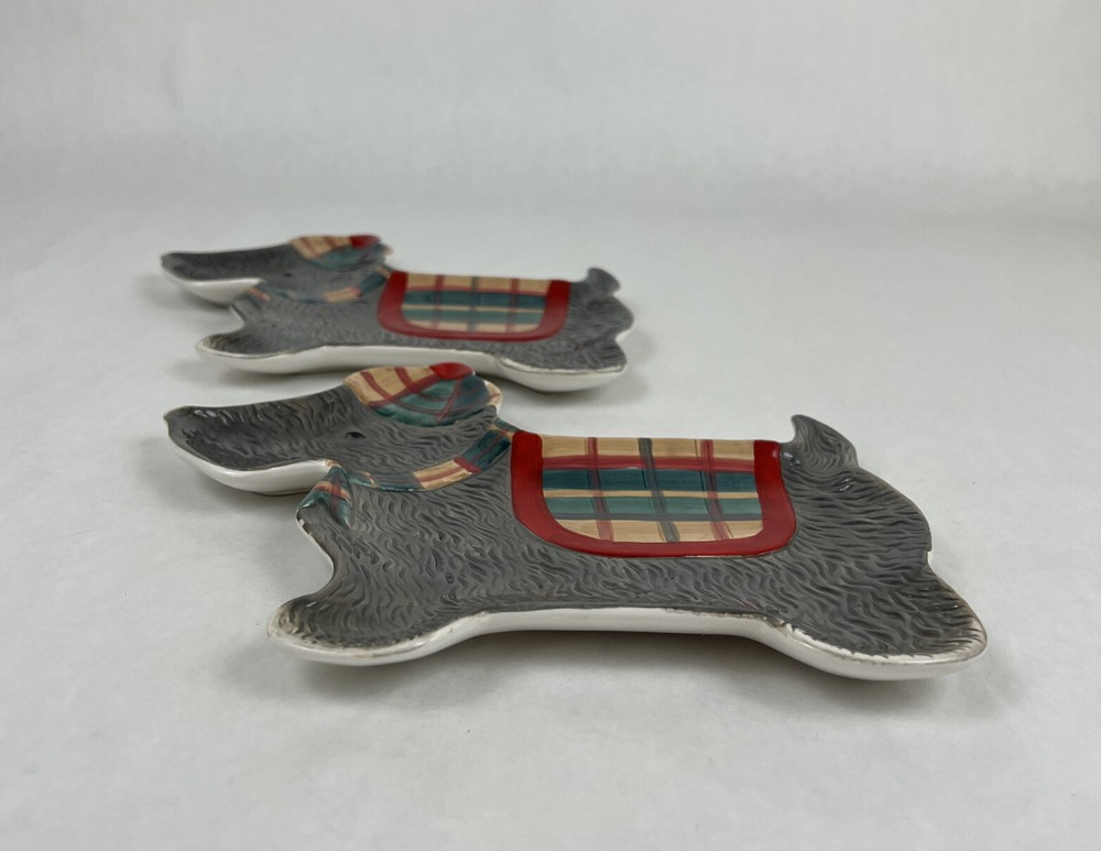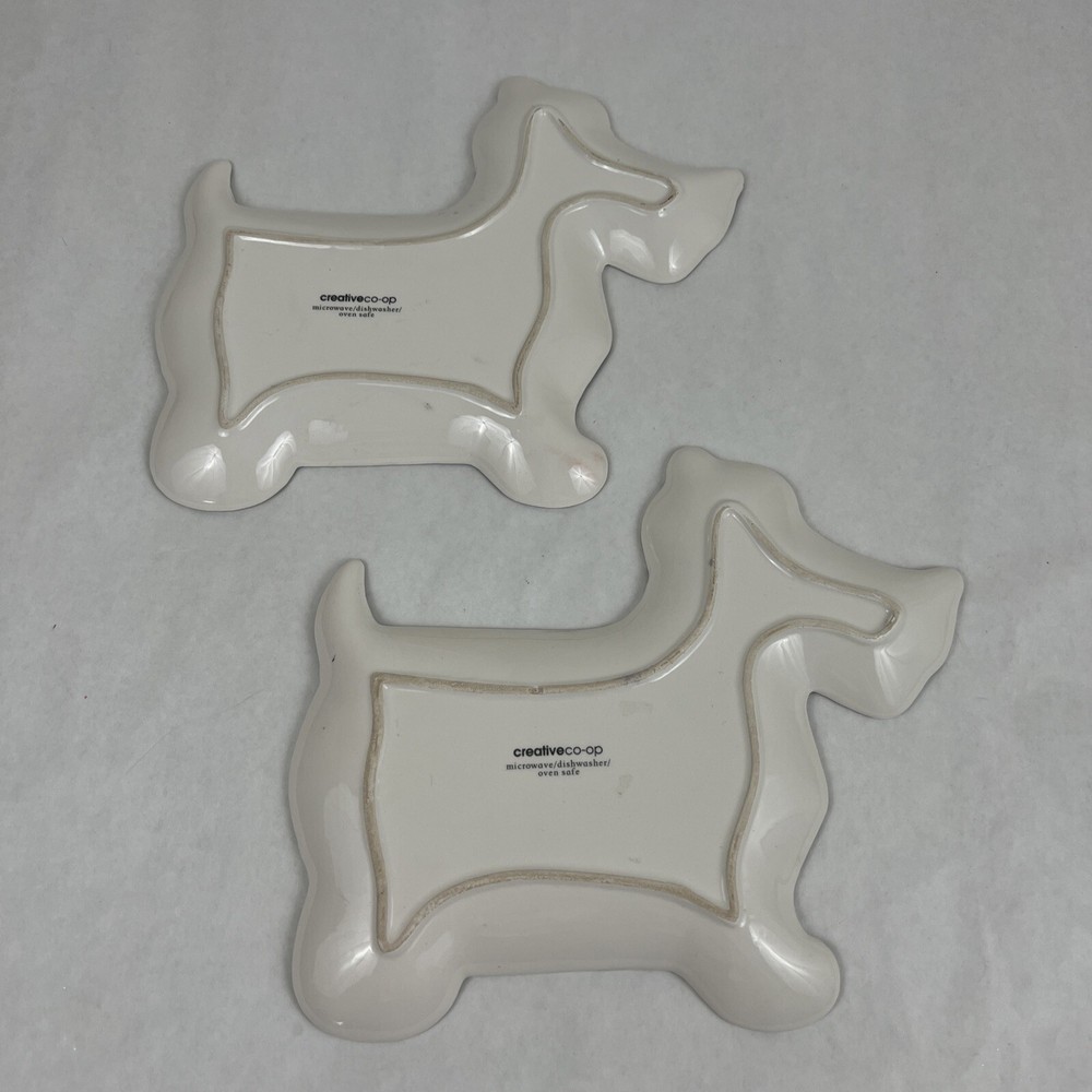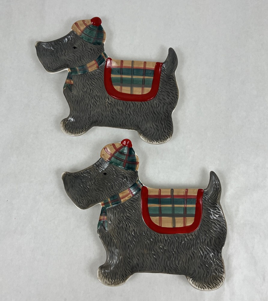 Creative Co-Op Scottie Dog Dish Platters Set Of Two Tis The Season Collection. Bring in the holiday season with this pair (2 plates) of Scottie Dog decorative ceramic plates - shaped like the dog - from Creative Co-op's Tis' The Season" Christmas collection (though not sure of year). The plates feature charming Scottie dogs with gray fur. The the dog is wearing a traditional Scottish plaid in Christmas Red & Green with a red pom pom. The Scotties are also wearing a green and ivory plaid scarf and a matching doggie coat trimmed in red. Microwave/dishwasher/oven safe. There are no chips or cracks. Please see pictures for all imagery detail. Thanks:)