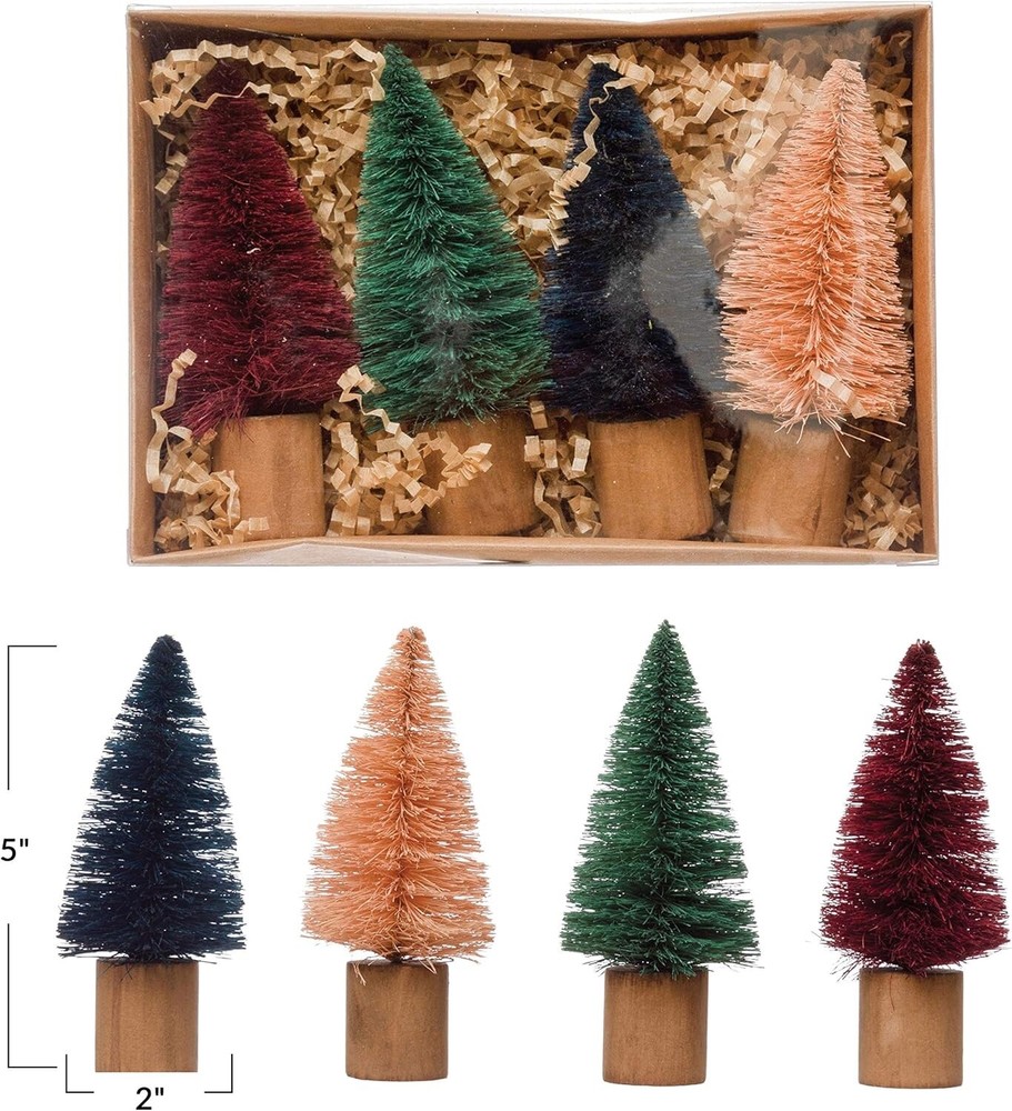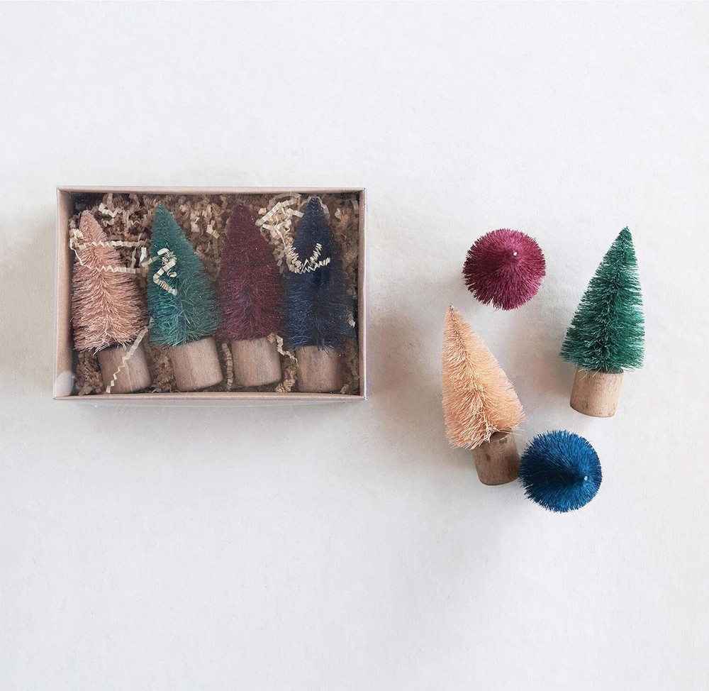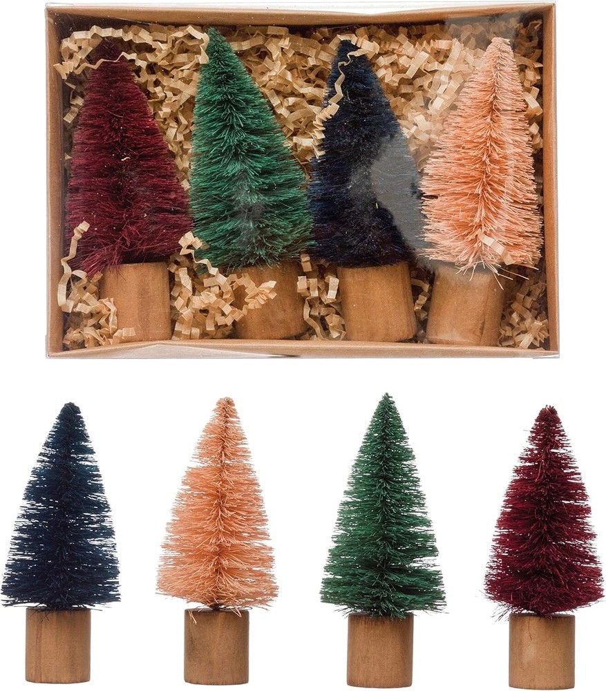 Creative Co-Op 2" Round x 5" H Sisal Bottle Brush Trees w/Wood Base, Multi Color, Boxed Set of 4 Figures and Figurines, Blue/Green/Red/Yellow From the Deck The Halls Collection Winter and Christmas decor Figures and Figurines 7.5" x 2.25" x 5.25"