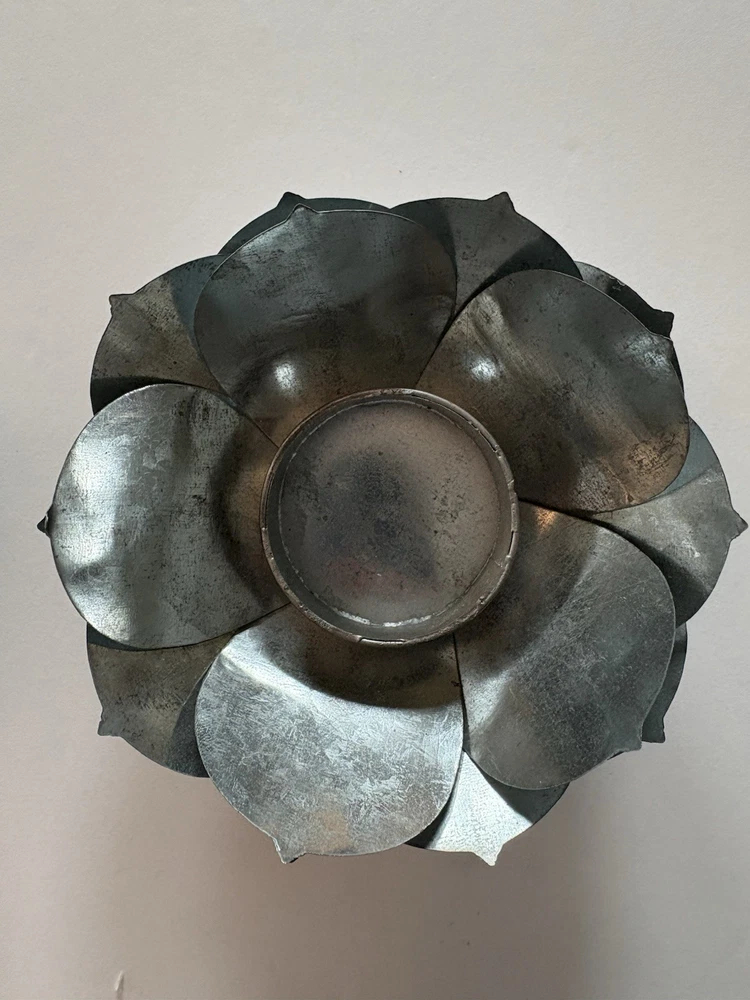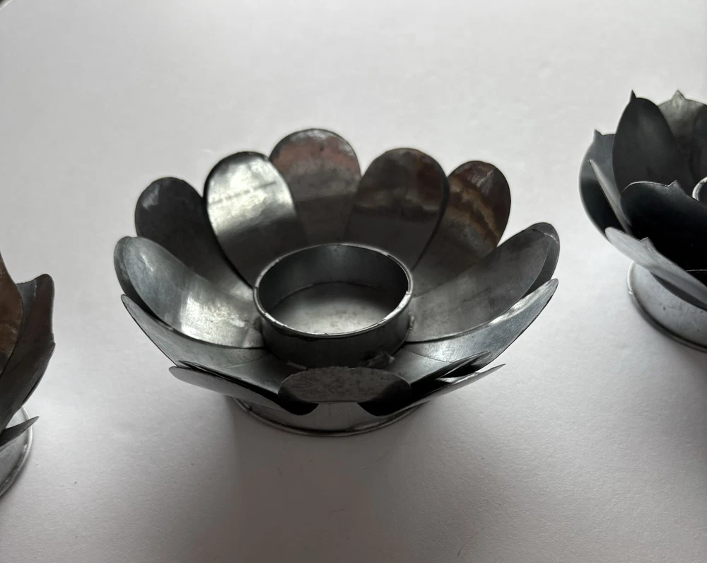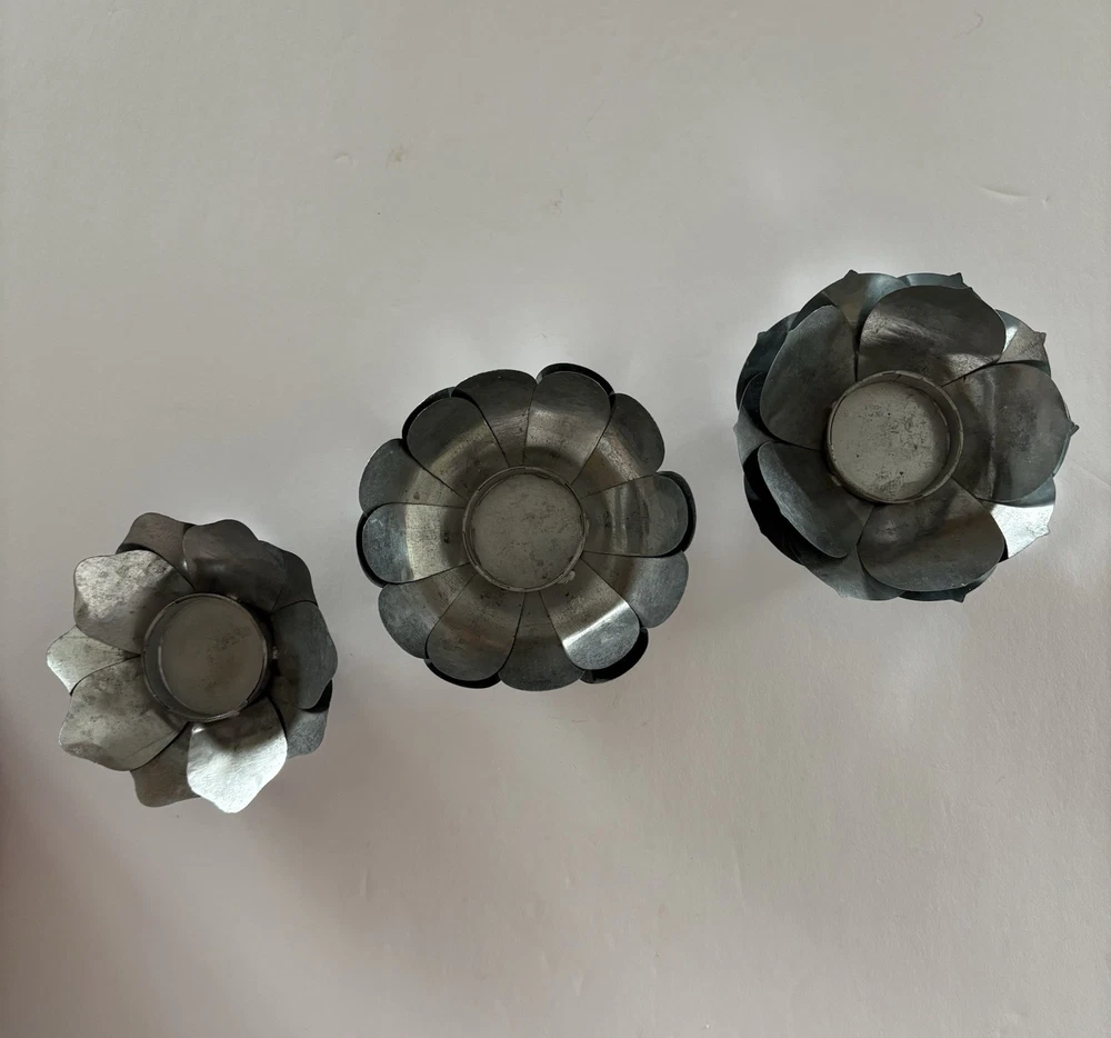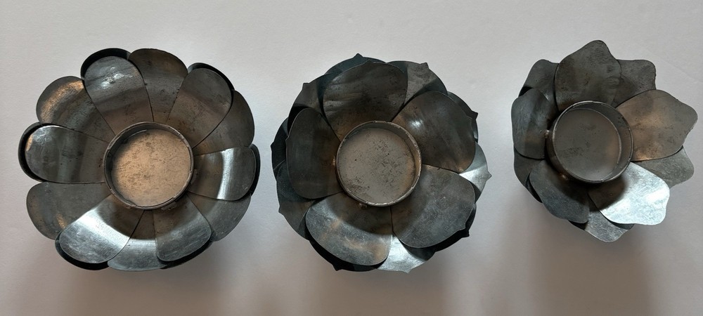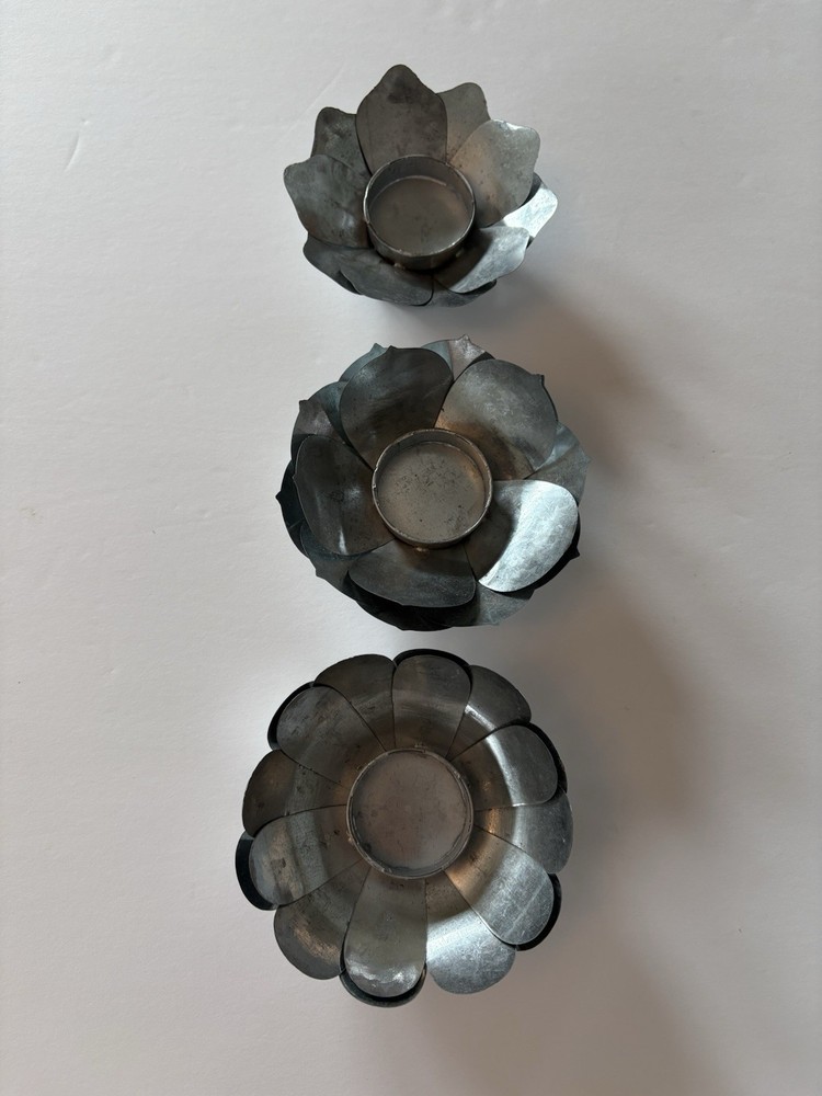 Set of three different styles lotus flower tea-light candle holders made of metal. Base is also metal. Two are the same size and the third one is a little smaller. The larger ones measure approximately 1.5”x 4.5”. Smaller one measures slightly under that measurement. Smoke free home. Excellent condition. BC