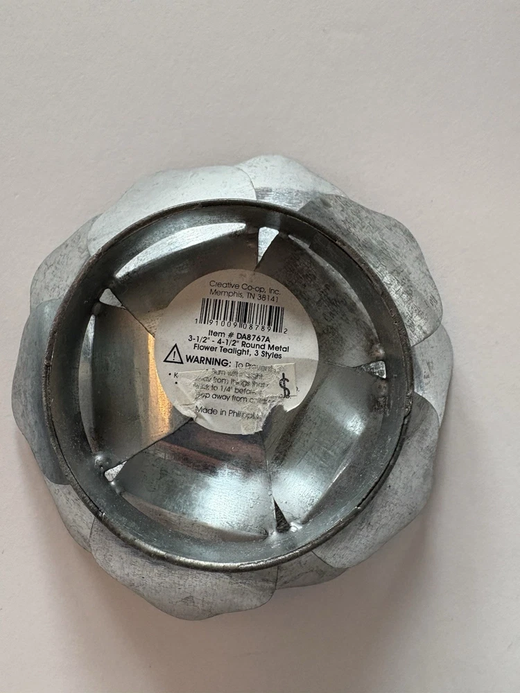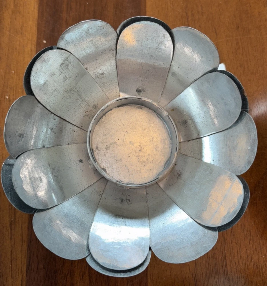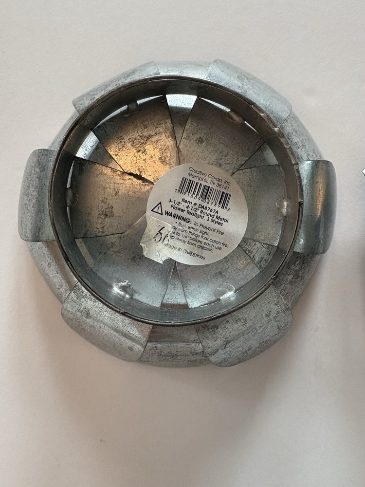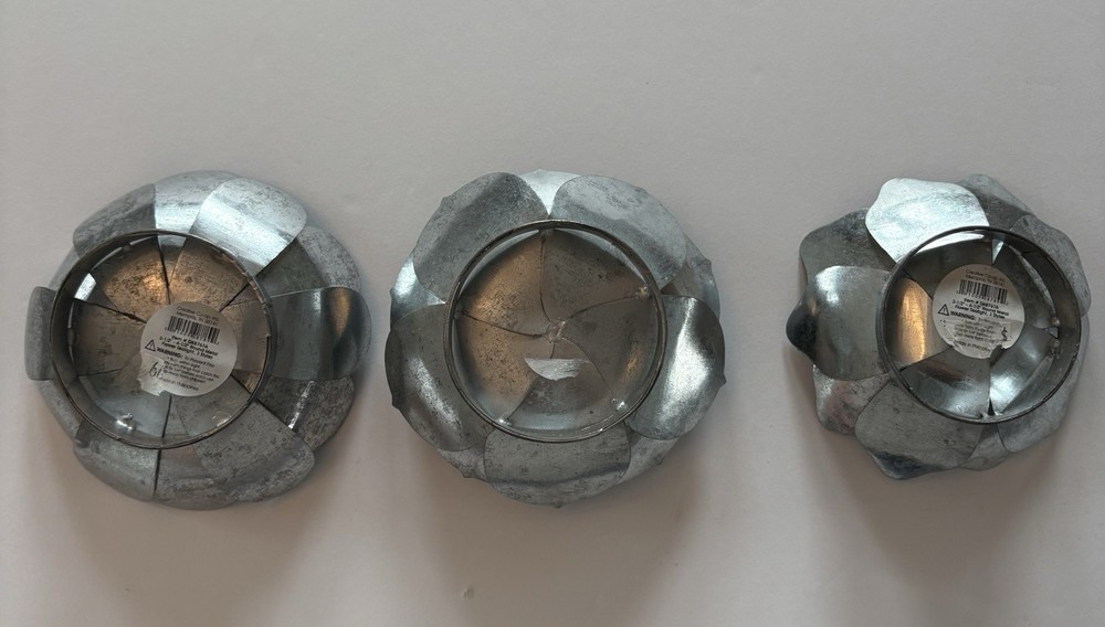 Set of three different styles lotus flower tea-light candle holders made of metal. Base is also metal. Two are the same size and the third one is a little smaller. The larger ones measure approximately 1.5”x 4.5”. Smaller one measures slightly under that measurement. Smoke free home. Excellent condition. BC