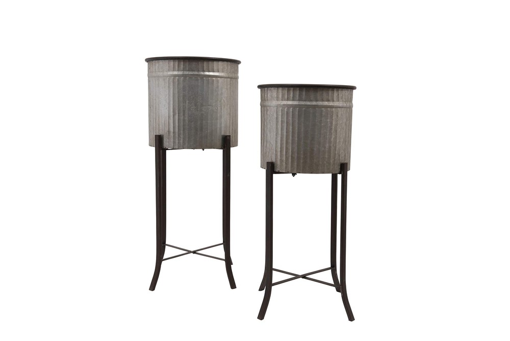 Creative Co-Op Set of 2 Iron Planters on Stands ✓ Free 60 Day Returns ✓ Free Express Shipping Description: Mix and match our carefully curated collection of standing, wall mount, and decorative pots and planters. Explore a vast array of textures, hues, and silhouettes to create a personalized indoor jungle, including planters on stands, wall buckets, oversized pots, hanging planters, figurine planters, window boxes, footed pots, and so much more. Choose from a wide array of materials from stoneware and ceramic to metal and glass, and styles from contemporary boho and classic farmhouse to mid-century modern and vintage glam. Showcase lovingly grown herbs and greenery inside pieces from this artfully crafted collection, or simply use as a stylish cover for low- maintenance faux flora. Features: This rustic set of metal planters features a classic, corrugated texture and attached, sleek metal stands Display in a living space of any style from country to cottagecore Holds 10 inch and 12 inch diameter pots Made from 100% iron Planters measure 13.5 inches diameter x 30.75 inches H, 11.75 inches diameter x 27 inches H Product Details: Material: Metal Color: Silver Special Feature: Sturdy Style: Transitional Planter Form: Plant Pot Material: Metal Color: Silver Special Feature: Sturdy Style: Transitional Planter Form: Plant Pot Shape: Round Indoor/Outdoor Usage: Indoor Mounting Type: Freestanding Plant or Animal Product Type: Herb Product Dimensions: 13.2"D x 13.2"W x 30.7"H Brand: Creative Co-Op Number of Pieces: 2 Pattern: Solid Included Components: Corrugated Metal Planter Set with Stands Theme: Home & Garden Finish Type: Metal Number of Levels: 1 Item Weight: 15.29 Pounds UPC: 807472951102 Global Trade Identification Number: 02 Size: 30-3/4"H Item Weight: 15.29 pounds Manufacturer: Creative Co-op Country of Origin: China Item model number: DA6878 Is Discontinued By Manufacturer: No Finish types: Metal Assembly required: No Batteries required: No