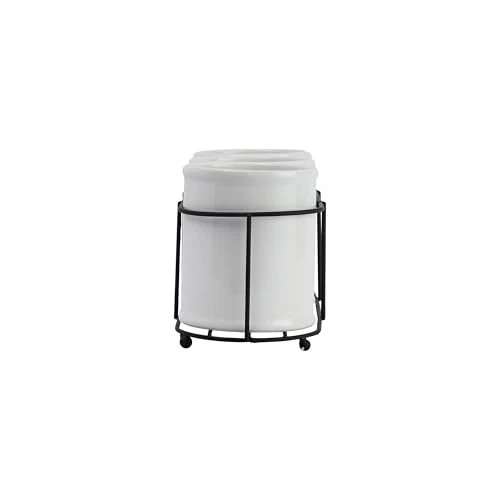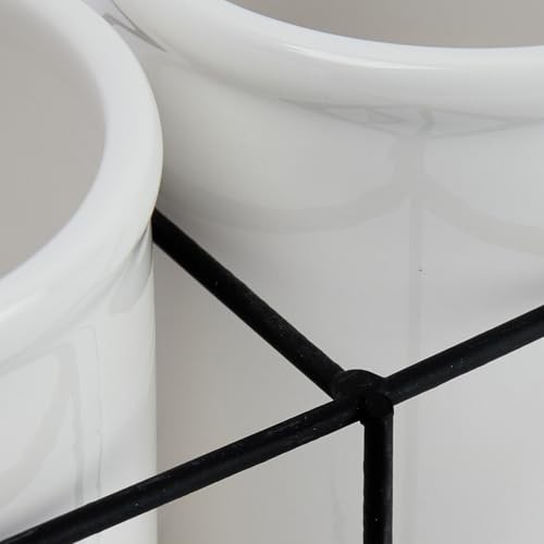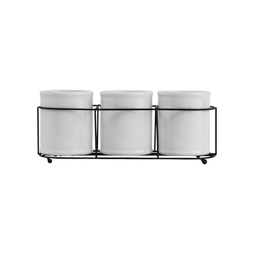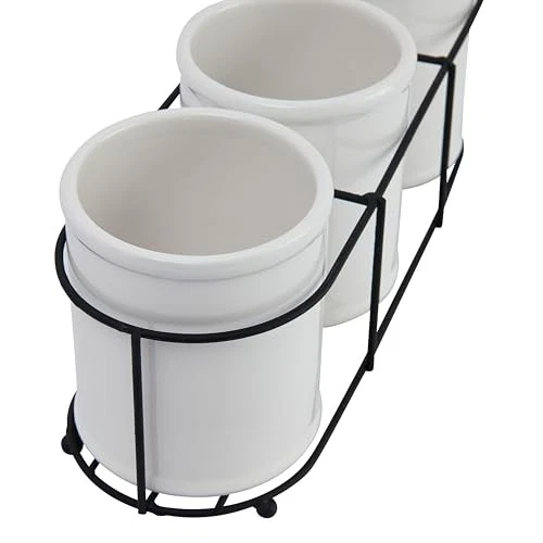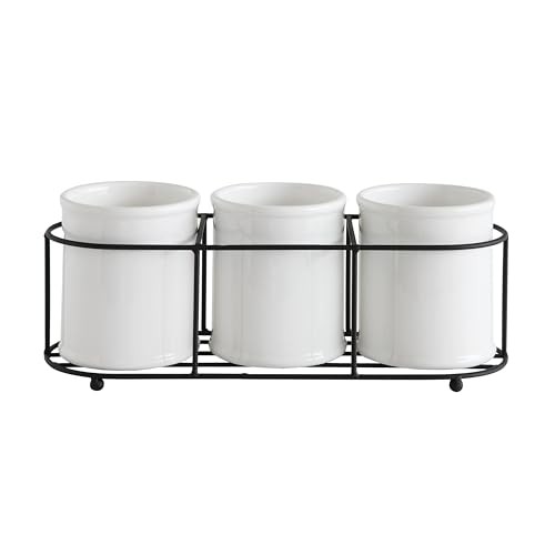 Product Page Set of 3 White Ceramic Crocks in Black Metal Holder Home Description: Intentionally curate a fashionable, yet functional kitchen or dining area with Creative Co-Op's thoughtfully crafted collection of kitchen and food storage, designed to transform clutter while adding style and convenience to the space. Peruse a vast selection of unique, display-worthy pieces created to stylishly streamline a well-loved cooking or baking station, including lidded containers with rubber seals, cookie jars, utensil holders, and so much more. Choose from a wide array of materials from hammered aluminum and terracotta to stoneware and ceramic, and styles from mid-century modern and coastal to classic farmhouse and cottage. Elegantly stow kitchen tools, frequently used ingredients, or odds and ends with kitchen and food storage that is sure to impress. Features: This cottage-inspired set of stoneware 3 crocks features simple silhouettes on a sleek metal stand Utilize this piece in the kitchen to separate silverware, in the bathroom for easy access to q-tips and toothbrushes, or as a decorative accent to display dried florals Wipe clean with dry cloth Made from dolomite and iron Set measures 11.5 inches L x 3.75 inches W x 4.25 inches H; Each crock measures 3.25 inches diameter x 4.25 inches H
