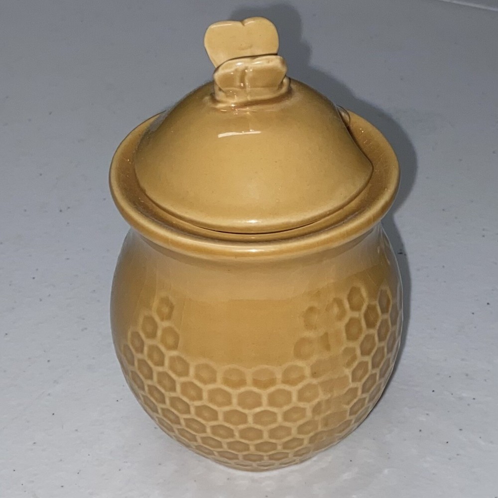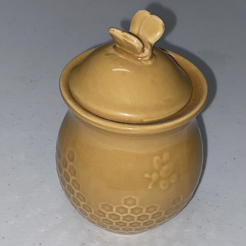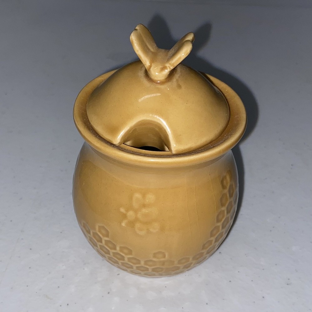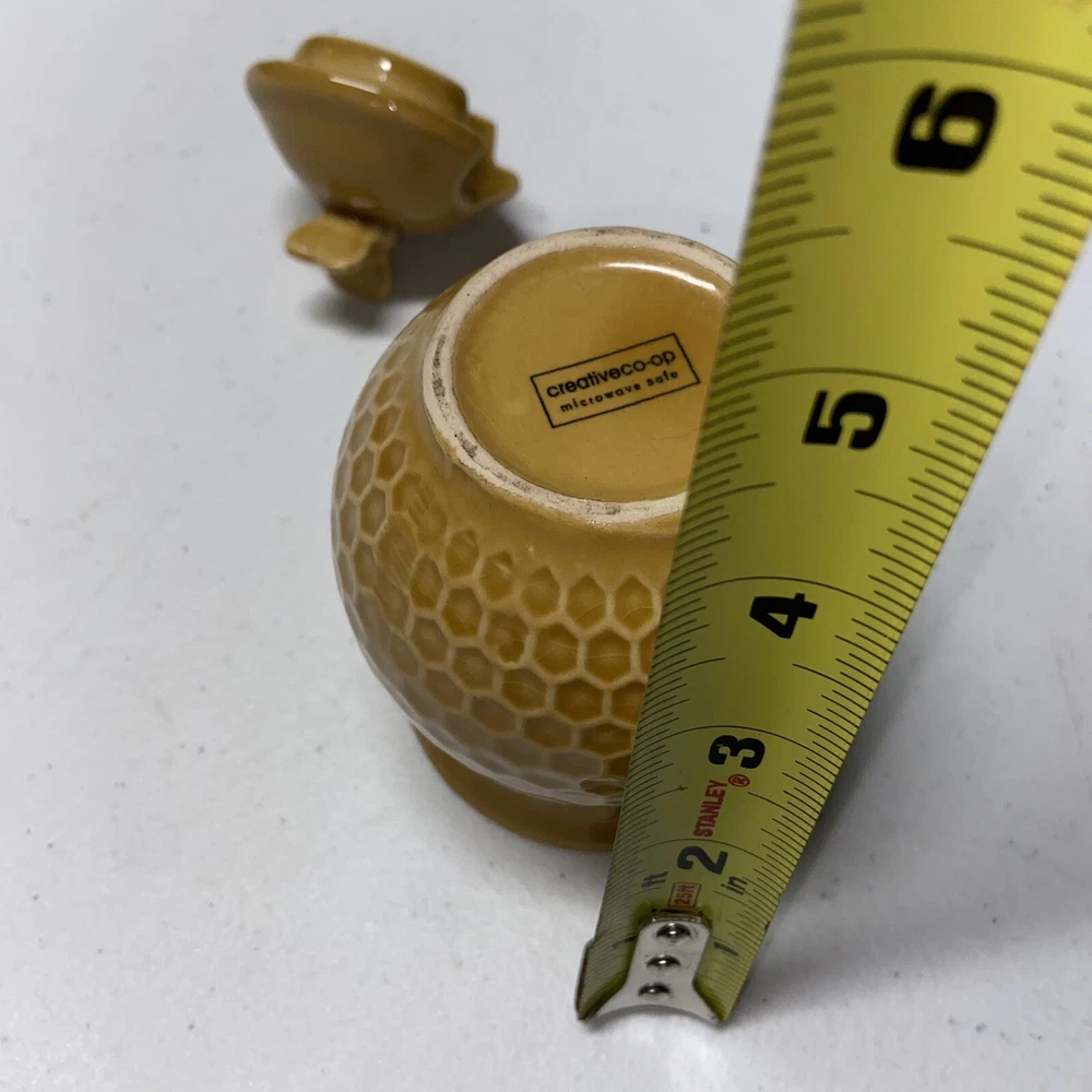 This Creative Co-Op stoneware honey jar is the perfect addition to your kitchen storage, decor & convenience. The round shape, country dark yellow color, and classic style make it a charming decorative piece as well. The jar comes with a bee handle/lid, making it easy to store and access your favorite honey. (No honey stick) Made from high-quality stoneware and ceramic materials, this honey jar is microwave safe and reusable. It measures 5 inches in height. Whether you're a fan of Creative Co-Op or just looking for a functional and stylish honey jar, this is the perfect choice. Excellent used condition no breaks or chips - Photos show all. Measurements in photos