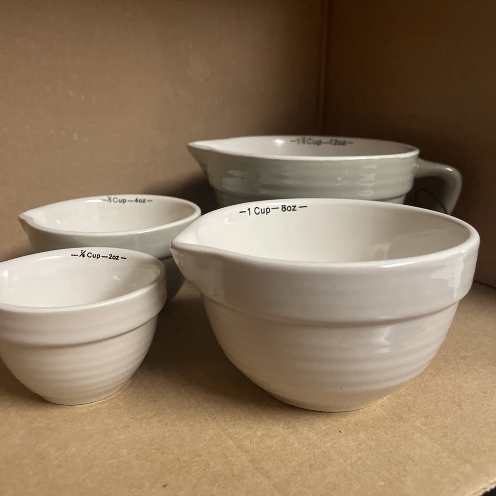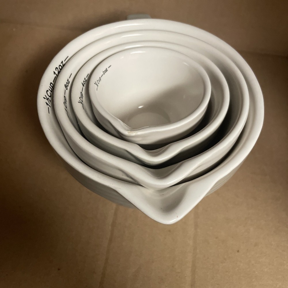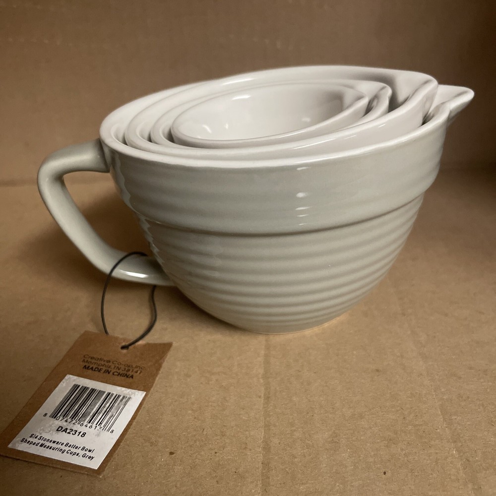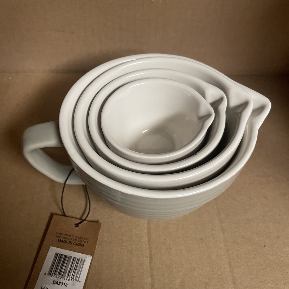 Upgrade your kitchen with this Creative Co-Op Stoneware Bowl Shaped Stackable Measuring Cups Set of 4 in Grey. These ceramic measuring cups are perfect for all occasions and feature a shape that allows them to be stacked for easy storage. With a weight of 1.8 lbs, these measuring cups are durable and offer multiple capacities for all your measuring needs. The set includes four measuring cups and is ideal for anyone who loves to cook or bake. These measuring cups are made in China and are a great addition to your kitchen tools and gadgets collection. The grey color is perfect for any kitchen décor, and the set is sure to impress your guests. Get your hands on this must-have measuring cup set today! New with tags. Never used. Small defect in glaze of ceramic (see photos).