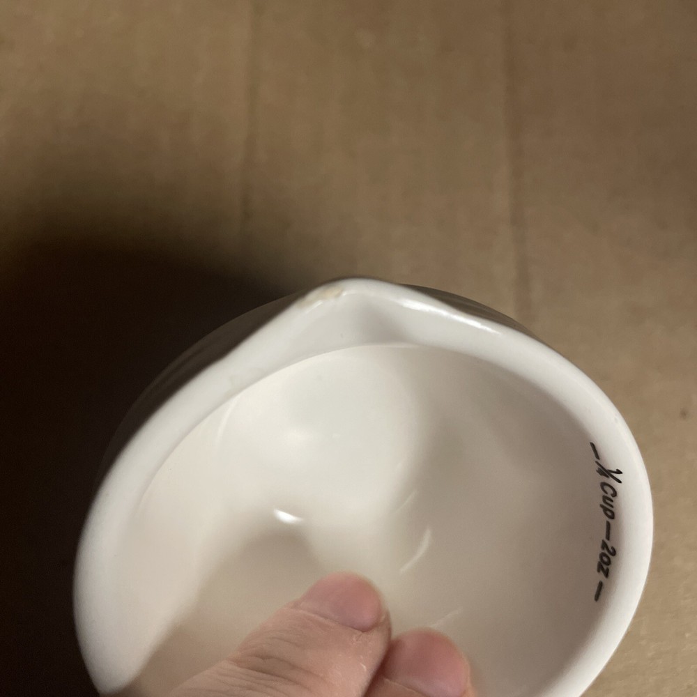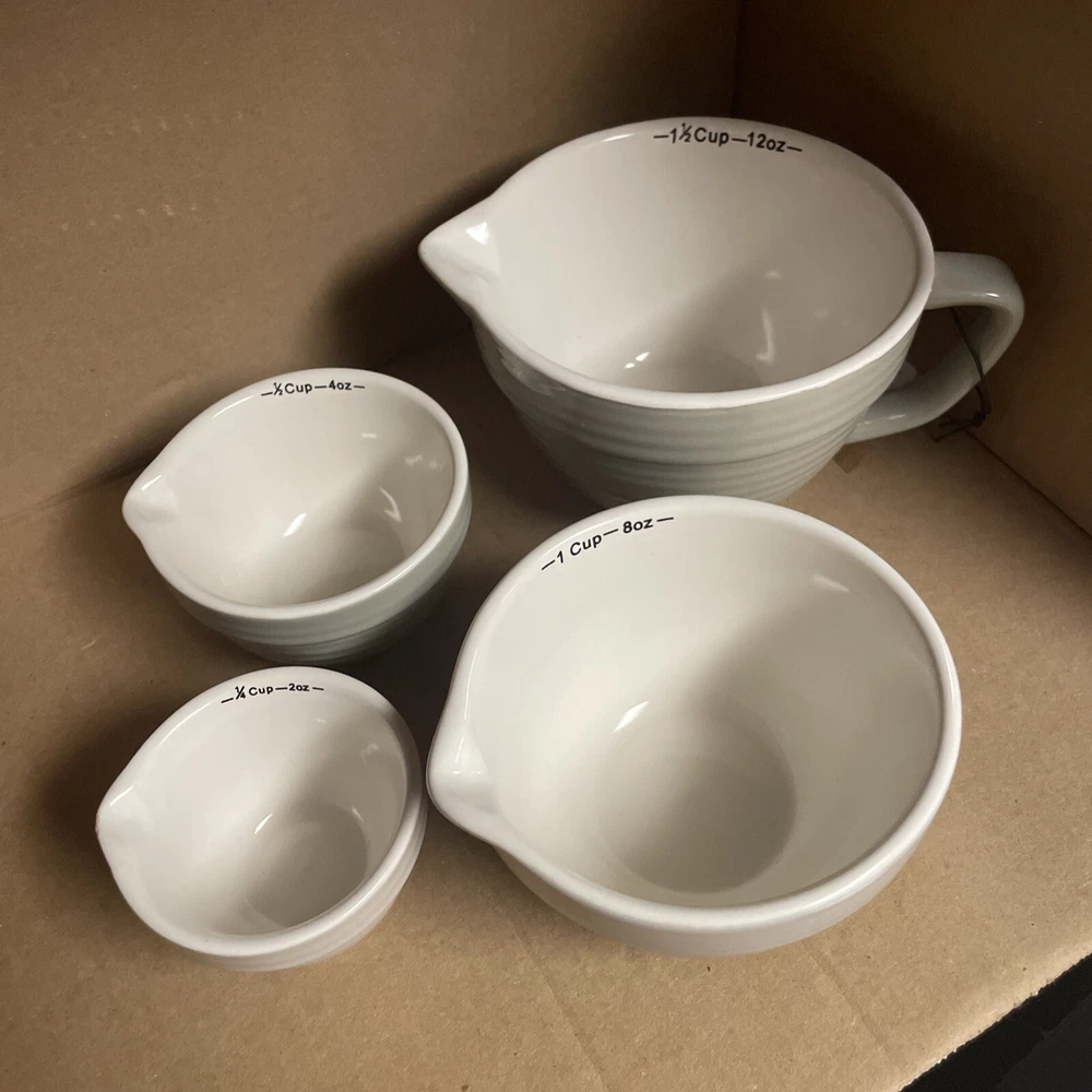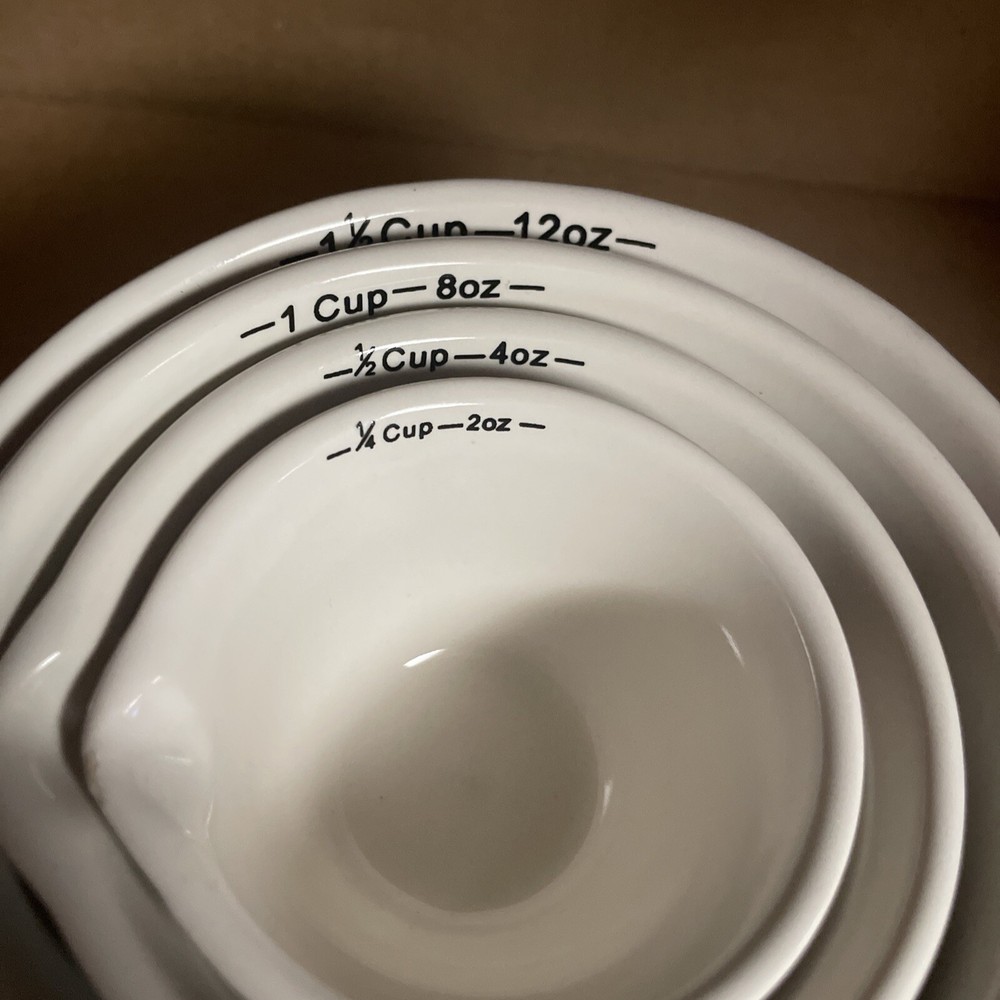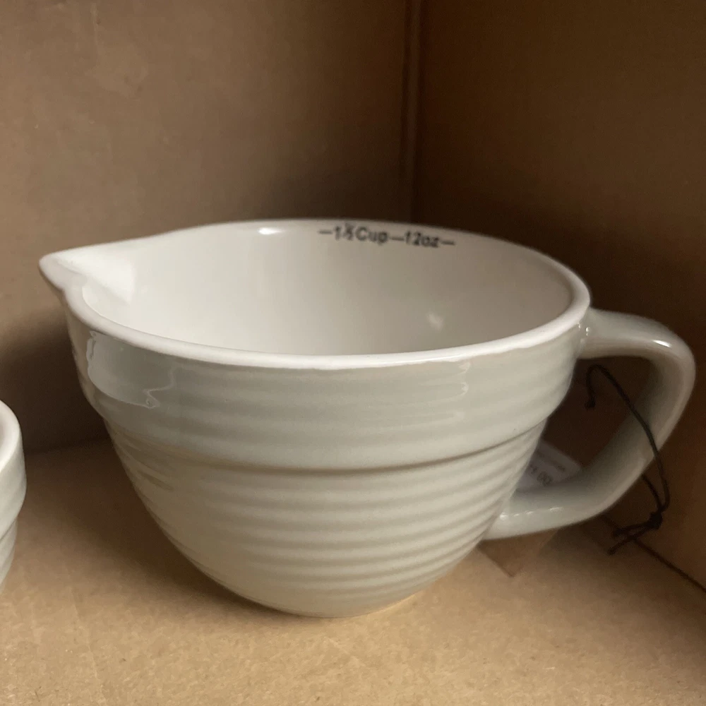 Upgrade your kitchen with this Creative Co-Op Stoneware Bowl Shaped Stackable Measuring Cups Set of 4 in Grey. These ceramic measuring cups are perfect for all occasions and feature a shape that allows them to be stacked for easy storage. With a weight of 1.8 lbs, these measuring cups are durable and offer multiple capacities for all your measuring needs. The set includes four measuring cups and is ideal for anyone who loves to cook or bake. These measuring cups are made in China and are a great addition to your kitchen tools and gadgets collection. The grey color is perfect for any kitchen décor, and the set is sure to impress your guests. Get your hands on this must-have measuring cup set today! New with tags. Never used. Small defect in glaze of ceramic (see photos).