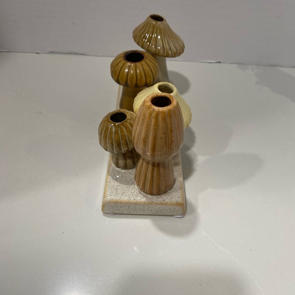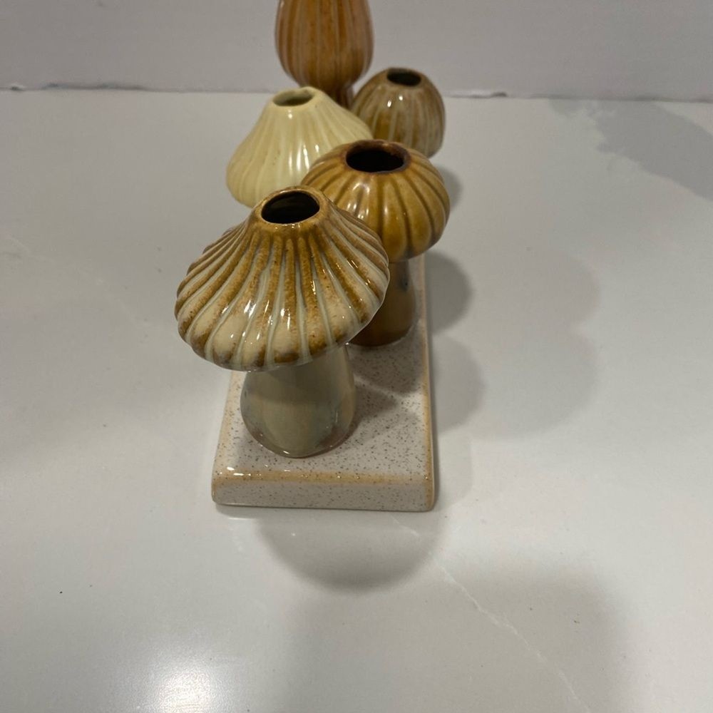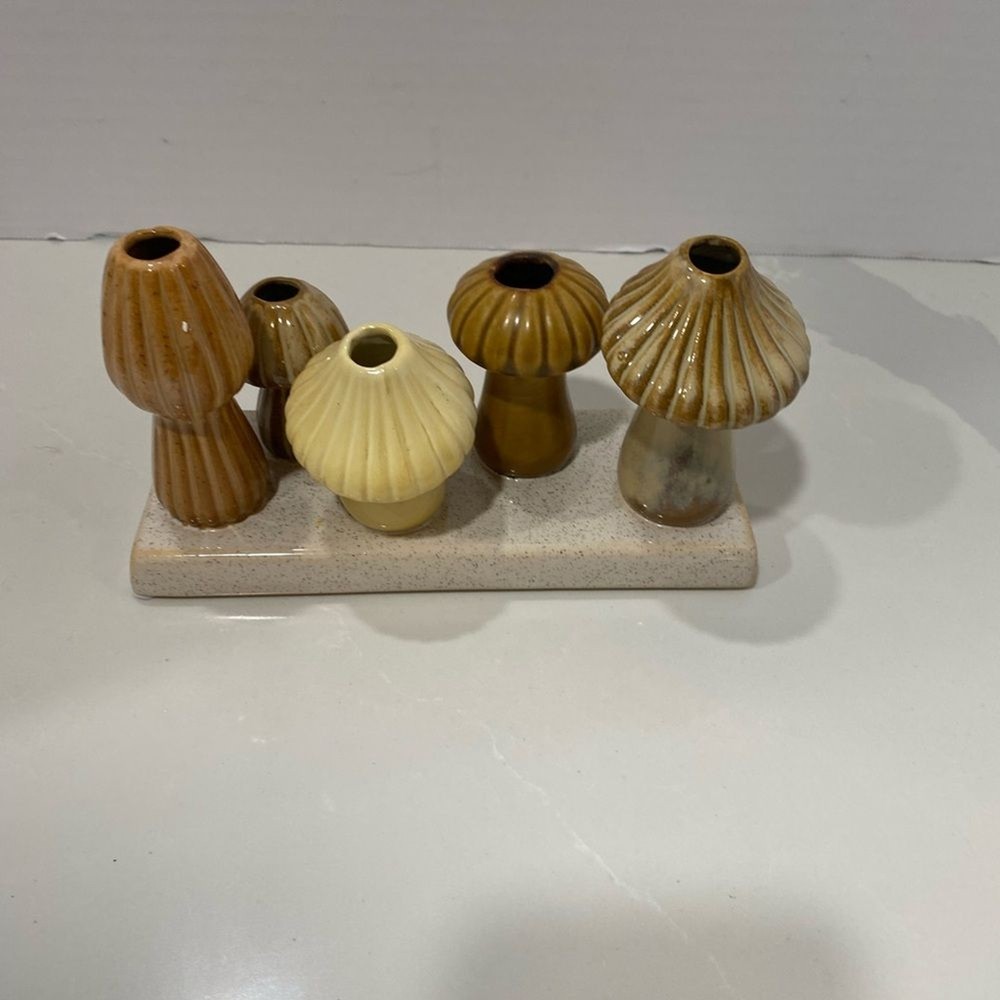 Enhance your home decor with this charming stoneware mushroom vase set. Featuring a delightful mix of brown, cream, and tan hues, these vases add a touch of nature-inspired elegance to any space. 7 1/2” L x 4” H New
