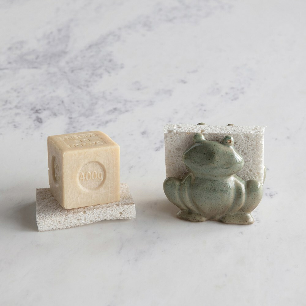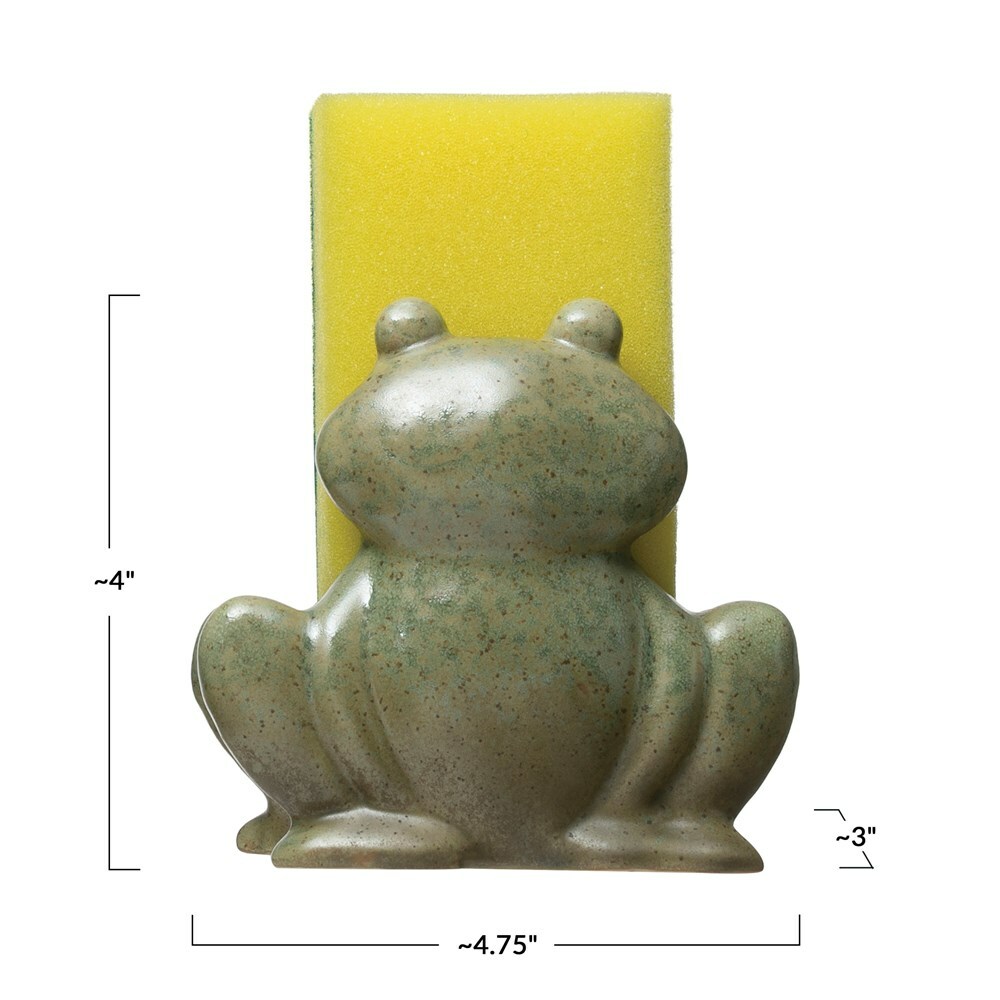 Creative Co-Op Frog Sponge Holder Approximate size: 4"H x 4 3/4"L x 3"W....see picture Frog has a green reactive glaze finish so each one will be slightly different Brand new Please look carefully at all pictures and ask any questions before buying as there are NO RETURNS