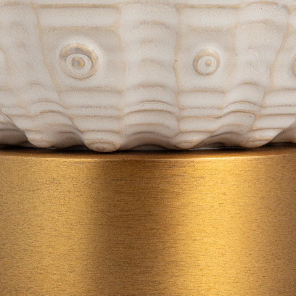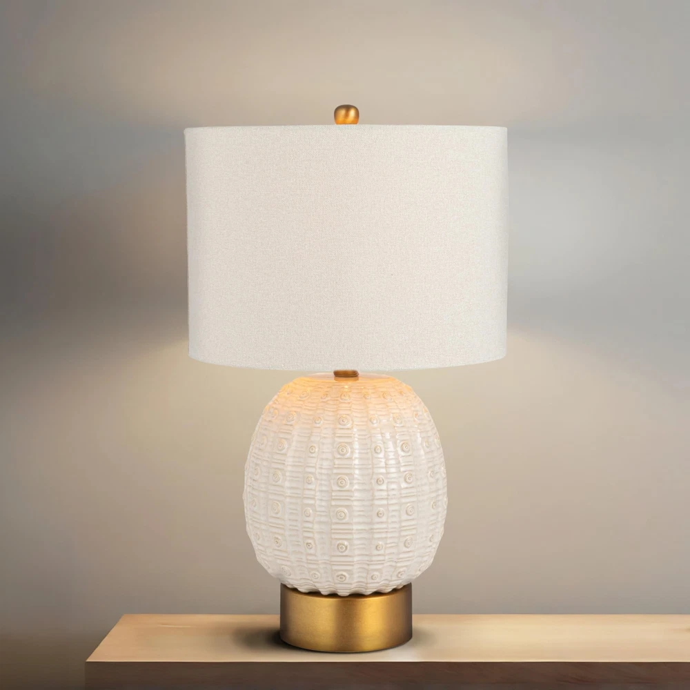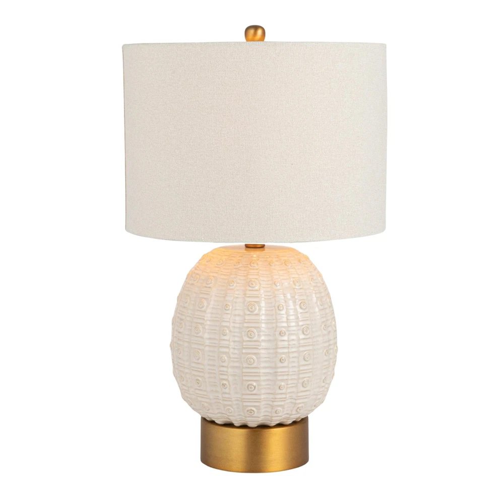Creative Co-Op Stoneware Globe Table Lamp with Cream Crackle Glaze and Natural Linen Shade Product Details Finish Type: Brushed Base Material: Metal Bulb Base: E26 Product Dimensions: 14"D x 14"W x 24"H Item Weight: 7.7 Pounds Finish Type: Brushed Base Material: Metal Bulb Base: E26 Product Dimensions: 14"D x 14"W x 24"H Item Weight: 7.7 Pounds Lamp Type: Table Lamp Shade Color: Natural Shade Material: Linen Switch Type: Rotary Style: French Country Brand: Creative Co-Op Color: Cream Special Feature: Portable Light Source Type: LED Material: Stoneware, Linen, Iron Room Type: Bedroom, Living Room Power Source: Corded Electric Shape: Round Number of Light Sources: 1 Included Components: Shade Is Waterproof: False Mounting Type: Tabletop Wattage: 100 watts Number of Items: 1 Lighting Method: Incandescent Indoor/Outdoor Usage: Indoor Specific Uses For Product: Decoration Installation Type: Tabletop Voltage: 1.3E+2 Volts Base Diameter: 14 Inches Is Cordless?: No UPC: 191009728269 Age Range (Description): Adult Manufacturer: Creative Co-Op Shade Height: 24 Inches Item Weight: 7.7 pounds Country of Origin: China Item model number: EC1857 Finish types: Brushed Warranty Description: No warranty. Batteries required: No Globe-shaped stoneware base with a seashell-inspired design. Ideal for coastal, modern farmhouse, transitional, and French country design aesthetics. Metal base in a brass finish adds warmth and complements the ceramic design. Durable ceramic construction ensures long-lasting beauty and quality. 14.0"L x 14.0"W x 24.0"H Bring coastal elegance to your home with this Stoneware Globe-shaped Table Lamp, featuring a cream crackle glaze and a sculpted details inspired by the curves of a seashell. This artistic lamp blends coastal, farmhouse, and French country aesthetics, offering both beauty and function. The brass-finish base adds a touch of warmth and sophistication, while the linen shade provides a soft, diffused light. Perfect for living rooms, bedrooms, or entryways, this table lamp is a stylish and serene accent piece that enhances any space with its texture and subtle sea-inspired design.