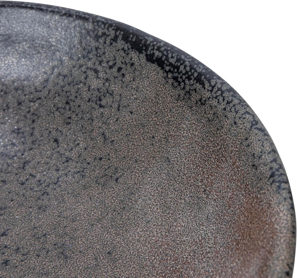 This boho-inspired serving bowl features an organically-shaped stoneware silhouette with a sculptural base and handle, finished in a natural variating reactive glaze Display this artisanal bowl atop a console table as a standalone accent, fill with dried botanicals, or use as a unique serving dish at a gathering Bowl is food safe, dishwasher safe, and microwave safe Made from 100% stoneware Bowl measures 8 inches Diameter x 3.6 inches H