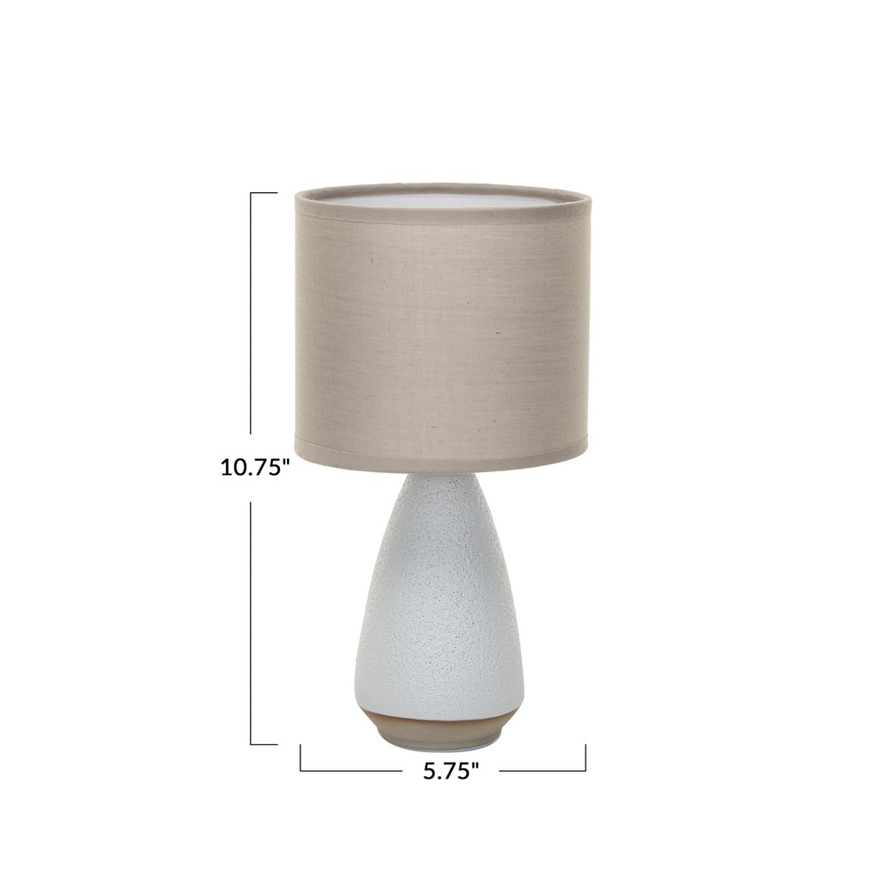 Creative Co-Op Stoneware Matte Table Lamp with Linen Shade and Speckled Finish, White Product Details Finish Type: Matte Base Material: Stoneware Bulb Base: E14 Product Dimensions: 5.88"D x 5.88"W x 10.75"H Item Weight: 0.88 Pounds Finish Type: Matte Base Material: Stoneware Bulb Base: E14 Product Dimensions: 5.88"D x 5.88"W x 10.75"H Item Weight: 0.88 Pounds Lamp Type: Table Lamp Shade Color: Natural Shade Material: Linen Switch Type: In Line Style: Farmhouse Brand: Creative Co-Op Color: White Special Feature: Portable Light Source Type: LED Material: Stoneware, Linen Room Type: Office, Bedroom, Living Room Recommended Uses For Product: Decoration Power Source: Corded Electric Shape: Round Controller Type: touch Number of Light Sources: 1 Connectivity Technology: Inline Included Components: Shade Is Waterproof: False Mounting Type: Tabletop Wattage: 25 watts Number of Items: 1 Lighting Method: LED Control Method: Touch Indoor/Outdoor Usage: Indoor Installation Type: Tabletop Number of Pieces: 1 Voltage: 25 Volts (AC) Is Cordless?: No UPC: 191009628644 Manufacturer: Creative Co-Op Item Weight: 14.1 ounces Country of Origin: China Item model number: DF8768 Finish types: Matte Warranty Description: No warranty. Batteries required: No A modern and cozy table lamp that features a matte white speckled stoneware base and a natural linen shade A versatile addition to any style, from farmhouse to boho to modern to lodge to coastal Requires 1 25-watt bulb (not included) and has a switch for easy operation Made of stoneware and linen, durable and natural materials that create a warm and inviting ambiance Measures 5.75 inches in diameter and 10.75 inches in height This stoneware table lamp with linen shade, matte white speckled is a beautiful piece for any room. It brings a touch of simplicity and elegance to any space with its matte white speckled stoneware base that has a smooth and textured surface and its natural linen shade that has a soft and woven feel. The stoneware and linen materials are natural and durable, and they create a warm and inviting ambiance when lit. The lamp is versatile and can fit any style, from farmhouse to boho to modern to lodge to coastal. It can also be used in any room, such as the living room, bedroom, office, or study. The lamp requires one 25-watt bulb (not included) and has an inline switch for easy operation. It is easy to keep clean and tidy, and it will make any space more stylish and cozy. The lamp measures 5.75 inches in diameter and 10.75 inches in height, making it suitable for any table or desk.