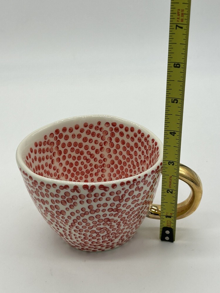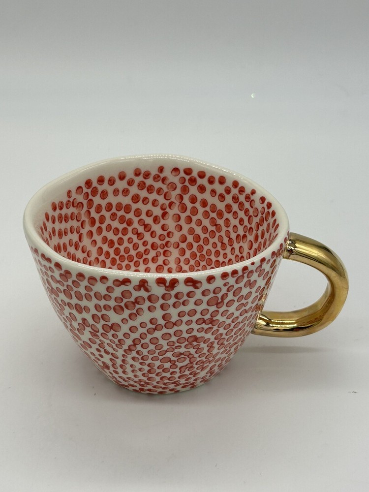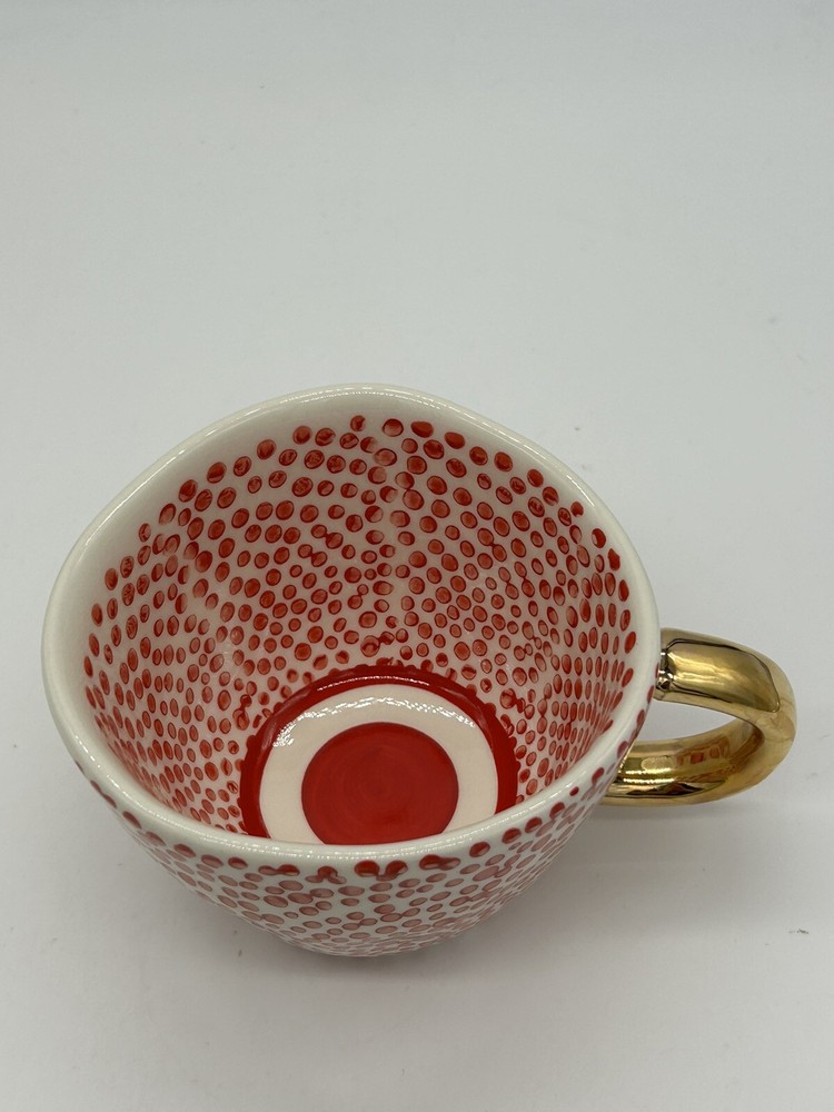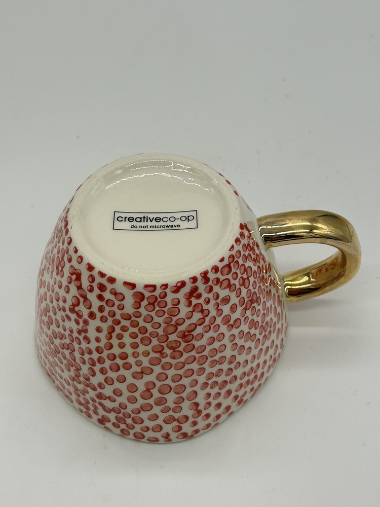 Creative Co-Op Stoneware Mug w/ Red Dots Design & Gold Handle....