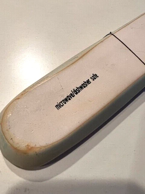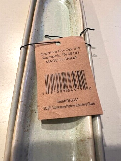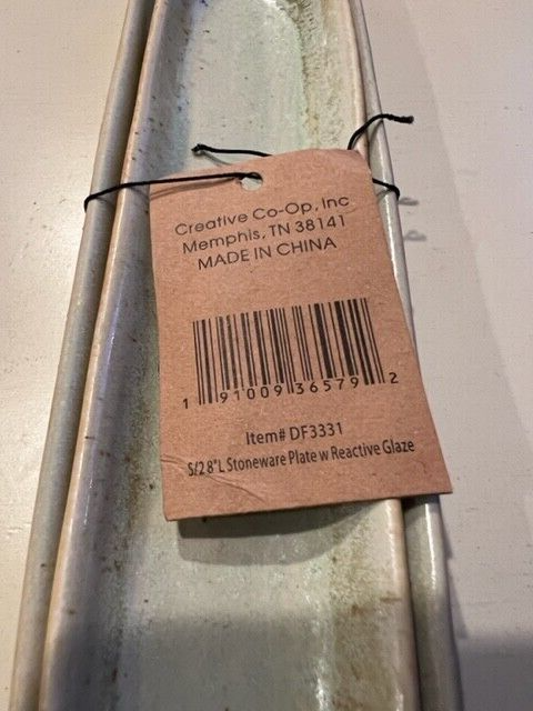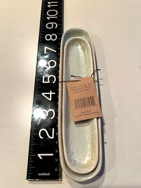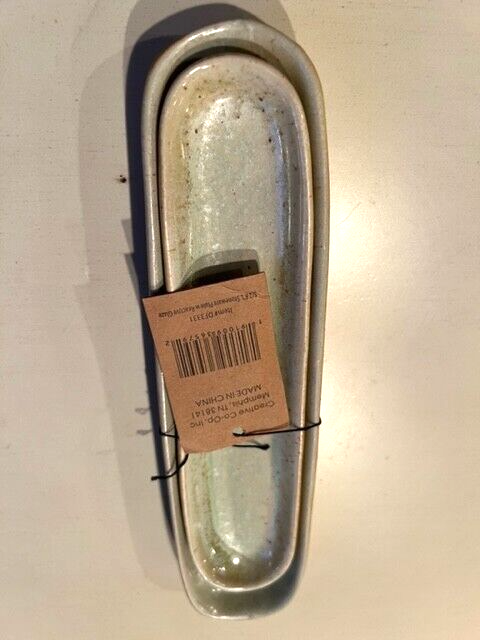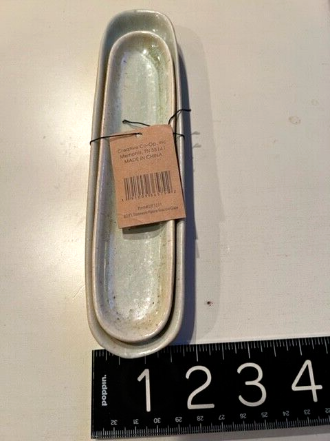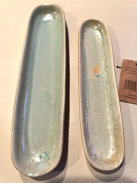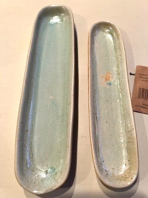 Small stoneware plates are in a naturally variating reactive glaze, no two are the same. Color is a pale green overtones with highlights of a slightly darker green and tan. The larger one is approximately 8” long x 2” wide; the smaller one is 7” inches long x 1-1/2” wide. Perfect for olives or candy. New, never used with no chips or cracks. I have two sets available if interested.