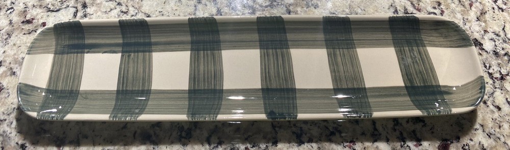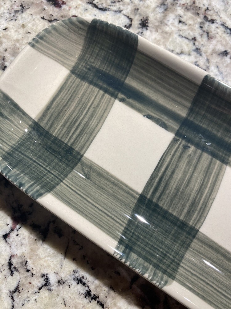 This Creative Co-Op stoneware tray is perfect for serving up all your favorite charcuterie, cheese, and appetizers. The green plaid design adds a touch of rustic charm, while the glossy finish gives it a sleek and modern look. Crafted from durable stoneware, this tray measures 16 inches in length, 4 inches in width, and just .75 inches in height. It's oven, microwave, and dishwasher safe, making it perfect for everyday use. Whether you're hosting a dinner party or just enjoying a casual meal at home, this tray is sure to impress.