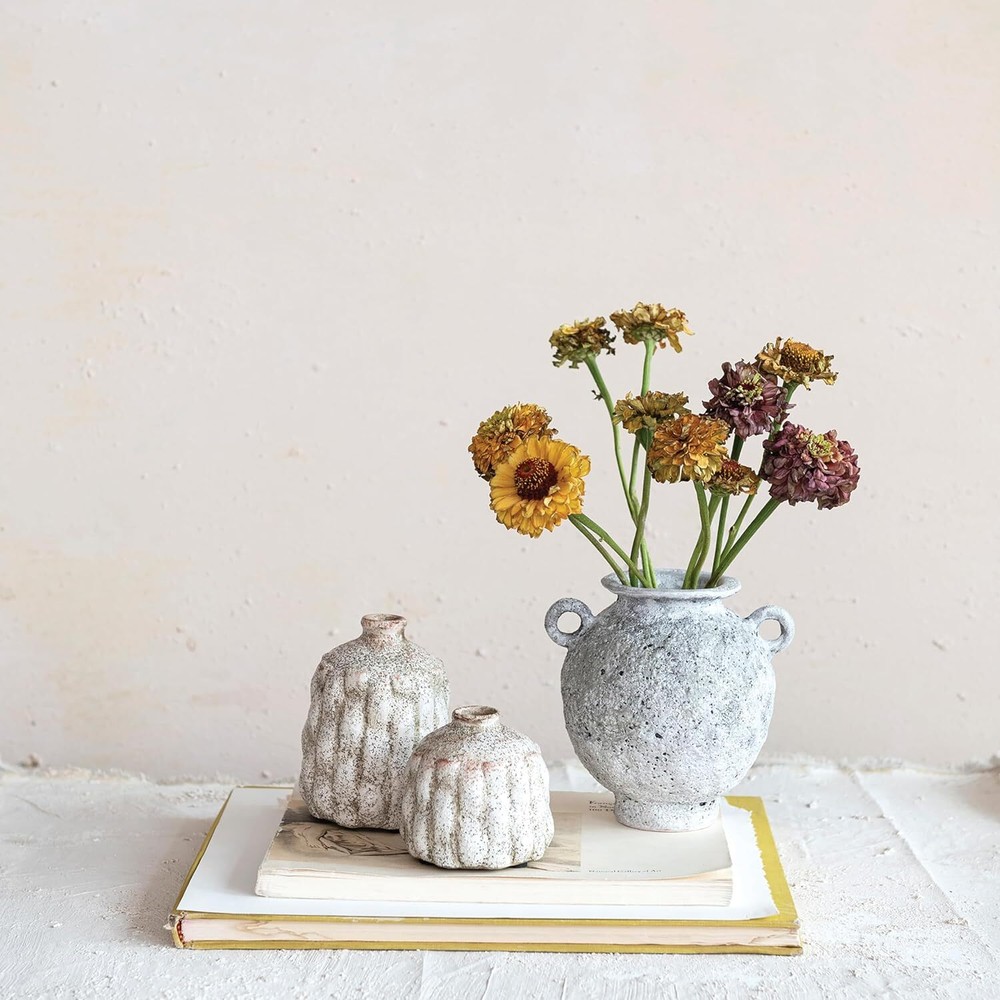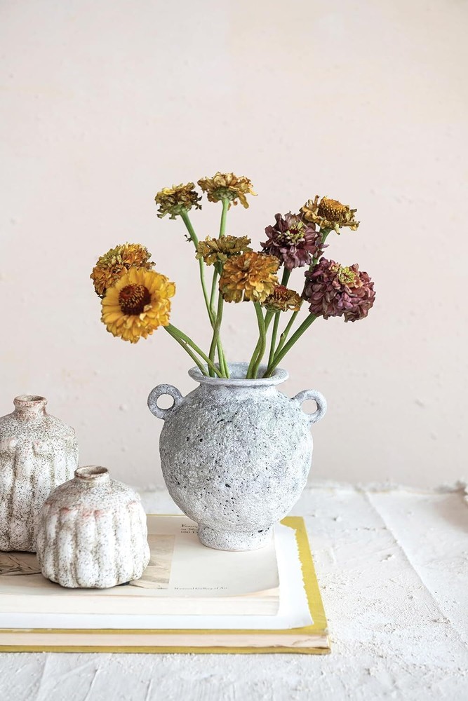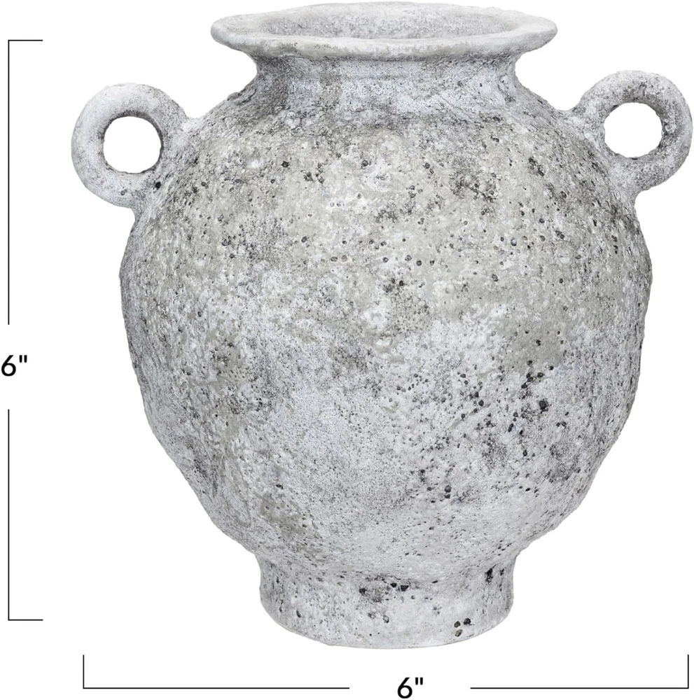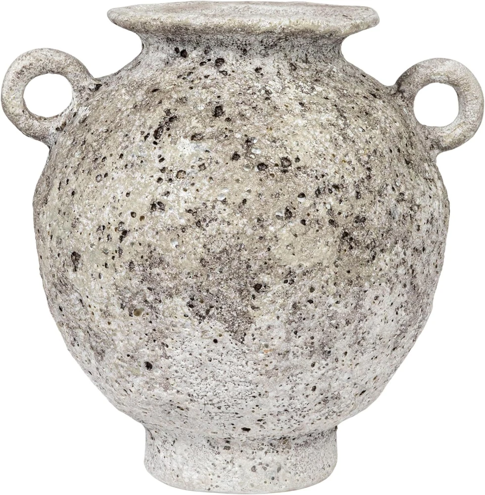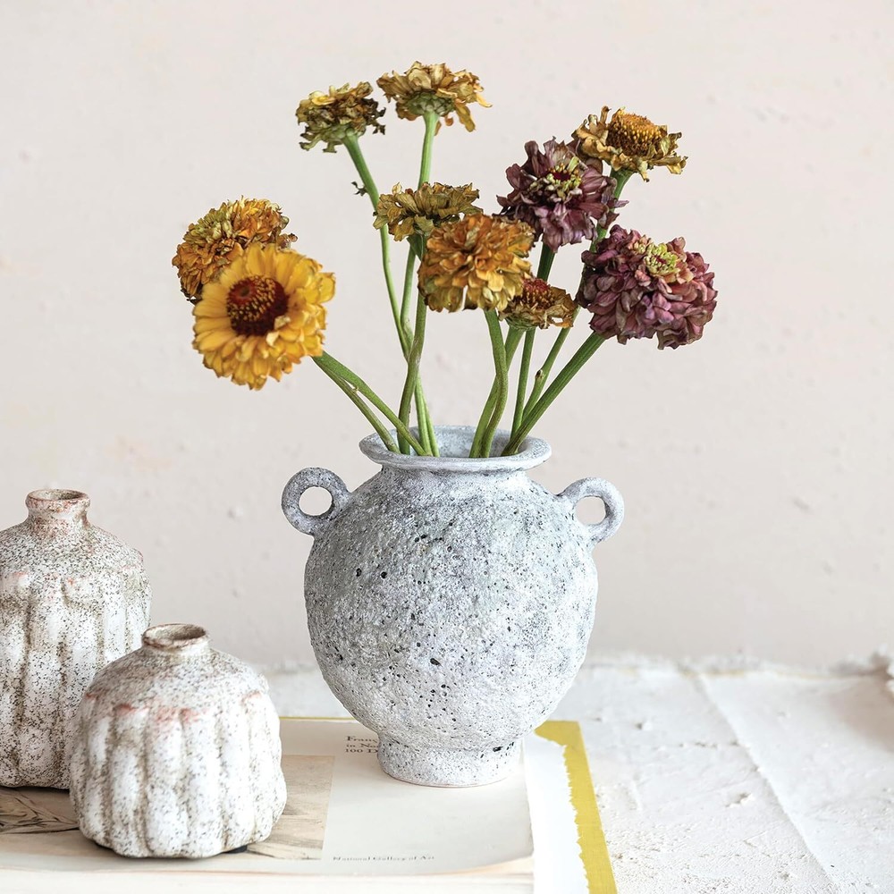 Creative Co-Op Stoneware Vase with Handles Distressed Reactive Gray Product Details Material: Stoneware Color: Gray Brand: Creative Co-Op Product Dimensions: 6.13"L x 5.5"W x 6.13"H Shape: Round Style: French Country Special Feature: With Handle Pattern: Solid Theme: Botanical Recommended Uses For Product: Decorative Room Type: Living Room Number of Pieces: 1 Occasion: Women, Mother's Day, Wedding, Graduation Item Weight: 1.4 Pounds Installation Type: Freestanding UPC: 191009626992 Manufacturer: Creative Co-Op Item Weight: 1.43 pounds Country of Origin: China Item model number: DF8603 Batteries required: No stylish and unique stoneware vase that has handles and a distressed reactive glaze in matte grey color This vase is suitable for French country, traditional, global, vintage, or coastal style, and can create a sophisticated and elegant look in any space This vase can be used to display fresh or artificial flowers, branches, or greenery, or as a decorative accent on its own Made of stoneware that is durable and easy to clean Measures 6 inches in length, 5.5 inches in width, and 6 inches in height This unique stoneware vase with handles is a stunning example of high-temperature fired ceramic. It features a round shape with two handles and a matte grey color, giving it a vintage and rustic look. The vase is adorned with a distressed reactive glaze, a unique technique that reacts with the clay to create various effects. This unique feature adds character and charm to the vase. It can be used to display flowers, branches, or greenery, or as a decorative accent. Place it on tables, shelves, mantels, or windowsills, and create a cozy and elegant atmosphere in the home. This vase is suitable for various styles, including French country, traditional, global, vintage, or coastal, and can create a sophisticated and elegant look in any space. It's a perfect gift for art and nature lovers.