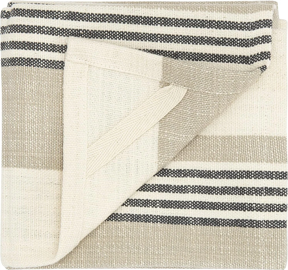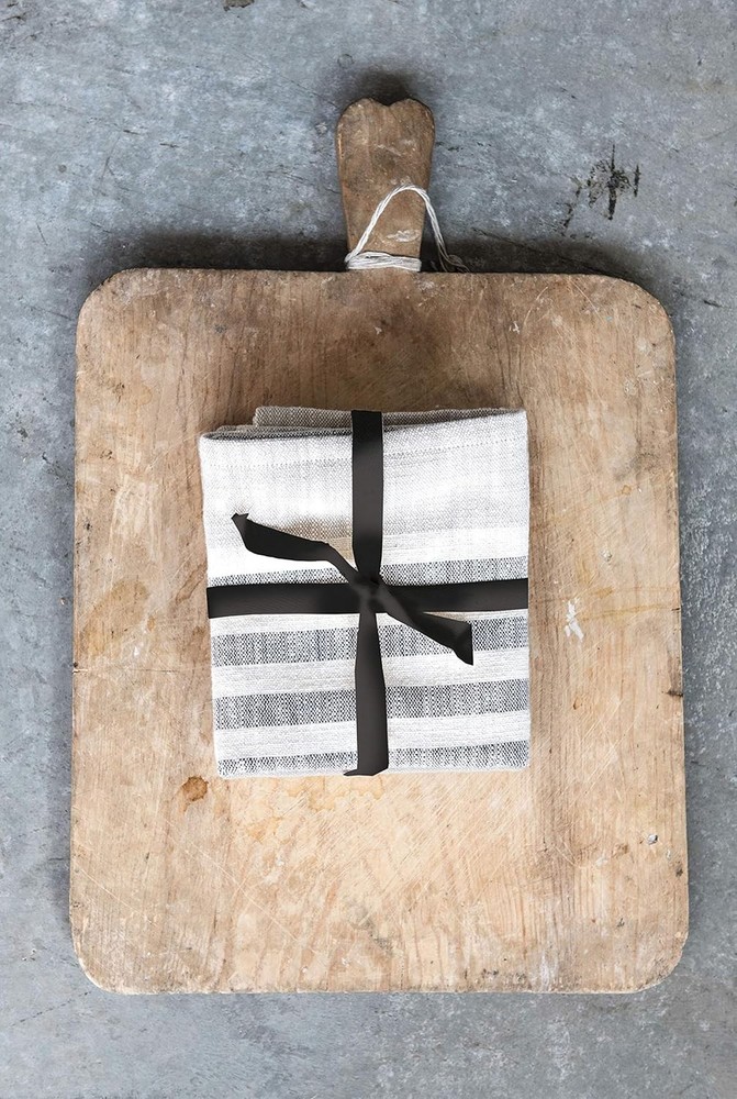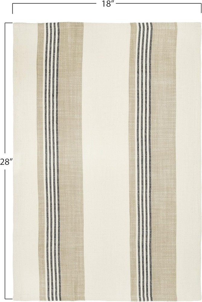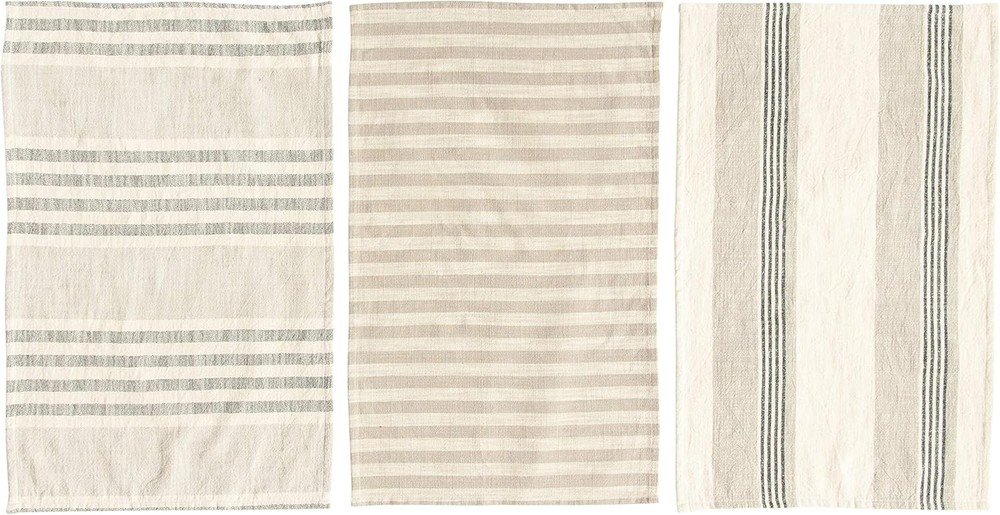 Creative Co-Op Tan & Grey Striped Cotton Tea Towels (Set of 3 Pieces) Product Details Product Dimensions: 28 x 18 x 0.25 inches Item Weight: 3.52 ounces Manufacturer: Creative Co-Op Country of Origin: India Item model number: DF1649 Fabric Type: Cotton Care instructions: Machine Wash Assembly required: No Number of pieces: 3 Batteries required: Yes Cotton Hang on the oven handle for accent Large enough to line a bread basket Dries glass without leaving a mountain of lint behind 28"L x 18"W x .25"H Add this set of tan and grey striped tea towels to the kitchen décor. They are nice and large for lining a bread basket or drying dishes. A wonderful perk that everyone can appreciate is that tea towels dry glasses without leaving a mountain of lint behind.