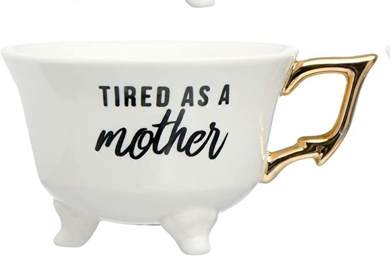 Creative Co-Op Footed Tea Cup "Tired As A Mother" Gold electroplate handle. Measures 3 inches high, and 4 1/4 inches in diameter. Brand New with Tags!